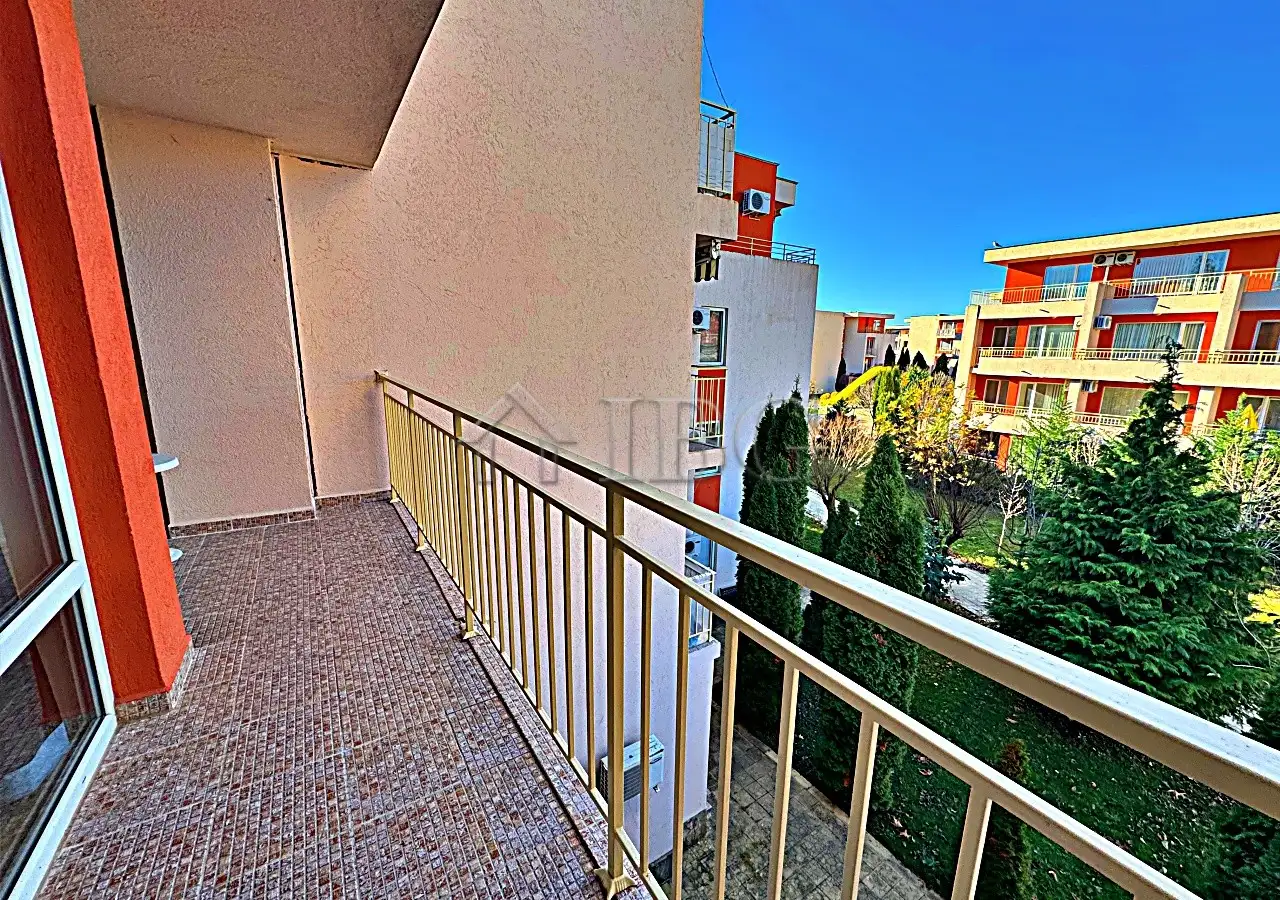 For sale is a one-bedroom apartment, located on the 2nd floor in the well-maintained complex Nessebar Fort Club – right across from the Aqua Park and only a 10-minute walk from the beach and the centre of the resort. The complex is like a resort on its own, offering 6 swimming pools, a seasonal restaurant, combined sport field, mini golf, year round reception and live security, seasonal supermarket. There are 3 big supermarkets nearby – LIDL, MM and Mladost.