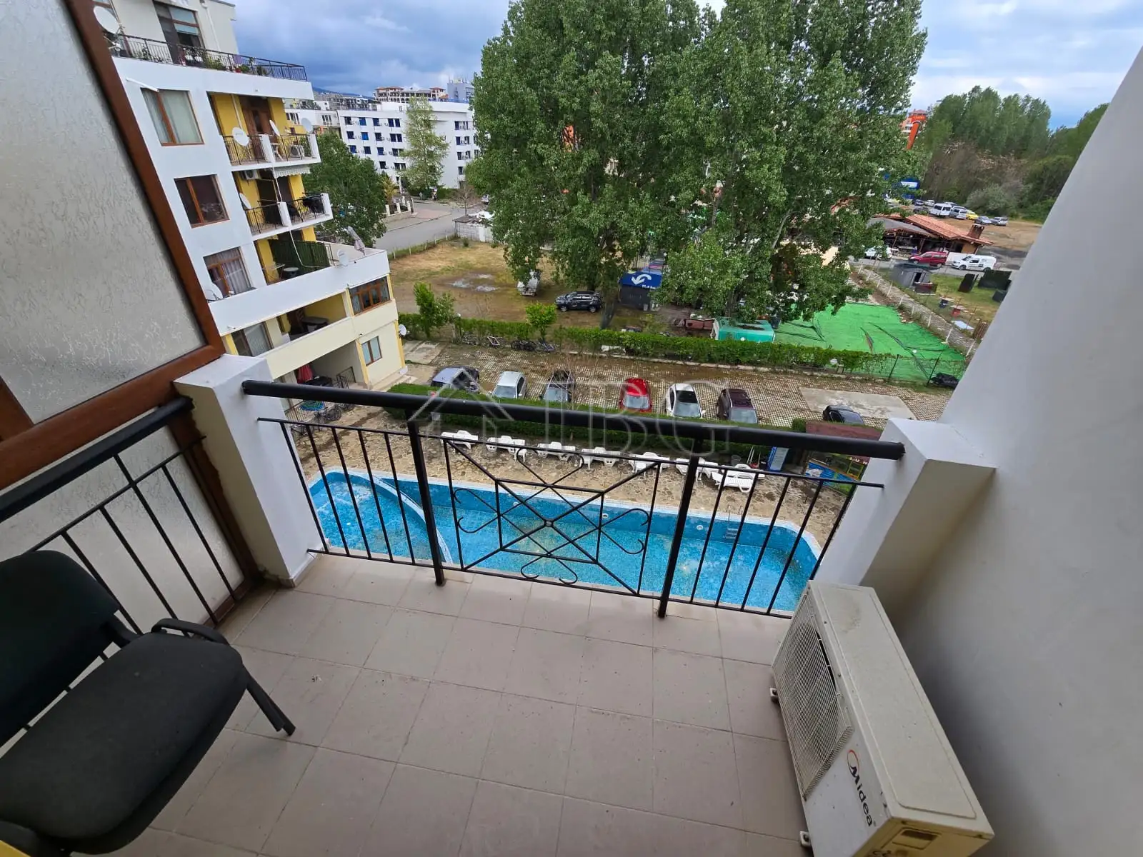 The apartment is with total area of 54 sq.m. and it consists of an entrance hall, a living room with kitchen and dining area, one bedroom, a balcony with pool view and a bathroom with shower, toilet and sink. The balcony is in front of both rooms. It is for sale furnished as shown on the pictures.