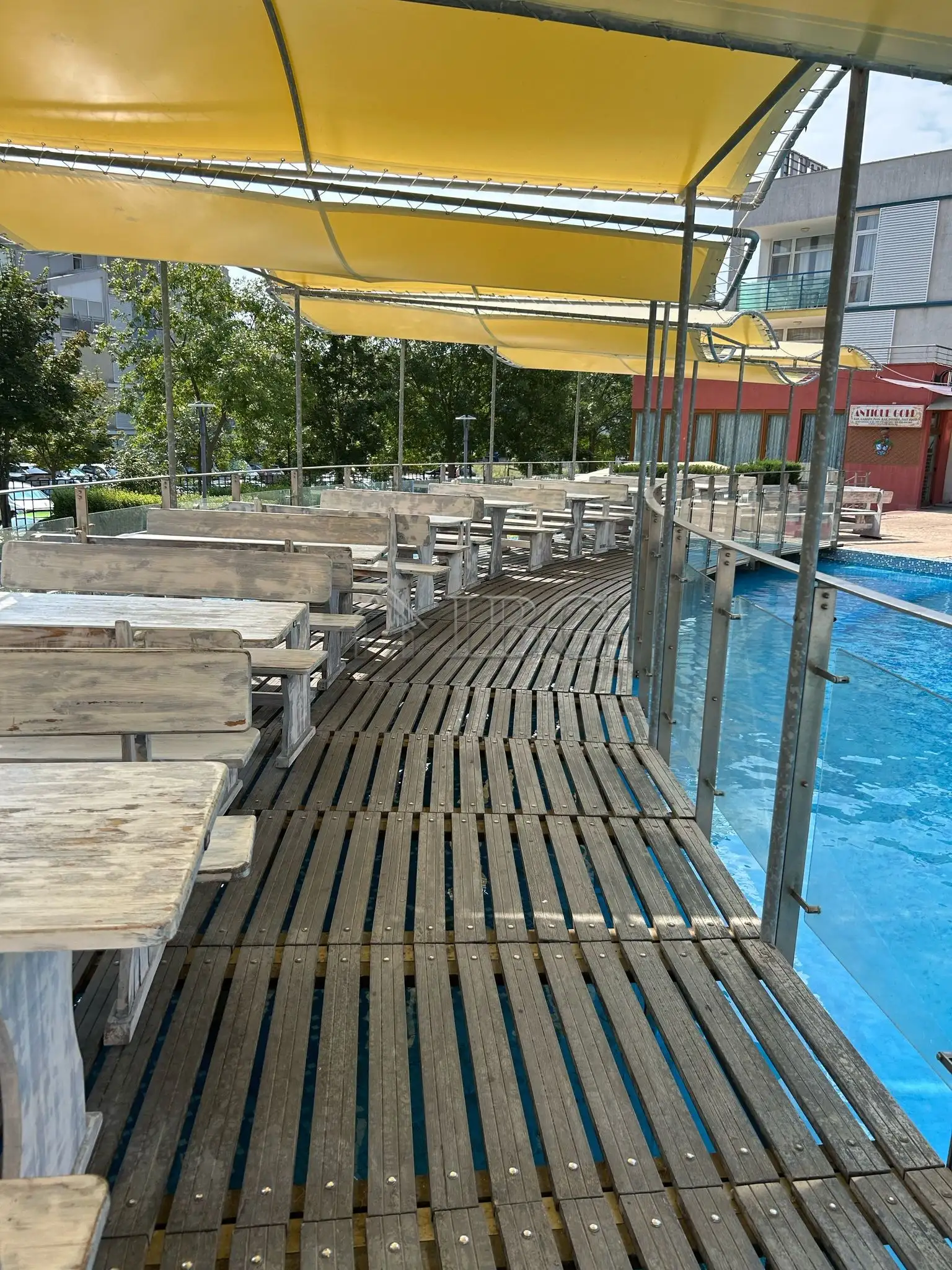 The apartment has a total area of 60 sq.m. and offers a comfortable layout. It consists of a living room with kitchen and dining area, one bedroom, a bathroom, and a large terrace with an awning overlooking the swimming pool – perfect for relaxing during the summer season.