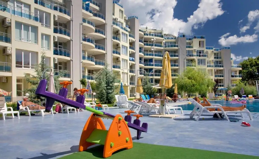 The complex offers excellent on-site facilities: a large swimming pool with a children’s section, areas for sunbathing and relaxation, a children’s playground, a restaurant, a lobby, year-round security, outdoor parking, and professional maintenance provided by the management company.