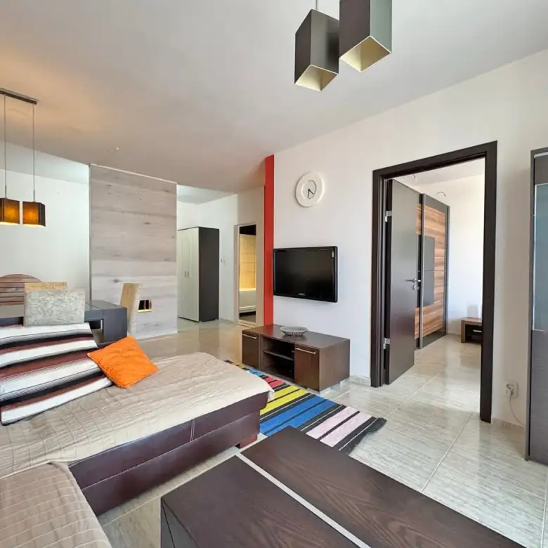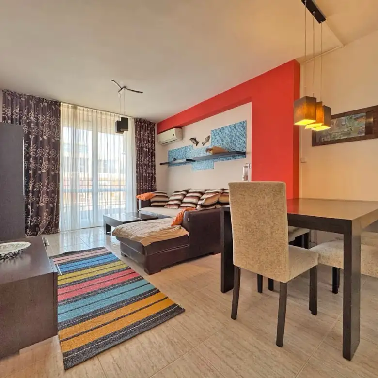 Apartment with one bedroom for sale in St. Sofia Apart complex in Sunny Beach. The apartment is on the 4th floor with an area of 65 sq.m. and offers an entrance hall, a living room with kitchen and dining area, one bedroom, a balcony and a bathroom with a bathtub, toilet and sink. The apartment is in excellent condition and for sale furnished and equipped as it is on the photos.