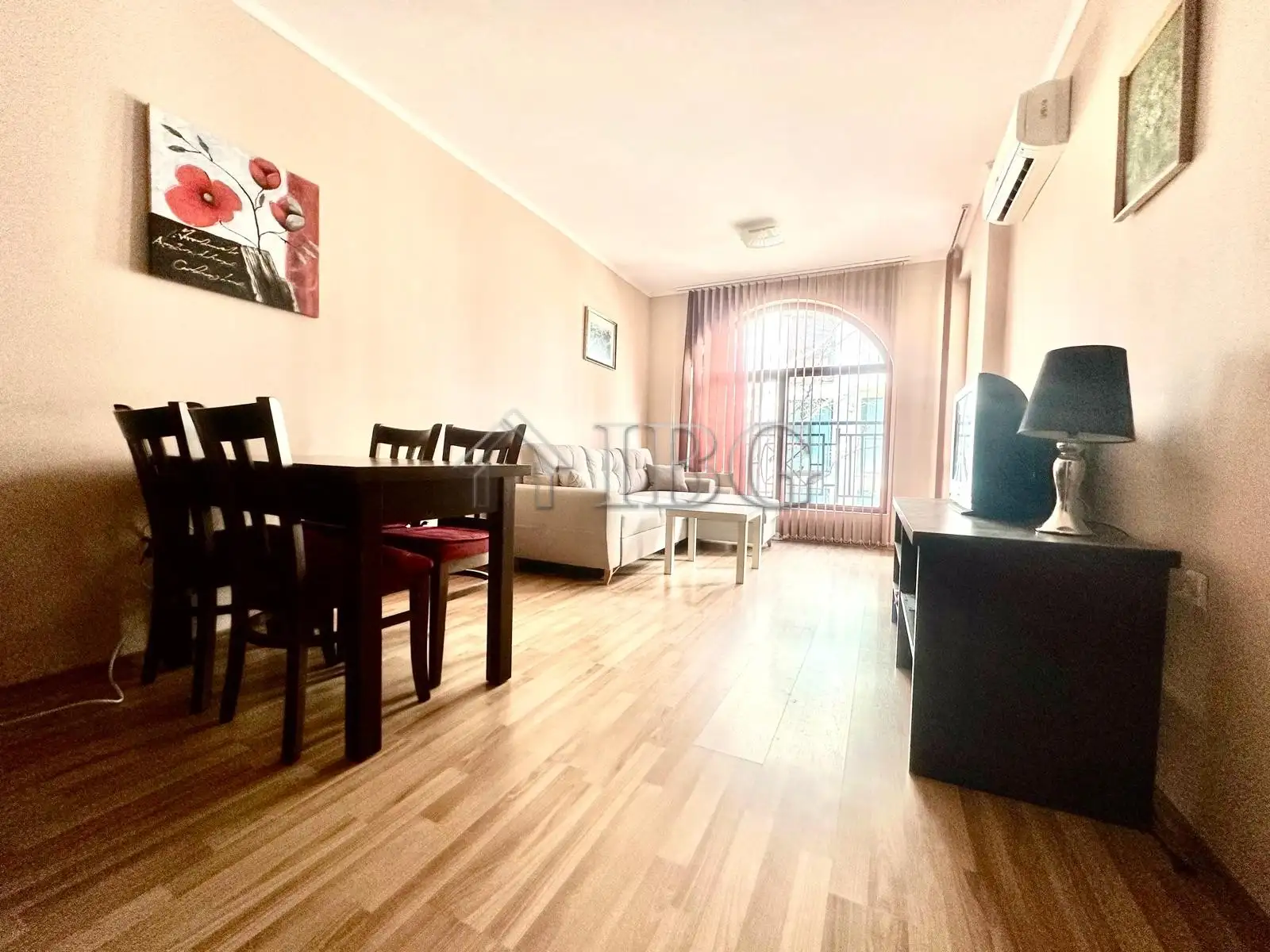 The total size of the apartment sale is 59 sq. m. and it is for sale furnished and equipped. The apartment consists of a living room with kitchen and dining area, a balcony, one bedroom and a bathroom with shower cabin, toilet and sink. The apartment is air-conditioned and ready to use or rent out.