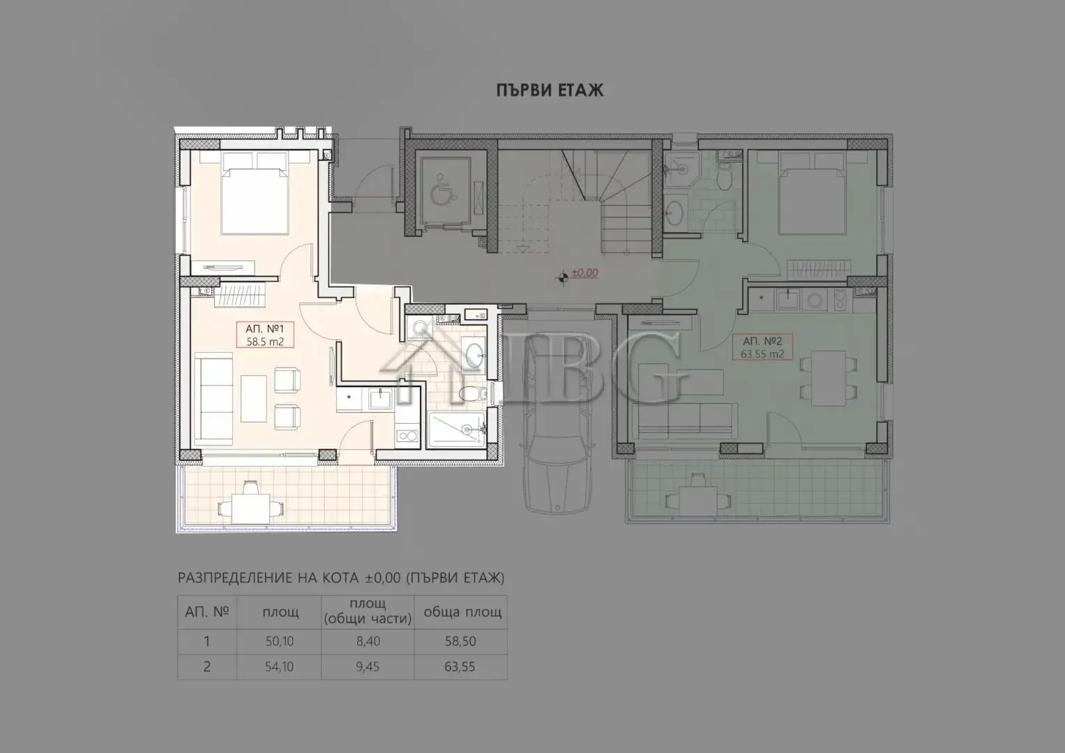 The apartment for sale is on the first floor with total area of 58.50 sq.m. It consists of an entrance hall, a living room with kitchen and dining area, a balcony, 1 bedroom and a bathroom with toilet. There is an option to buy the apartment completely furnished and equipped for a surcharge.