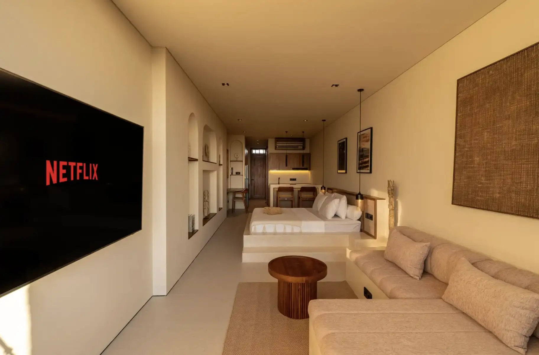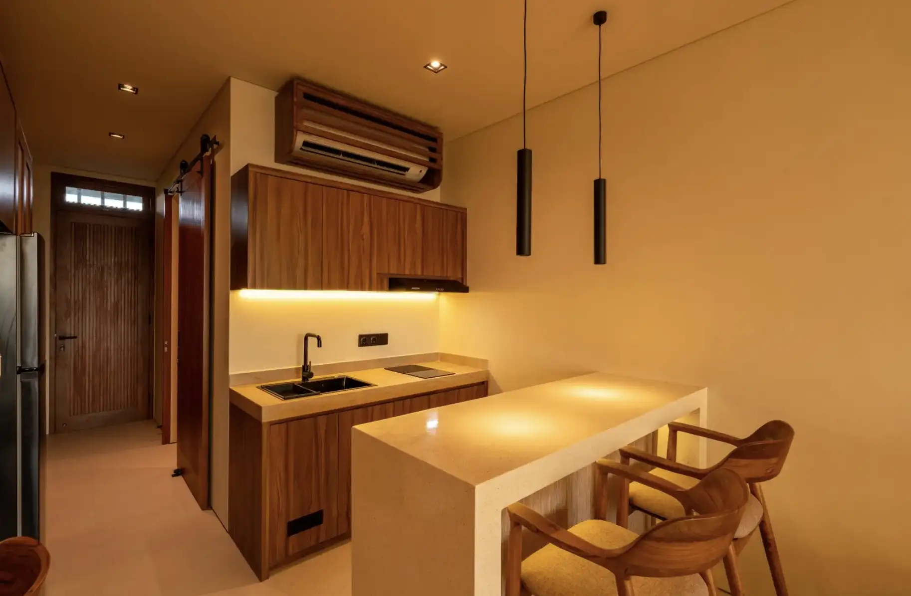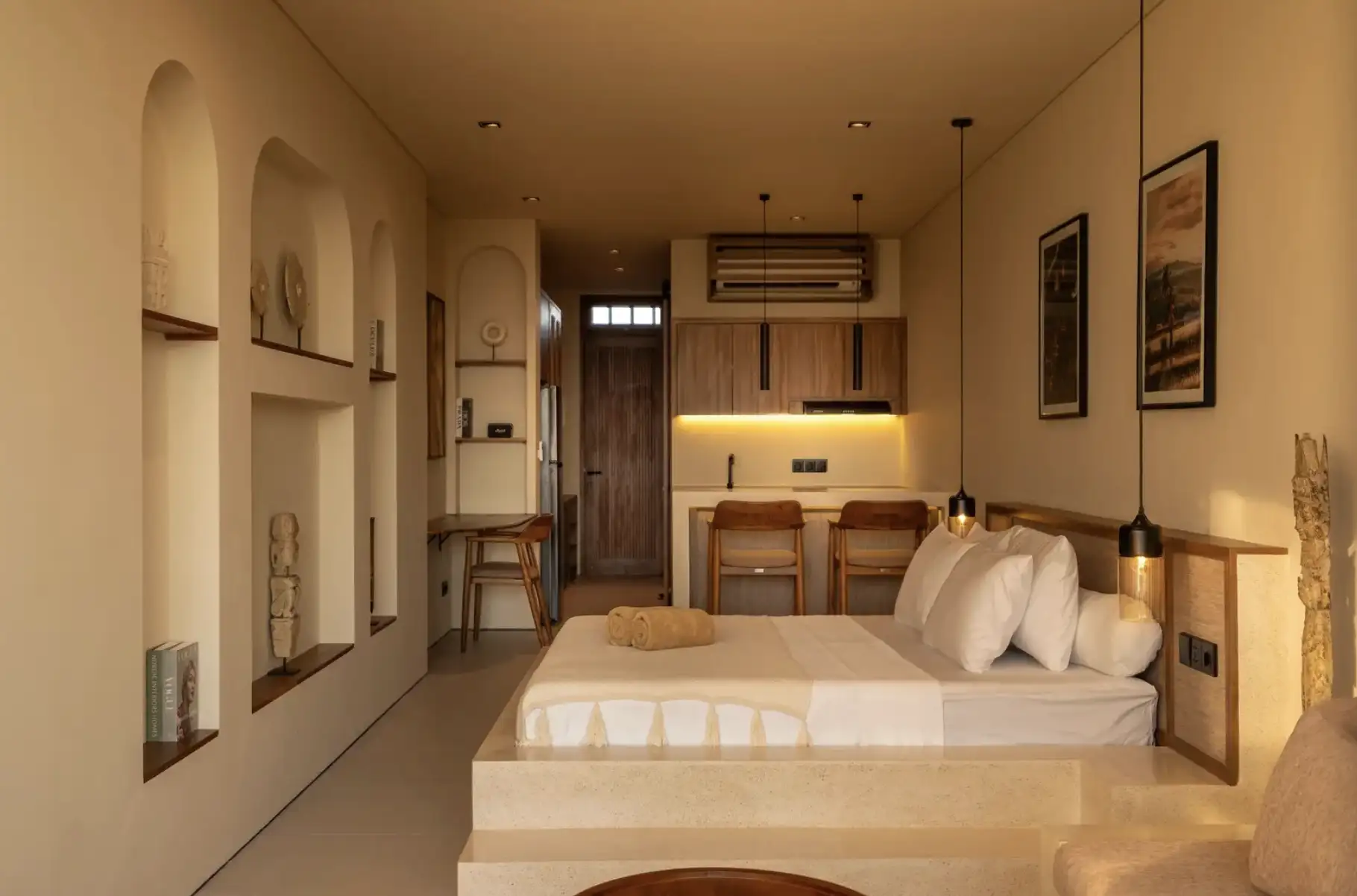 Discover a new level of comfort and convenience with our stylish one-bedroom studio apartments in Tumbak Bayuh. Each unit features a modern kitchen and a private terrace, perfect for enjoying the serene environment and excellent sun conditions with stunning sunset views. Designed with flexible usage in mind, these apartments promise a hassle-free ownership experience, as we manage all your needs at the lowest cost in Bali.