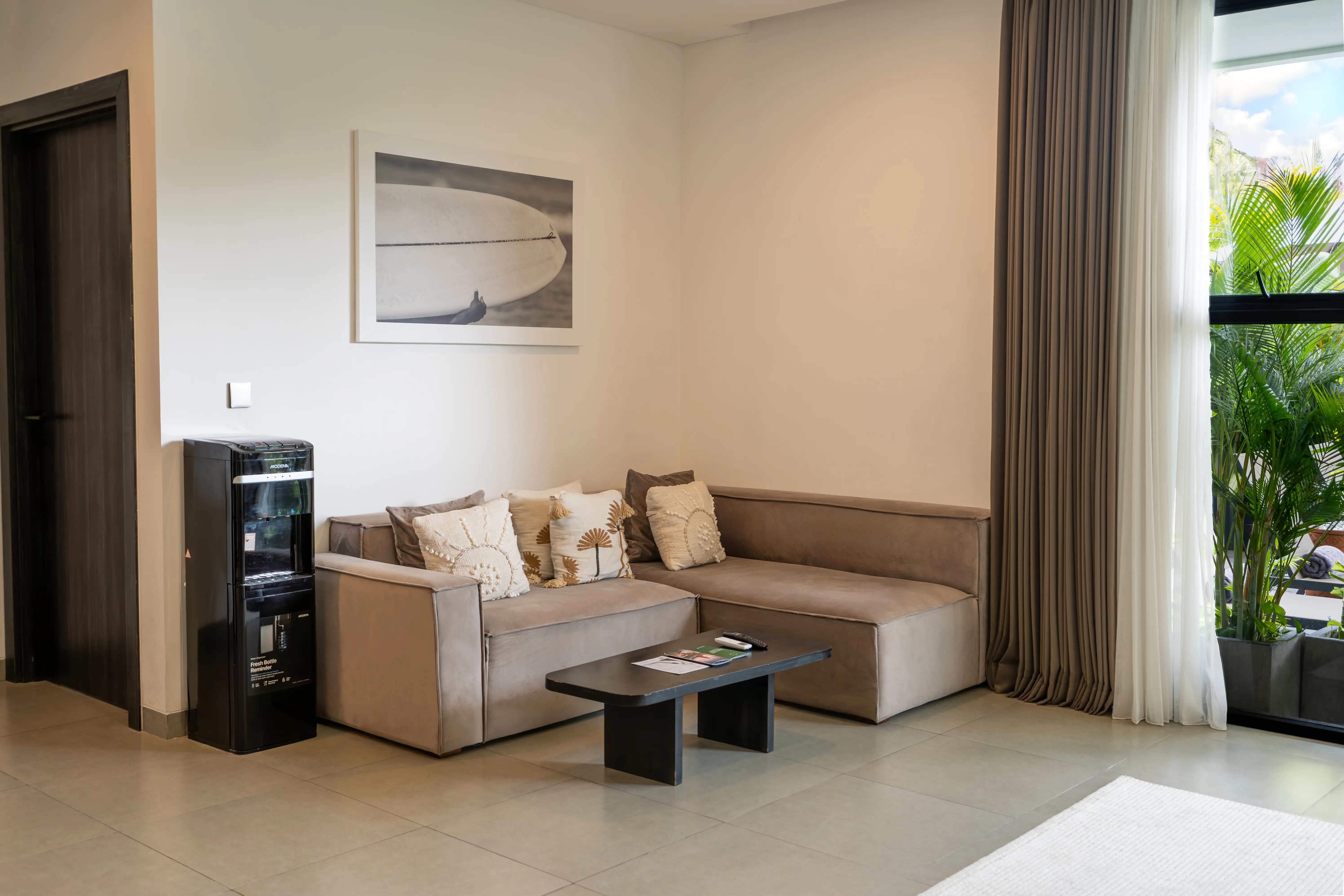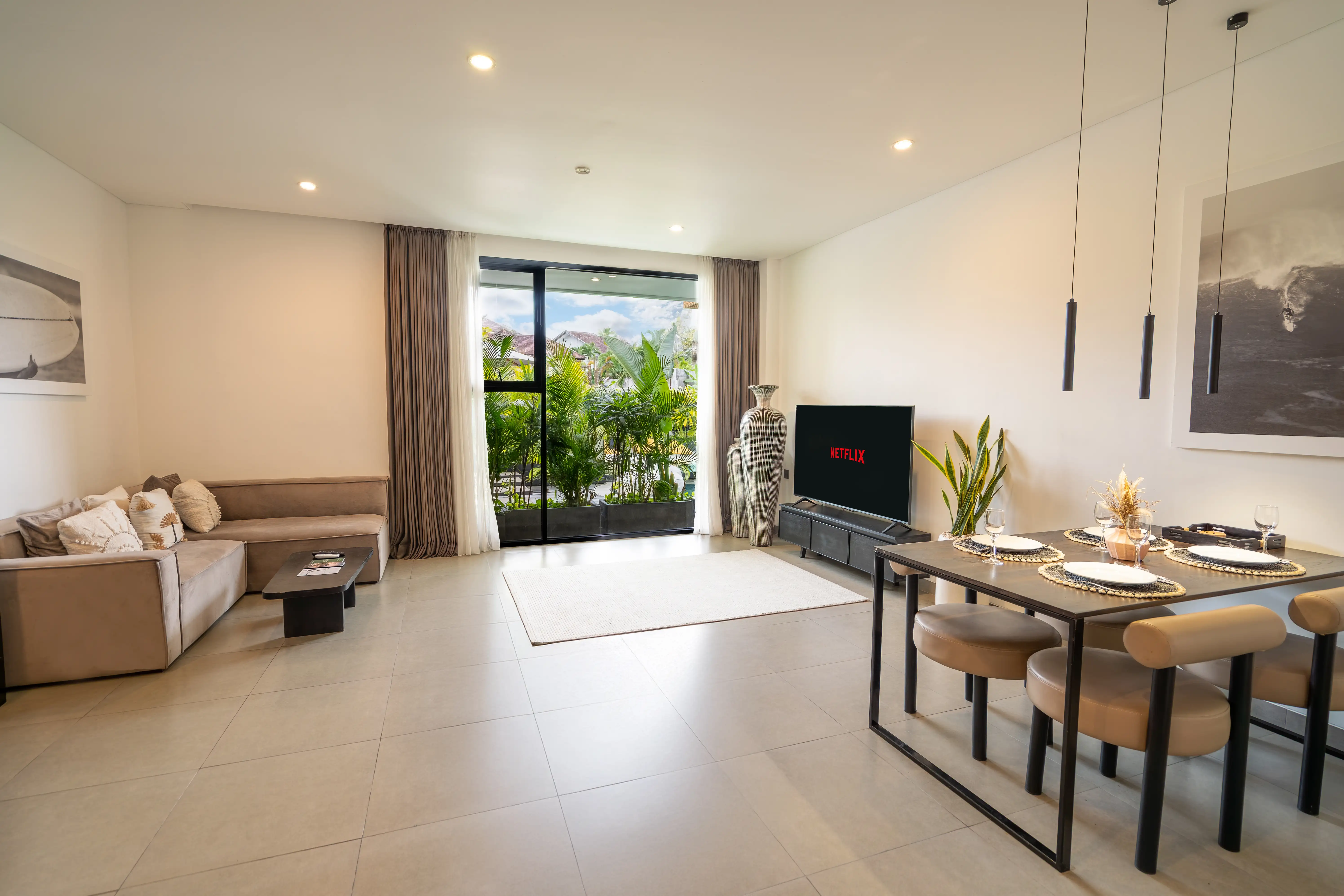 This modern 1-bedroom apartment in Berawa offers a comfortable and stylish living environment in one of Bali’s most sought-after neighbourhoods. The interior is designed with a clean and contemporary feel, featuring an open-plan layout that brings together the living, dining, and kitchen areas. Large sliding glass doors fill the space with natural light and provide a smooth connection to the outdoor greenery. The kitchen comes fully equipped with essential appliances, while the living room includes a cosy sofa setup and a TV for relaxing evenings. Neutral tones, modern furnishings, and thoughtful decor create a warm and inviting atmosphere suitable for both short-term stays and long-term living.