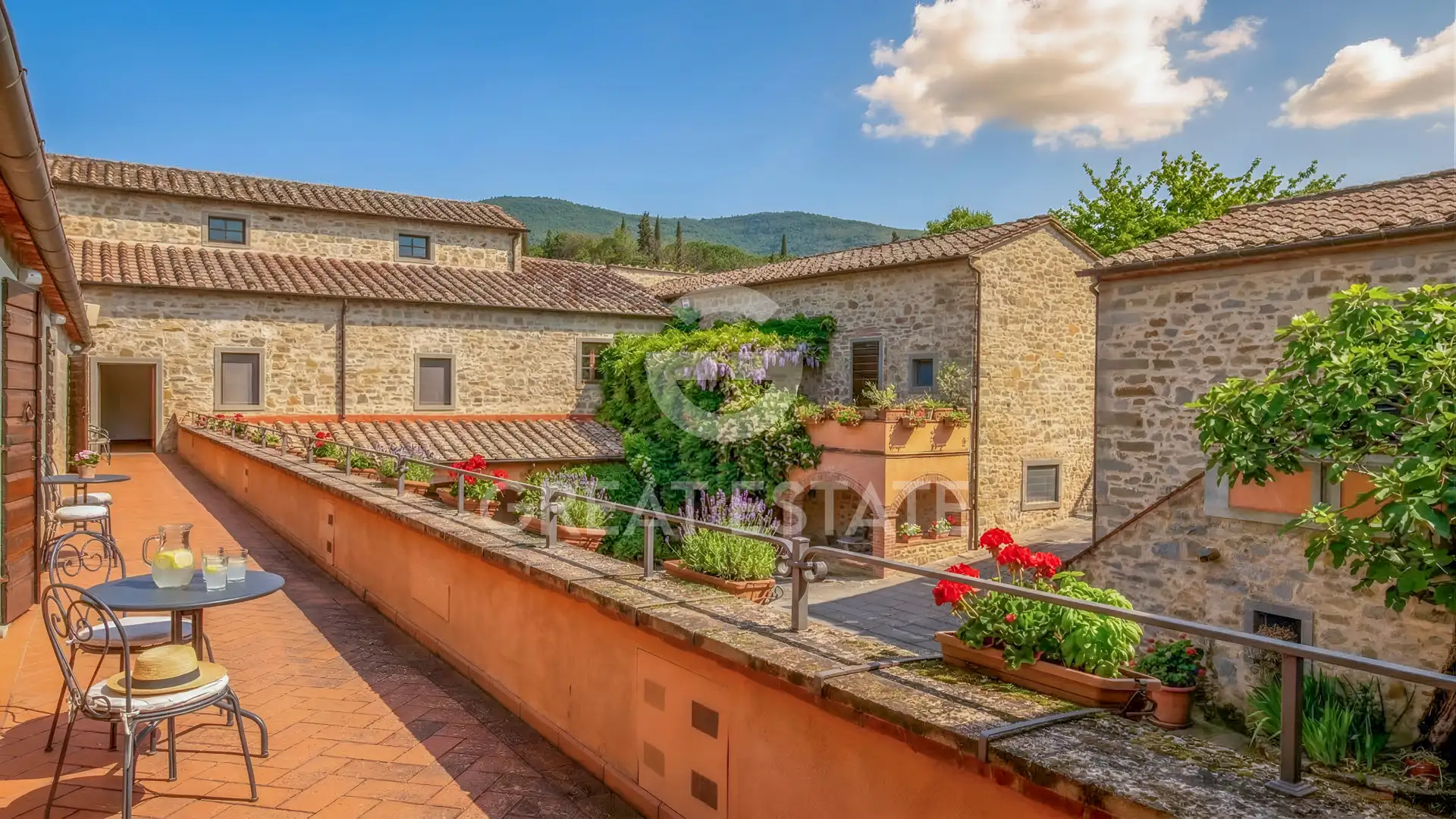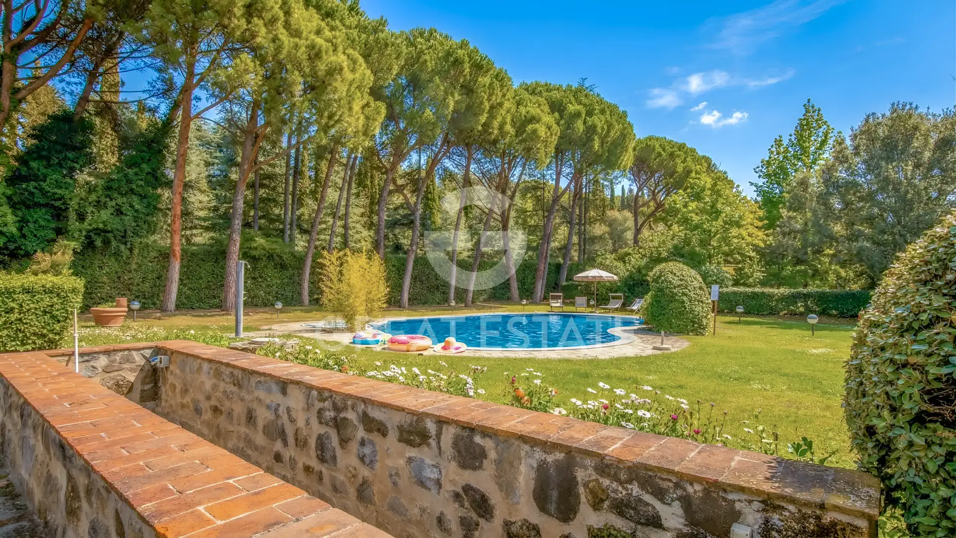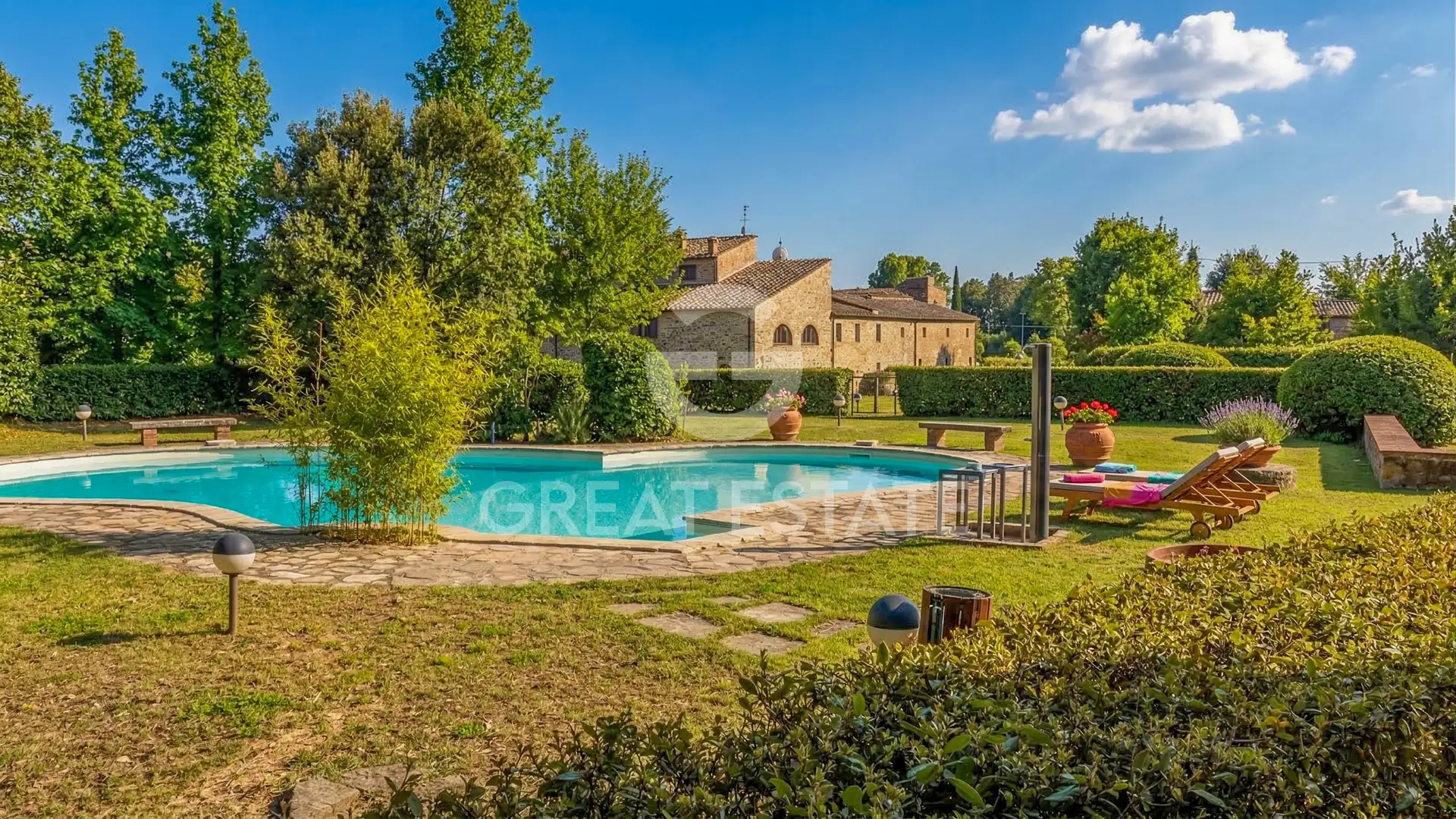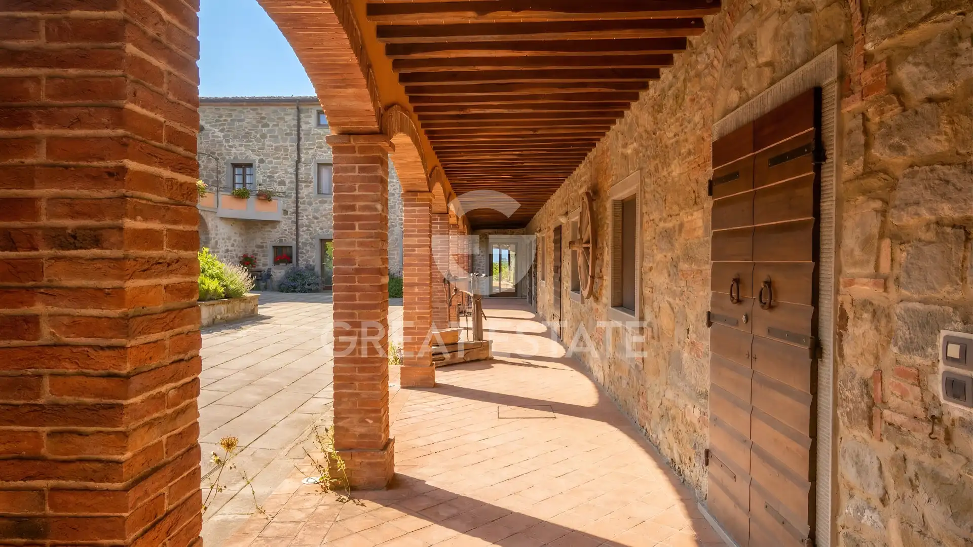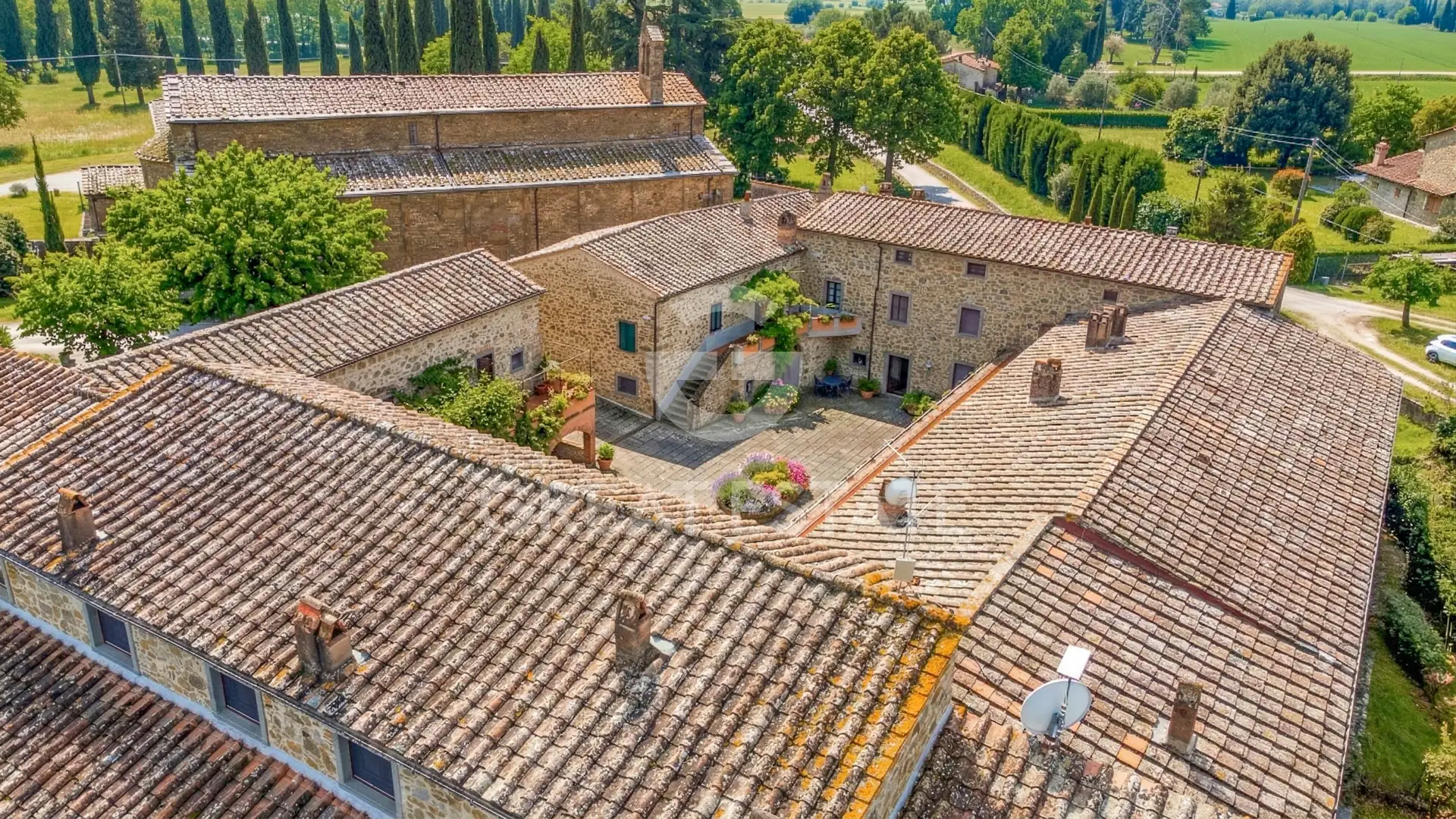 The Sant'Angelo residence apartment offers a surface area of approximately 100 sq.m., arranged on a single level. The property is located on the first floor of the historic complex and overlooks both the greenery and a characteristic internal courtyard. Internally, there is a living area, a central and welcoming space enhanced by ceilings with exposed wooden beams and terracotta tiles, terracotta flooring, and a masonry fireplace with a wooden mantel. The kitchenette, connected to the living area through a wide brick archway, features solid wood elements, a cooktop, stainless steel sink, and ceramic tile finishes. A hallway leads to the sleeping area, consisting of two double bedrooms and two bathrooms. The bathrooms, finished with materials consistent with the style of the farmhouse, are equipped with showers and complete sanitary fittings. Access to the property is very convenient, ensured by a short stretch of paved road. Within the condominium grounds, there are well-maintained gardens, shaped hedges, stone pathways, and relaxation areas immersed in greenery. The sinuous-shaped communal swimming pool is framed by lawn and tall trees; adjacent to it is a fully equipped barbecue area, ideal for convivial outdoor moments. Included in the sale is a private parking space within the fenced area. The historic real estate complex is adjacent to a magnificent church that has been in continuous use since the 11th century.