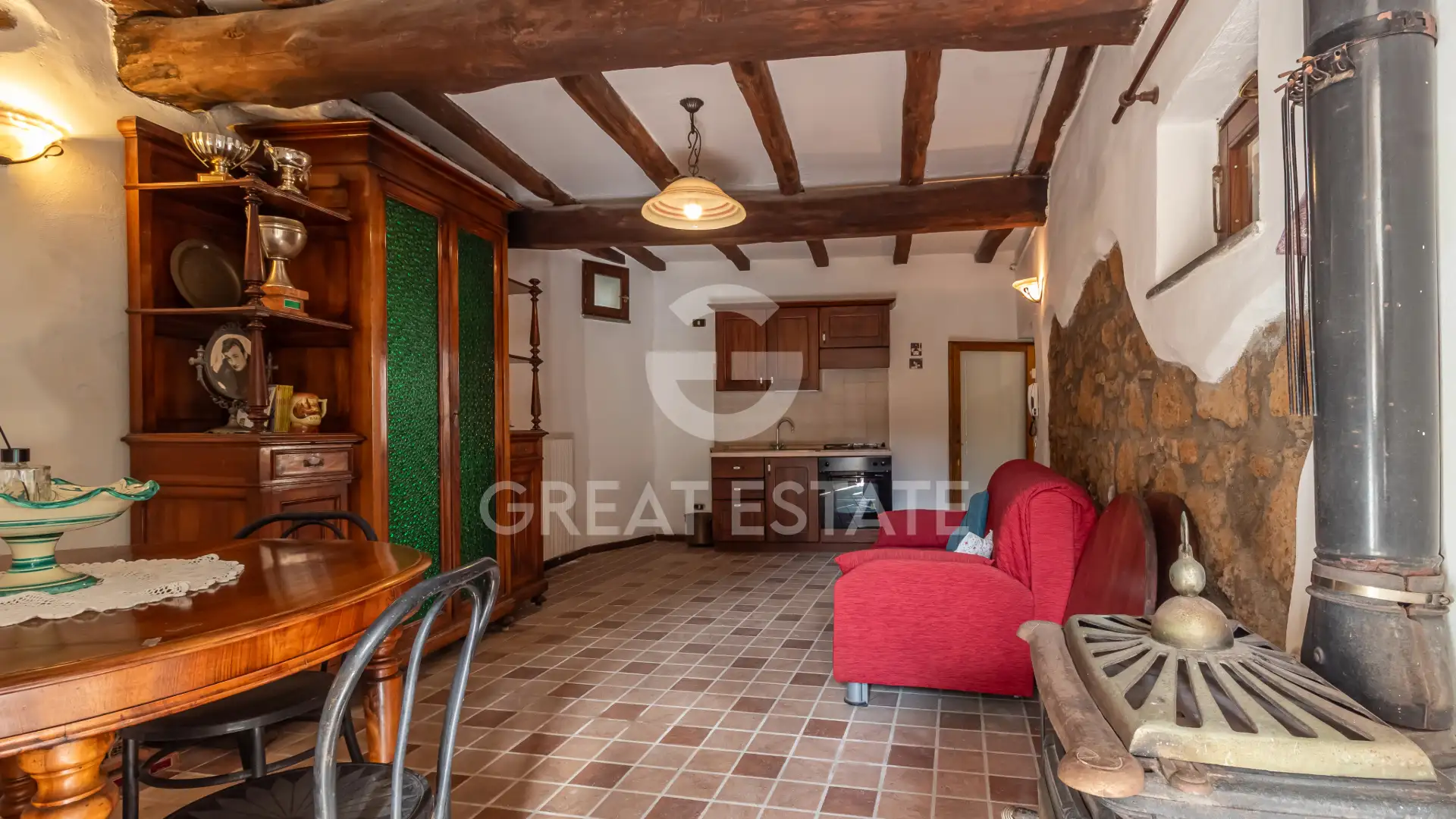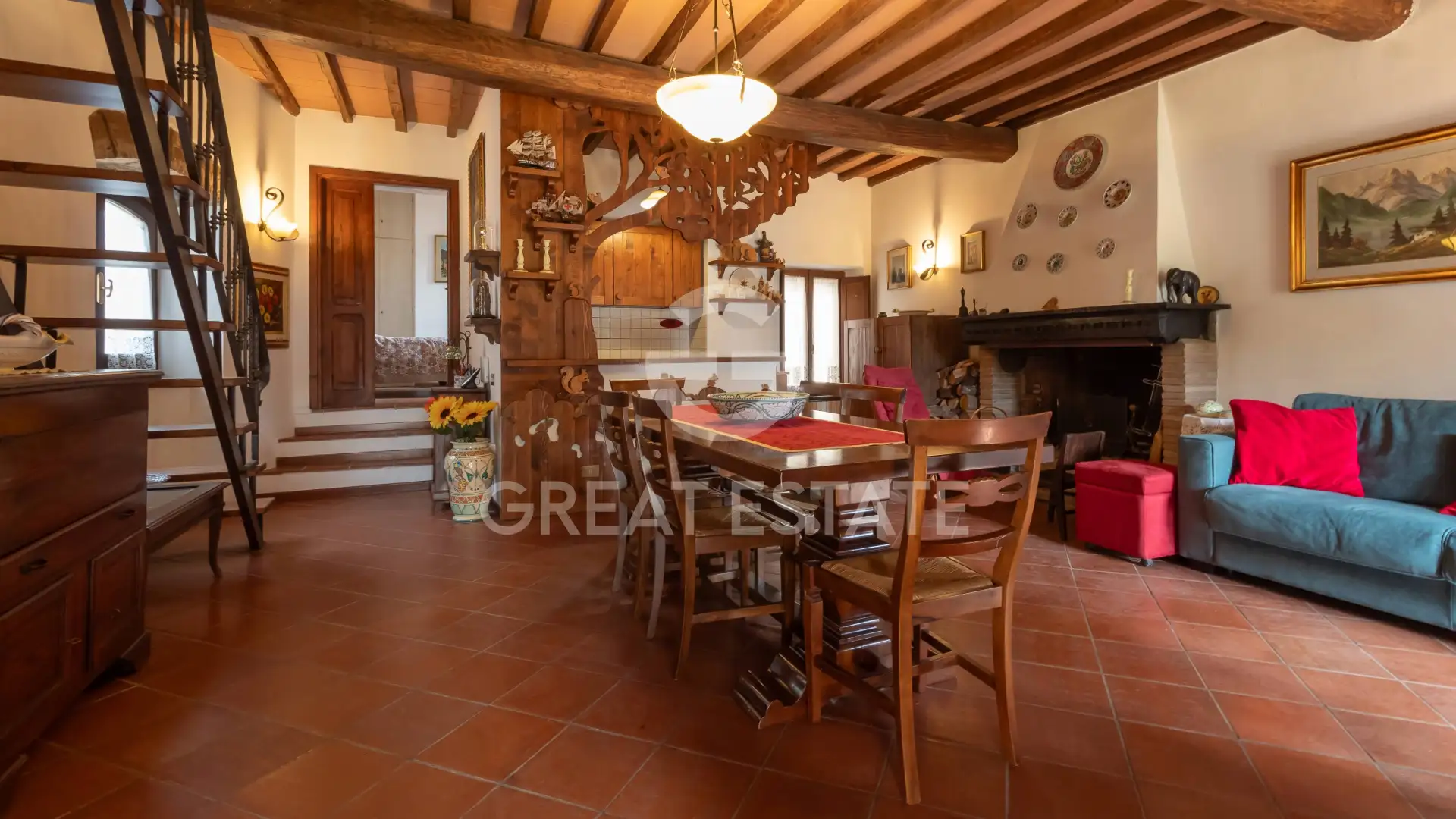 Ascending the comfortable and wide external staircase, you reach the loggia overlooking a pleasant green view. Inside, there is a spacious living room with fireplace and a kitchen enhanced by a wooden artwork created by a renowned local artist. A few steps lead up to a master bedroom with an en suite bathroom with shower. The wooden staircase located in the living room leads to the upper floor, where a hallway connects to another bathroom with shower and two additional double bedrooms.