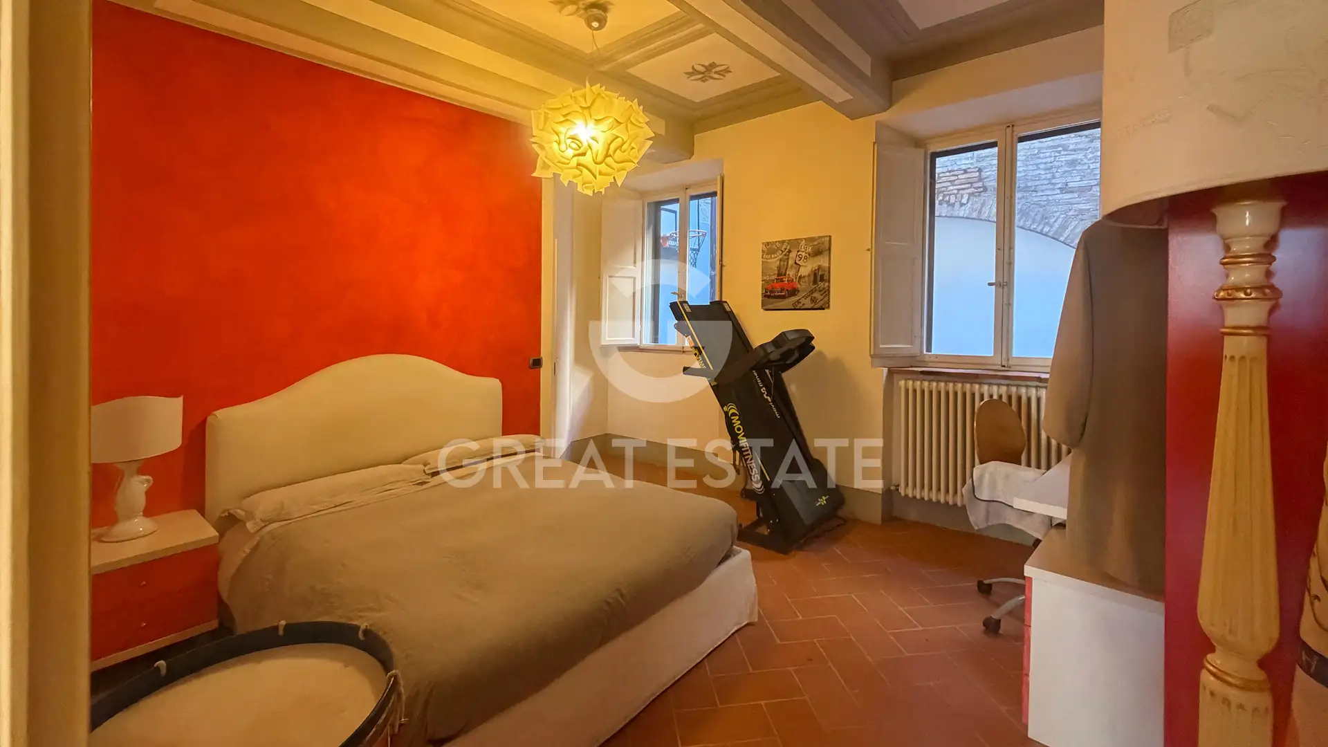 The property is accessed from the ground floor of a prestigious historic palace. Upon passing through the entrance door, two flights of stairs lead to a spacious landing. From here, you enter a large, light-filled living room with views of one of Siena’s most renowned churches, flanked by a generous eat-in kitchen.