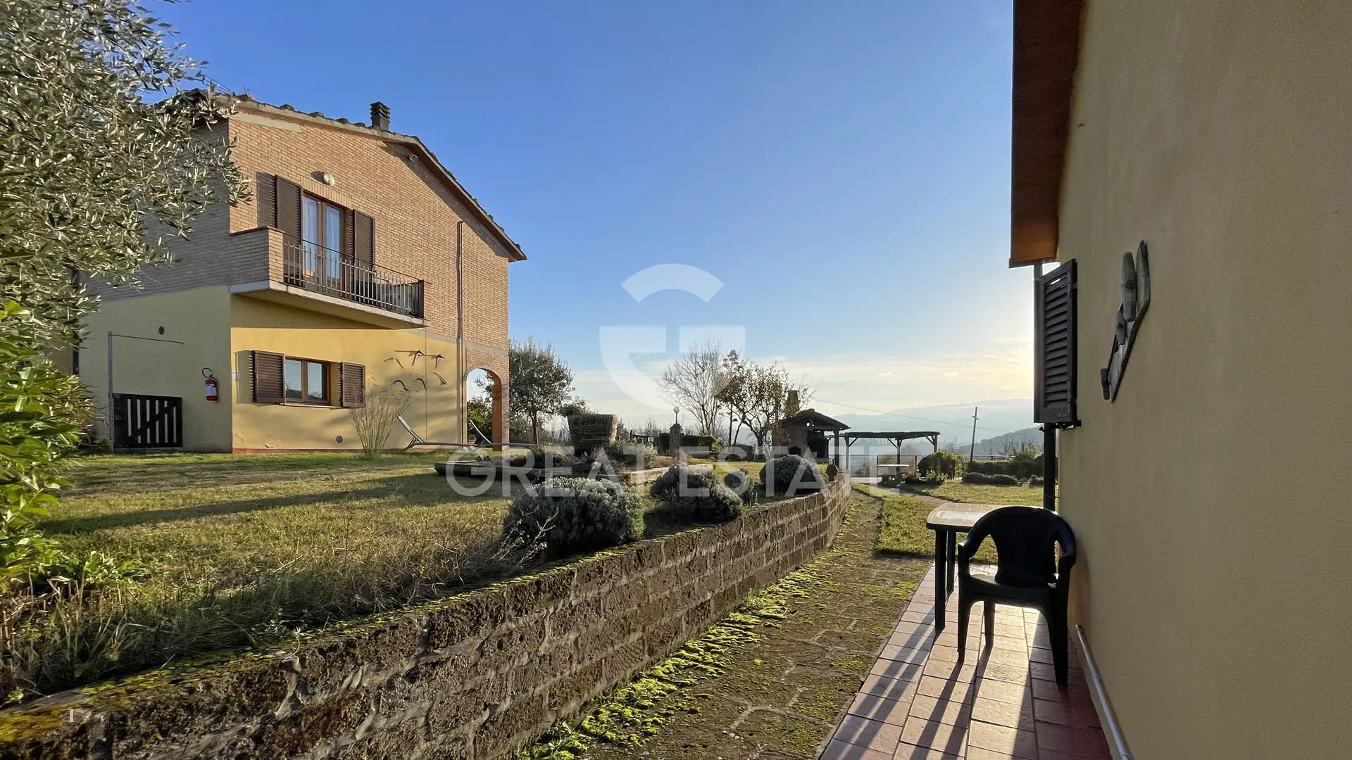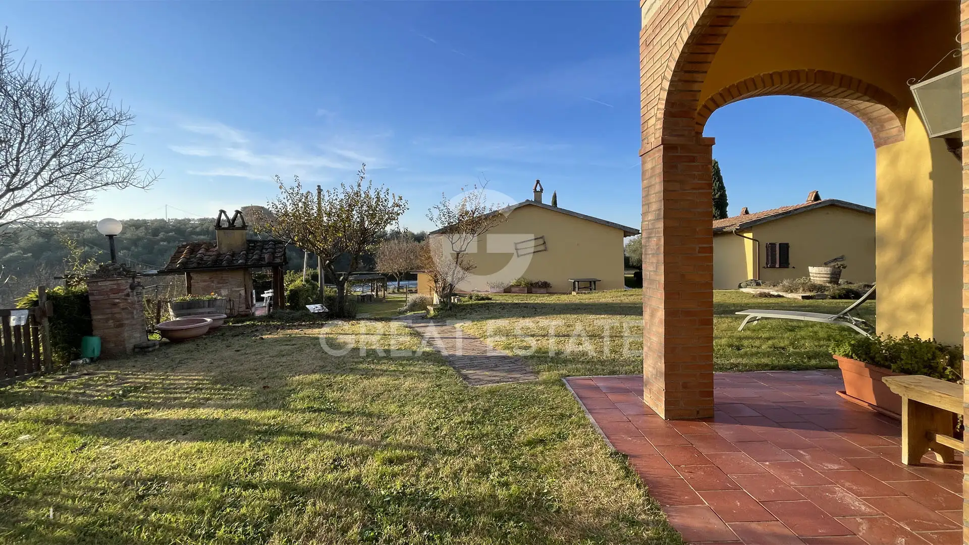 The complex is made up of several buildings, starting with the main farmhouse arranged over two levels, which houses both the owners’ residence and the agritourism activity. On the ground floor, the residential area features a bright living room with kitchen opening onto a magnificent portico, ideal for outdoor relaxation and entertaining, while the first floor hosts the sleeping area with two bedrooms, one of which has a panoramic terrace, and a bathroom.