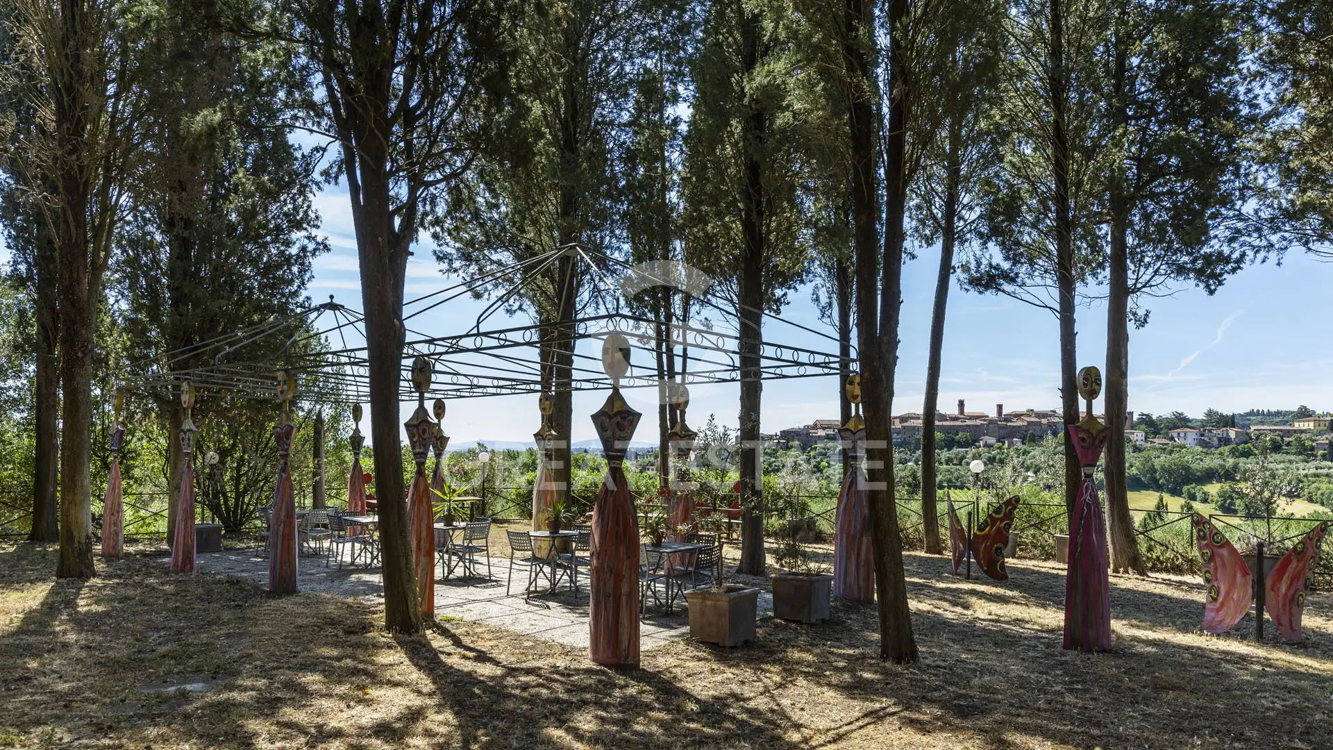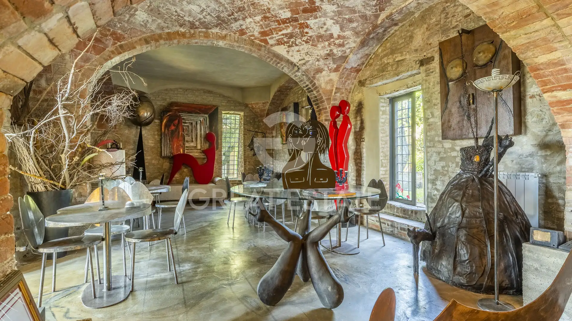 Outside, a beautifully maintained garden features evocative art installations and outdoor dining areas designed to fully enjoy the peace and beauty of the landscape. The land extends over approximately 6,000 sqm and includes an olive grove, creating a true retreat of peace and beauty.