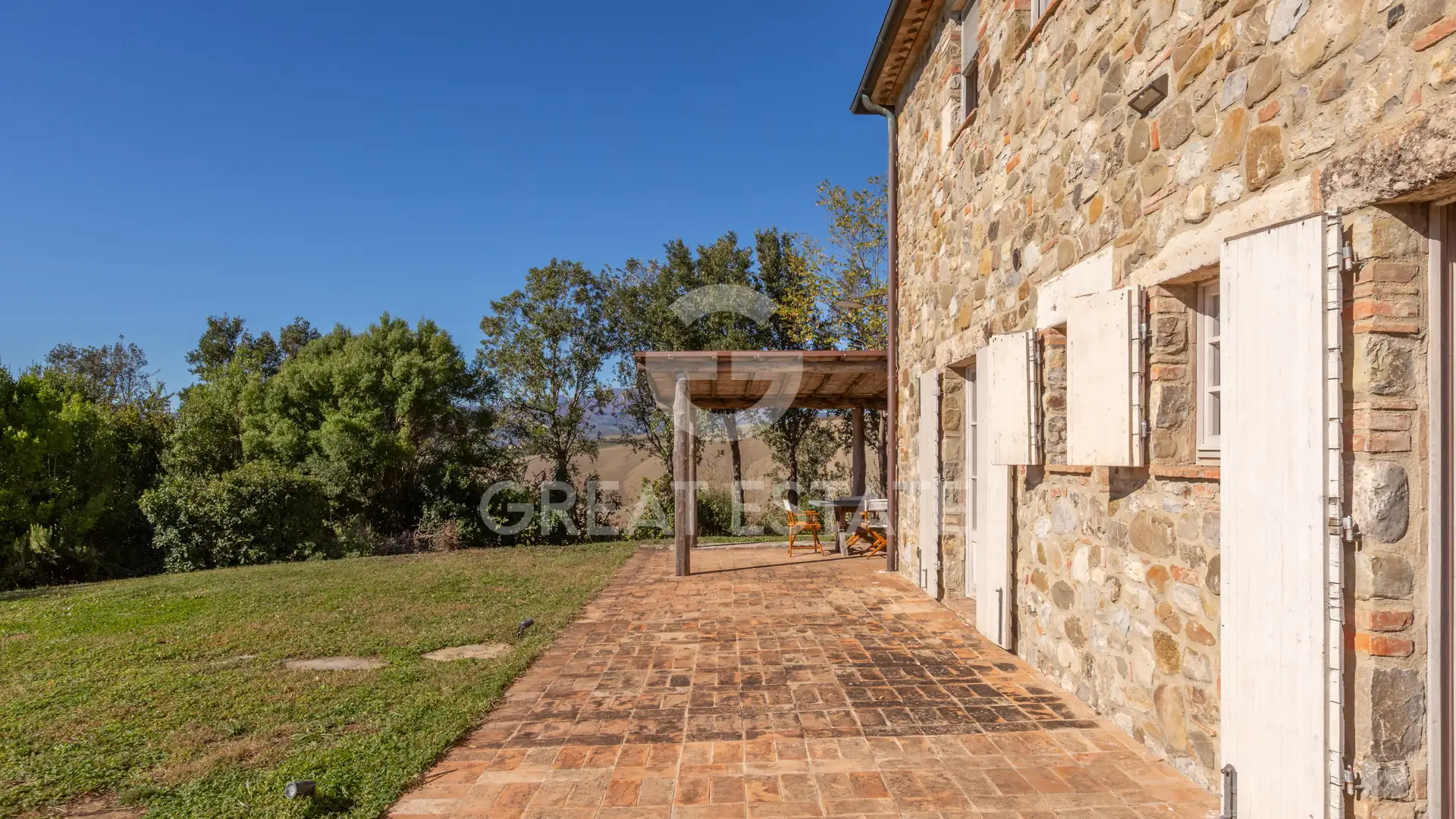 The estate boasts a lush, compact yet functional garden that houses a sleek rectangular swimming pool, ideal for moments of relaxation immersed in nature. Surrounding the farmhouse, the environment retains typical rural characteristics, with well-maintained greenery and an absence of disruptive elements.