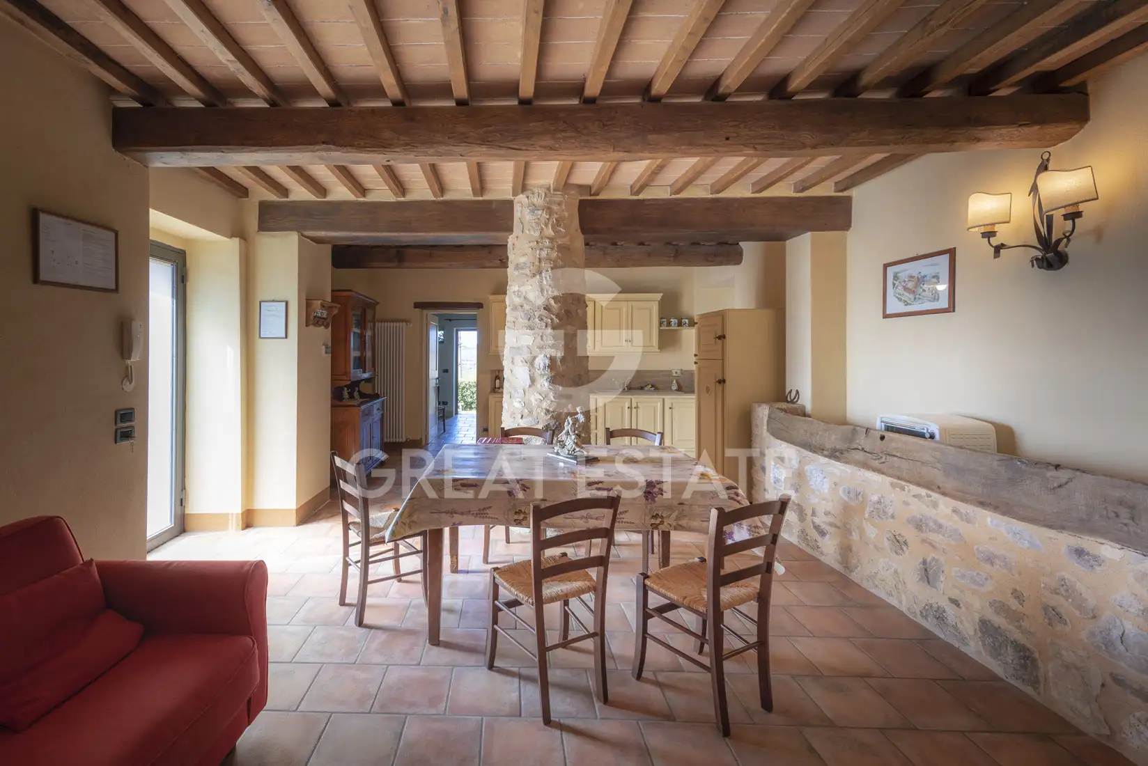 Nestled in the peaceful beauty of the Tuscan countryside, this charming farmhouse of approximately 860 sqm offers an ideal opportunity both as a private residence and as an established hospitality business. The property is thoughtfully divided into several apartments dedicated to tourist accommodation, ranging in size from 55 to 75 sqm. Each unit is designed for comfort and functionality, featuring two bedrooms, one bathroom, a spacious kitchenette, and a bright living area with dining space. One of the apartments, slightly detached from the main building, ensures greater privacy and is enhanced by a pleasant private patio. The property also includes an elegant owner’s apartment, which incorporates a welcoming dining area for hosting guests in a warm and convivial atmosphere. Outside, the estate is surrounded by a well-maintained, lush garden, where a charming infinity pool finished in travertine stands out, perfect for relaxing moments immersed in nature. In a secluded position, screened by a thick hedge, there is also a photovoltaic system. The property is completed by a large parking area located on the opposite side of the entrance. The natural setting is truly exceptional: behind the farmhouse lies a beautiful private woodland of approximately 14 hectares, while on the sides there are about 12 hectares of arable land. Part of this land has been dedicated to equestrian use, with horse boxes and wooden fenced paddocks that blend harmoniously with the landscape.