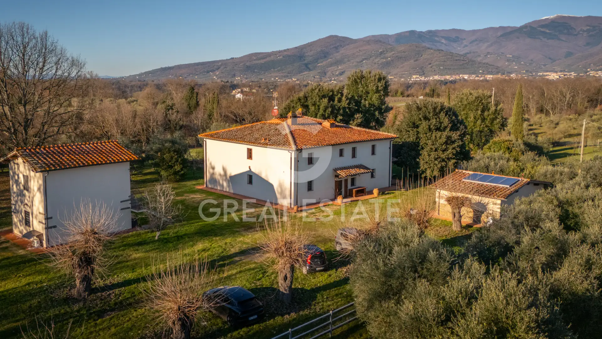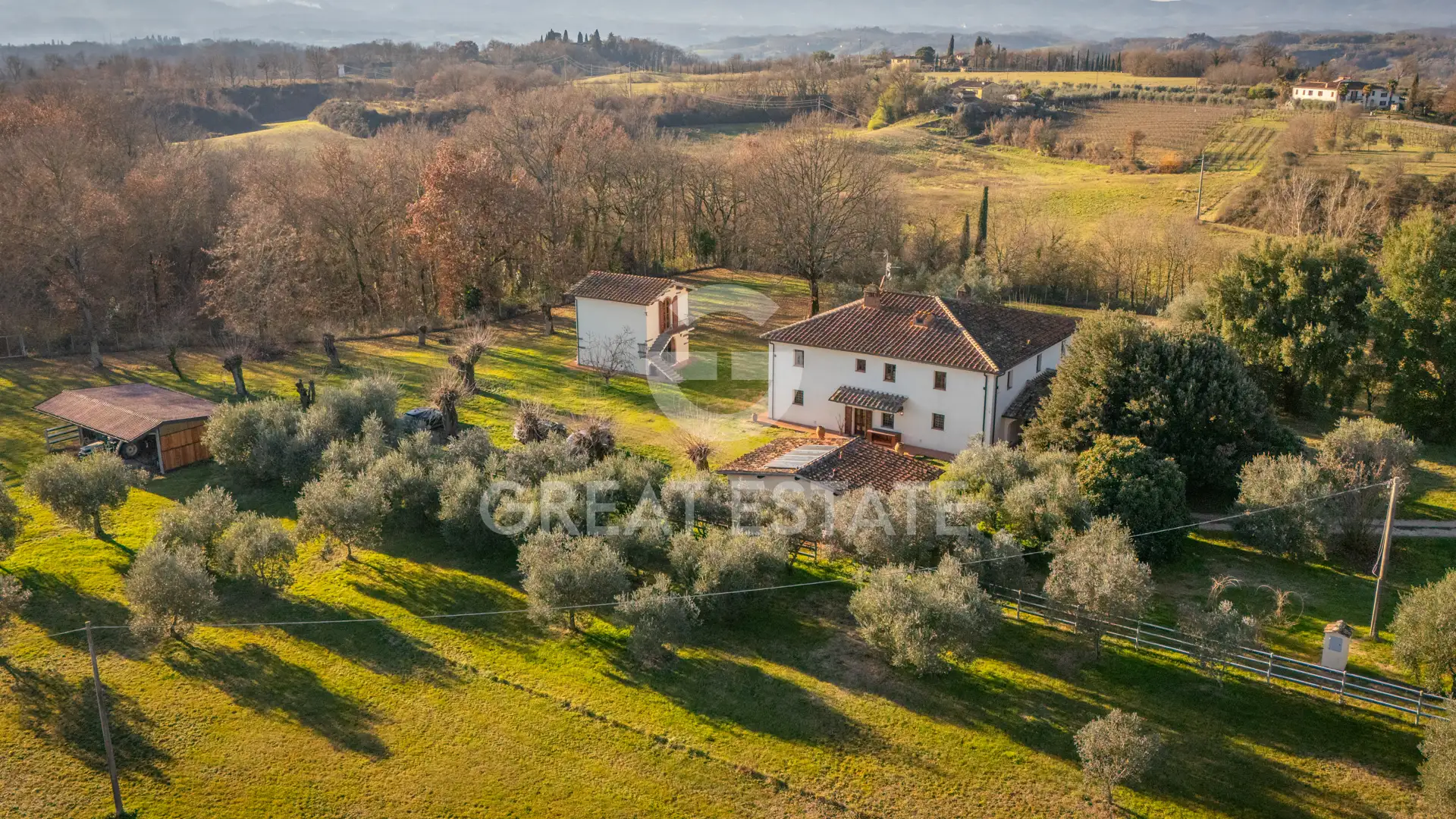 This beautiful property with dependance, located in Terranuova Bracciolini, is immersed in the Tuscan countryside while remaining close to all main services and easily reachable. The main villa, approximately 400 sqm, is arranged over two levels. On the ground floor there is a spacious and bright living area: the triple sitting room, enhanced by large openings and direct access to the external portico, gives the home a unique character and excellent livability. On the same level there is a kitchen with a charming stone fireplace, a dining room, a room currently used as a gym, a guest bathroom and an additional living room, ideal as a study or relaxation area. An internal staircase leads to the first floor, which could easily be converted into an independent residential unit. Here we find a bright living area with stone fireplace and two balconies, a fully equipped kitchen and the sleeping area consisting of three bedrooms and two bathrooms. Outside the villa, in an adjacent position, there is a renovated former barn of approximately 70 sqm on two levels, currently used as a honey laboratory and storage. There is also a further building used as a laundry and technical room, complete with a small bathroom. The property is completed by a horse shelter and a spacious 160 sqm stable by the renowned “Rinco” company, a leading name in the equestrian sector, with four existing boxes and set up to accommodate up to ten horses. The villa is surrounded by 17 hectares of land, with large meadows ideal for paddocks, an olive grove of about 300 trees producing excellent organic olive oil, and approximately 5 hectares of woodland.