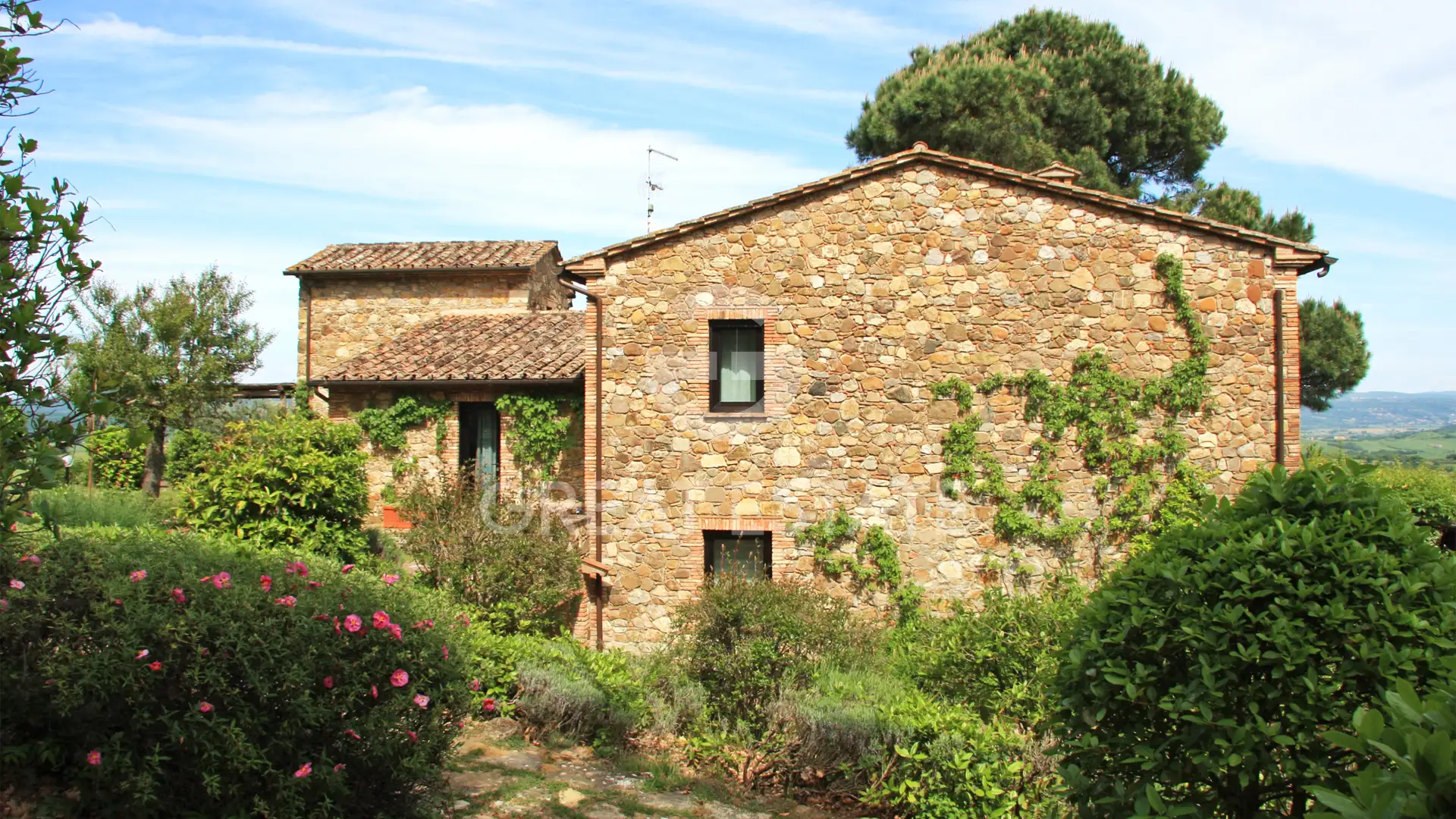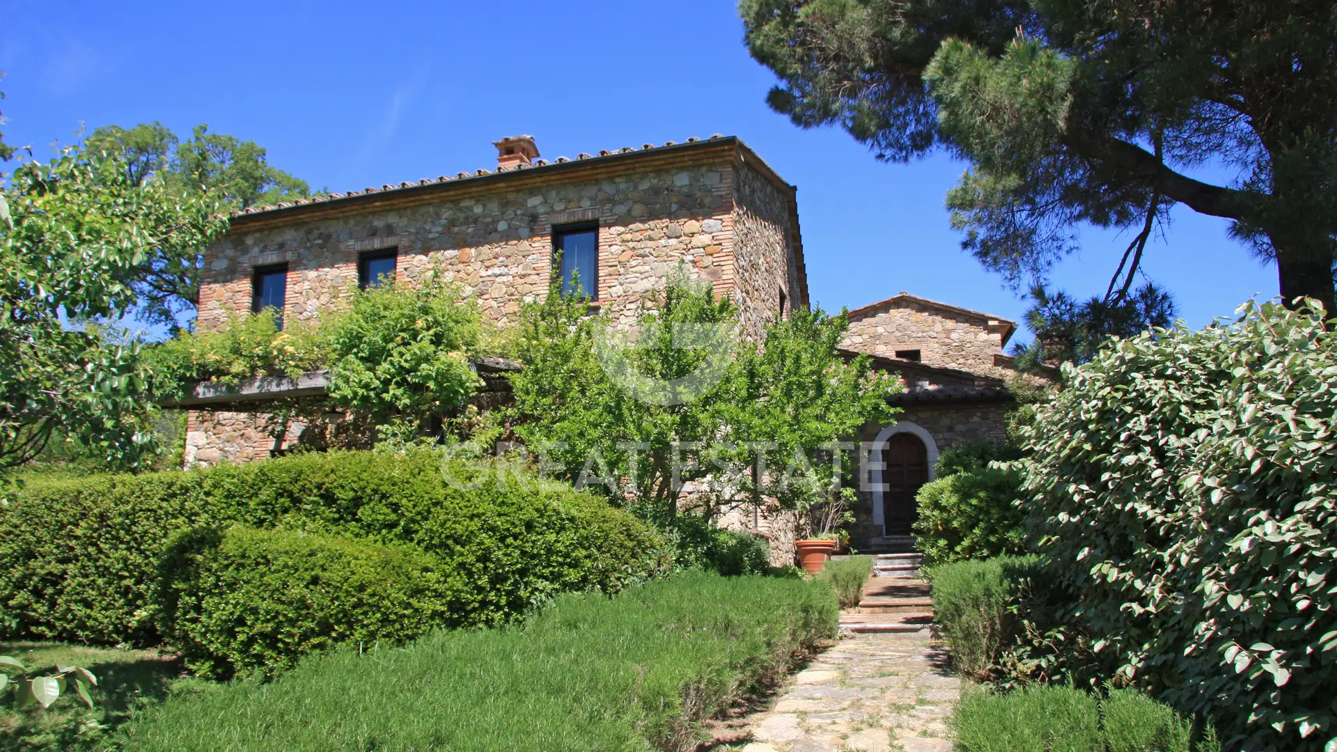 The farmhouse Poggio degli Ulivi is set within a private garden of approximately 6,800 mq, expertly designed with rose pergolas, geometric lavender beds, manicured hedges, and aromatic herbs framing the swimming pool, perfectly integrated into the landscape. Its elevated position offers wide and sweeping views over the gentle Tuscan hills, while the outdoor lighting enhances the entire property in the evening hours, amplifying its charm and privacy.