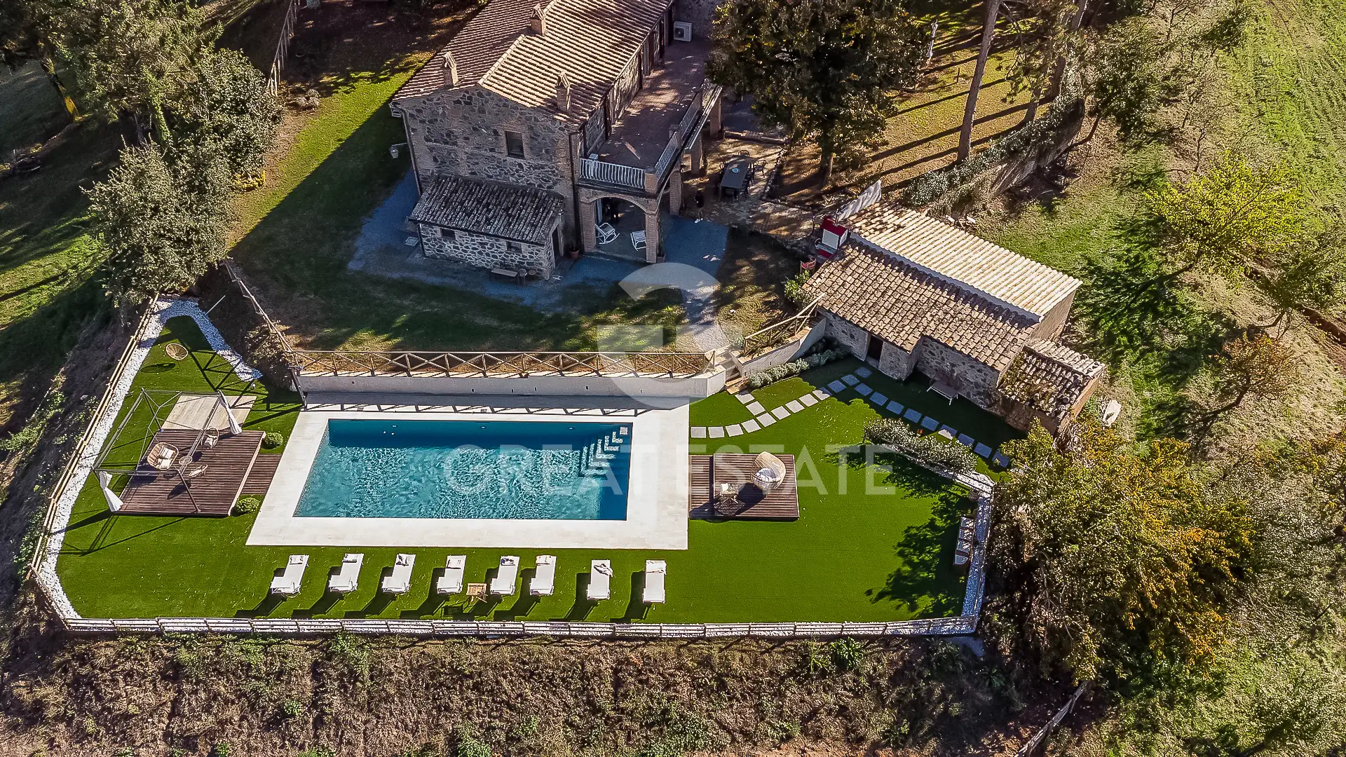 The main farmhouse, of approximately 350 sqm of usable space, is arranged over two levels and is laid out as follows: on the ground floor there is a spacious living room with dining area, the kitchen, a technical room, one bedroom and two bathrooms. Access to the first floor is provided by two staircases, each serving a different sleeping area. In total, there are six bedrooms, five bathrooms and two large panoramic terraces. The property is completed by an outbuilding with a grotto, a second outbuilding used as a storage room, a swimming pool measuring 12x5 meters, and approximately 10 hectares of agricultural land.