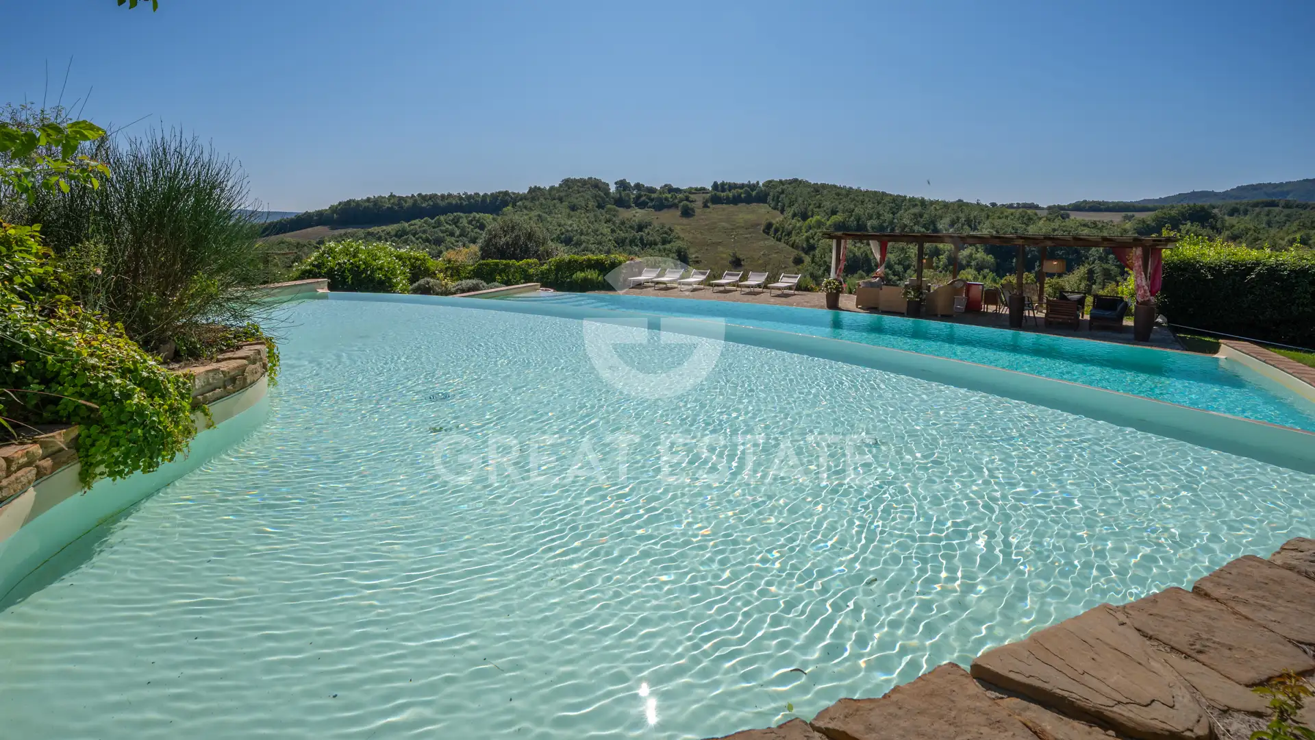 The highlight of the property is the unique double panoramic pool: the upper pool measures 13x4,5 meters, while the lower one measures 17x8 meters, both overlooking stunning Tuscan landscapes. Below the pool area, there is a technical room and a storage space.