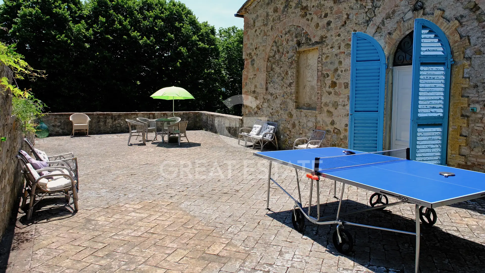 The outdoor areas are designed to fully embrace nature and relaxation: a well-kept garden with an outdoor dining area, shaded terraces, and spaces dedicated to leisure. The splendid panoramic swimming pool, measuring 14x7 meters, accompanied by a children’s pool, offers breathtaking views over the Tuscan hills.