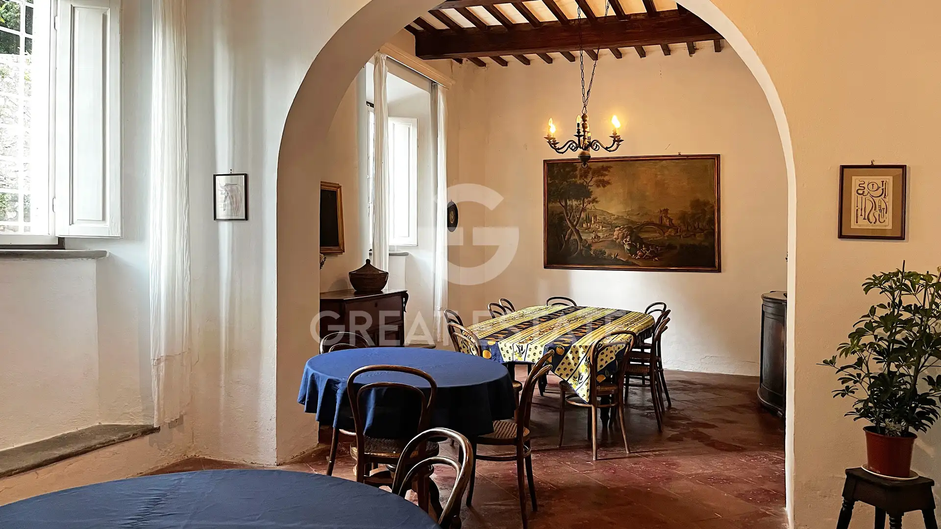 On the ground floor, the interiors welcome us with a spacious kitchen featuring a fireplace, a large dining room ideal for convivial gatherings, three elegant living rooms, and a functional pantry/storage room. There are also additional ancillary rooms, partly in need of renovation, offering interesting opportunities for customization.