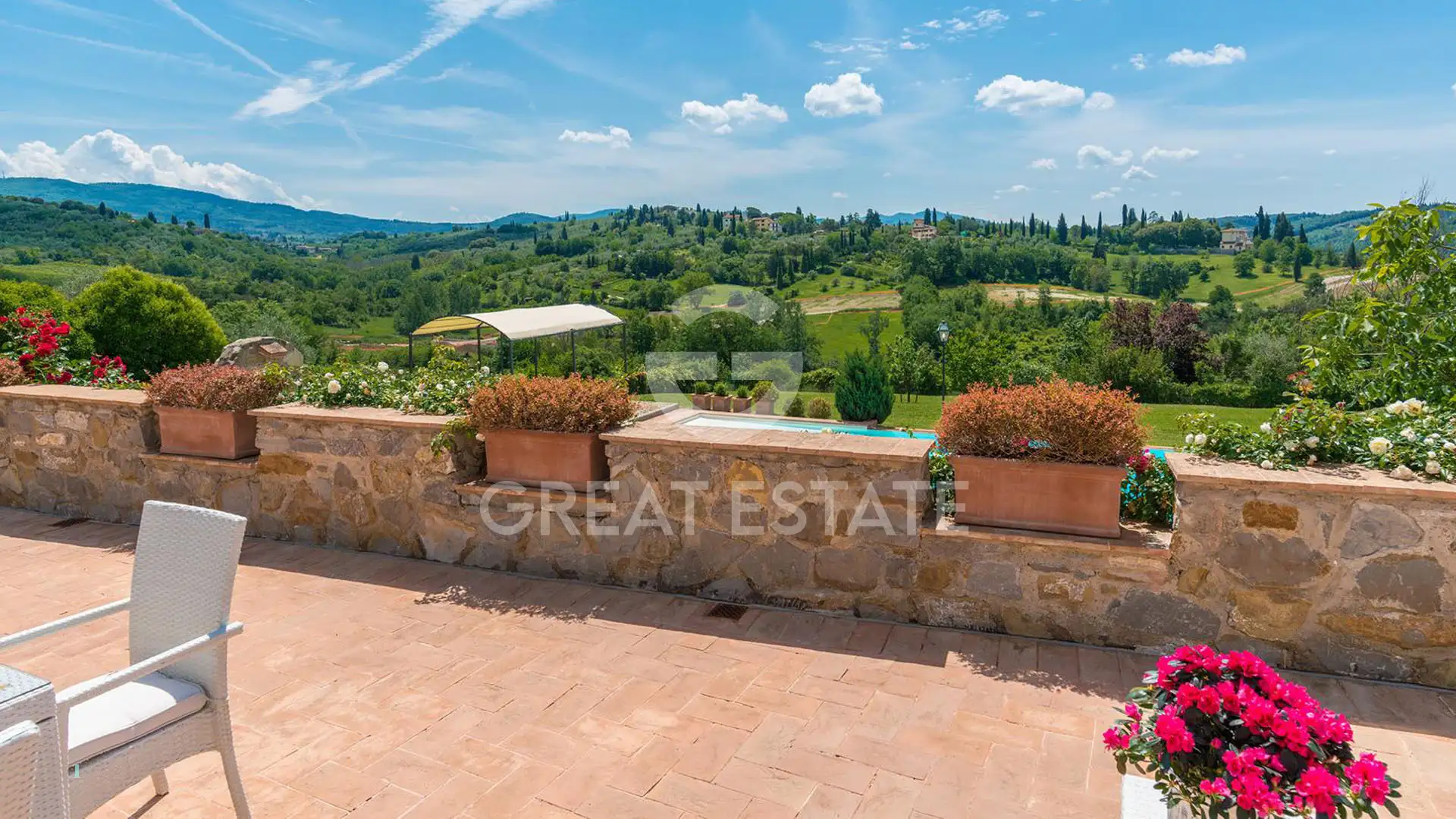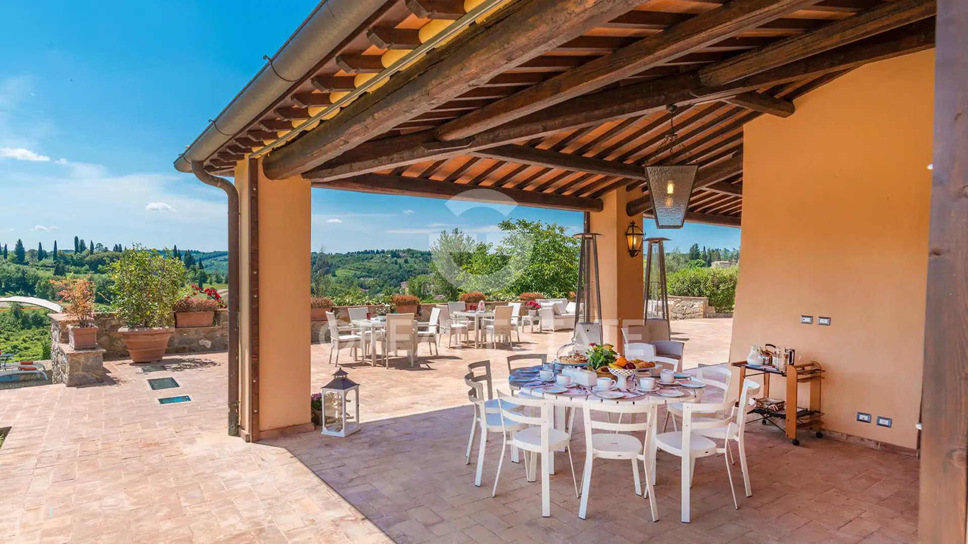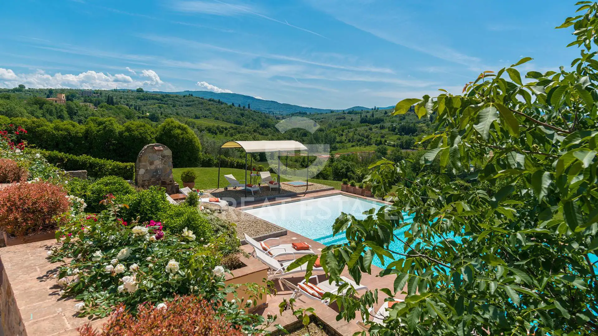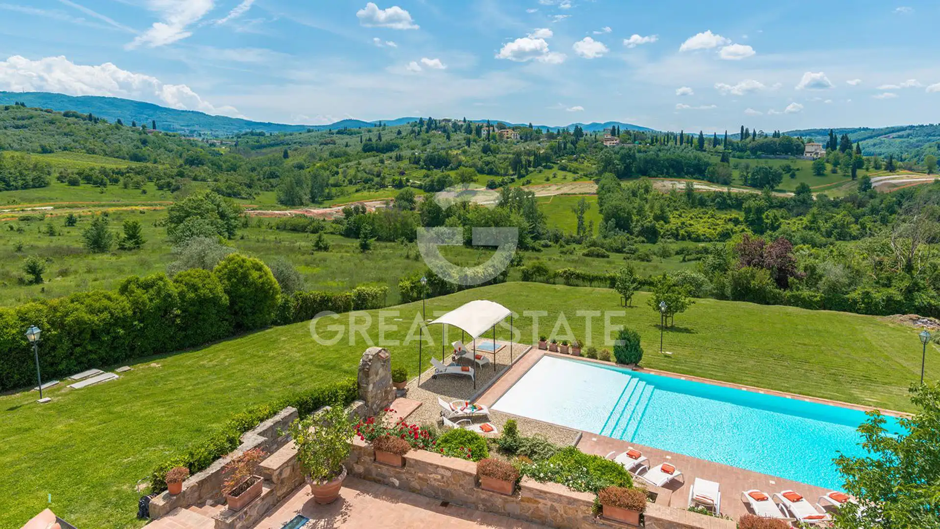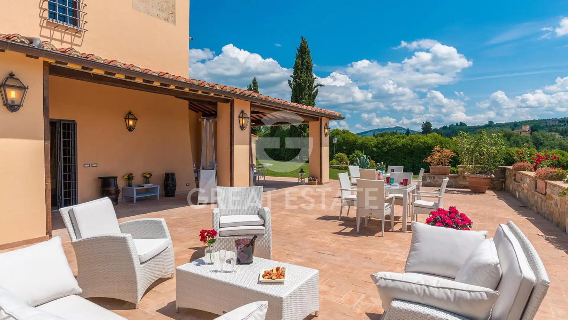 Outside, there is a large covered loggia equipped with a wood-fired oven and an outdoor kitchen area. The paved outdoor spaces allow for the creation of a terrace with dining tables and a lounge area overlooking the 15×5 panoramic swimming pool and the Tuscan hills. The villa is set within a private garden of approximately 5,000 sqm, ensuring privacy and a charming natural setting.