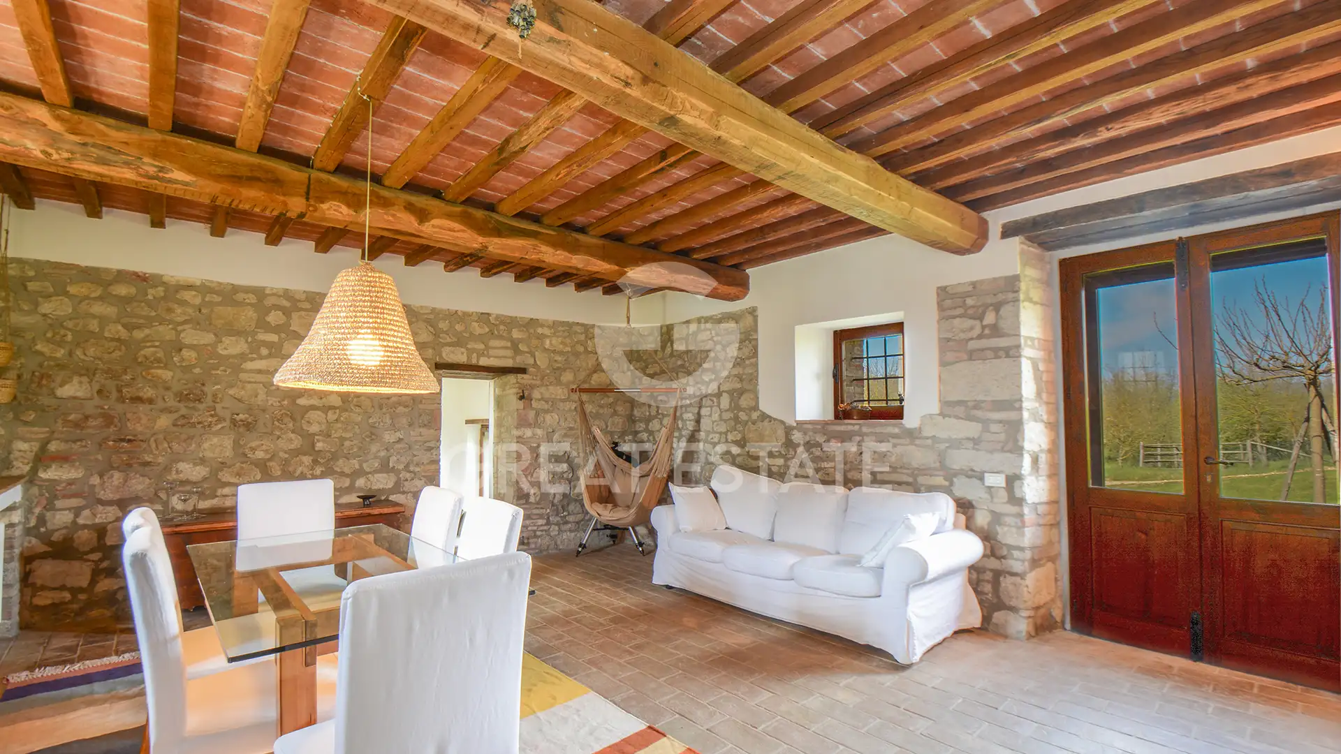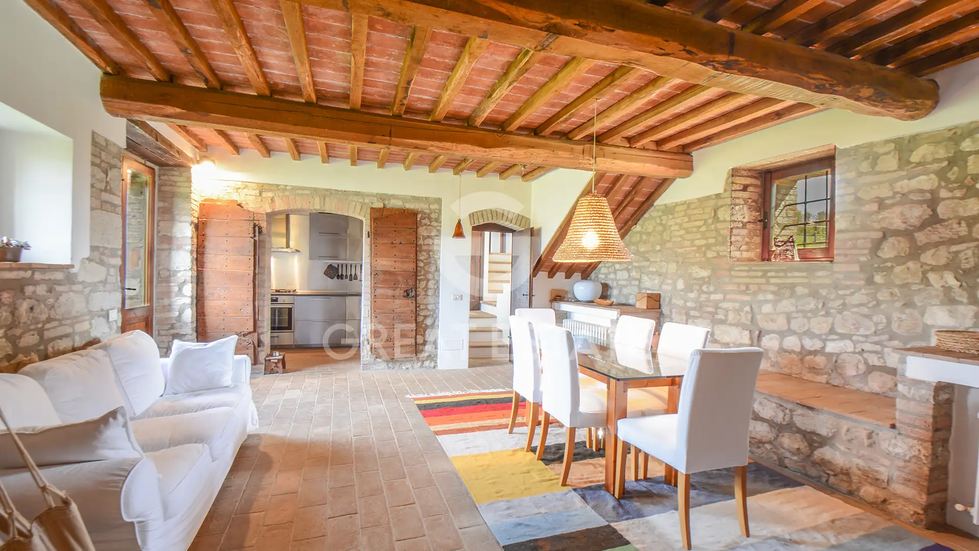 The farmhouse, with a surface area of approximately 260 mq, is built in stone and features wooden beam ceilings, terracotta floors in the living area, and high-quality parquet in the sleeping quarters, creating a warm and authentic atmosphere.