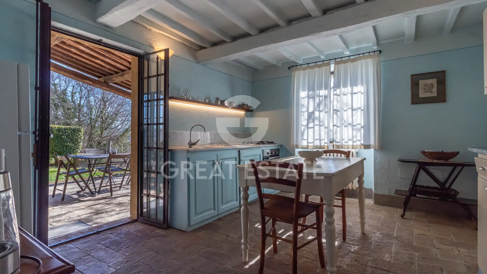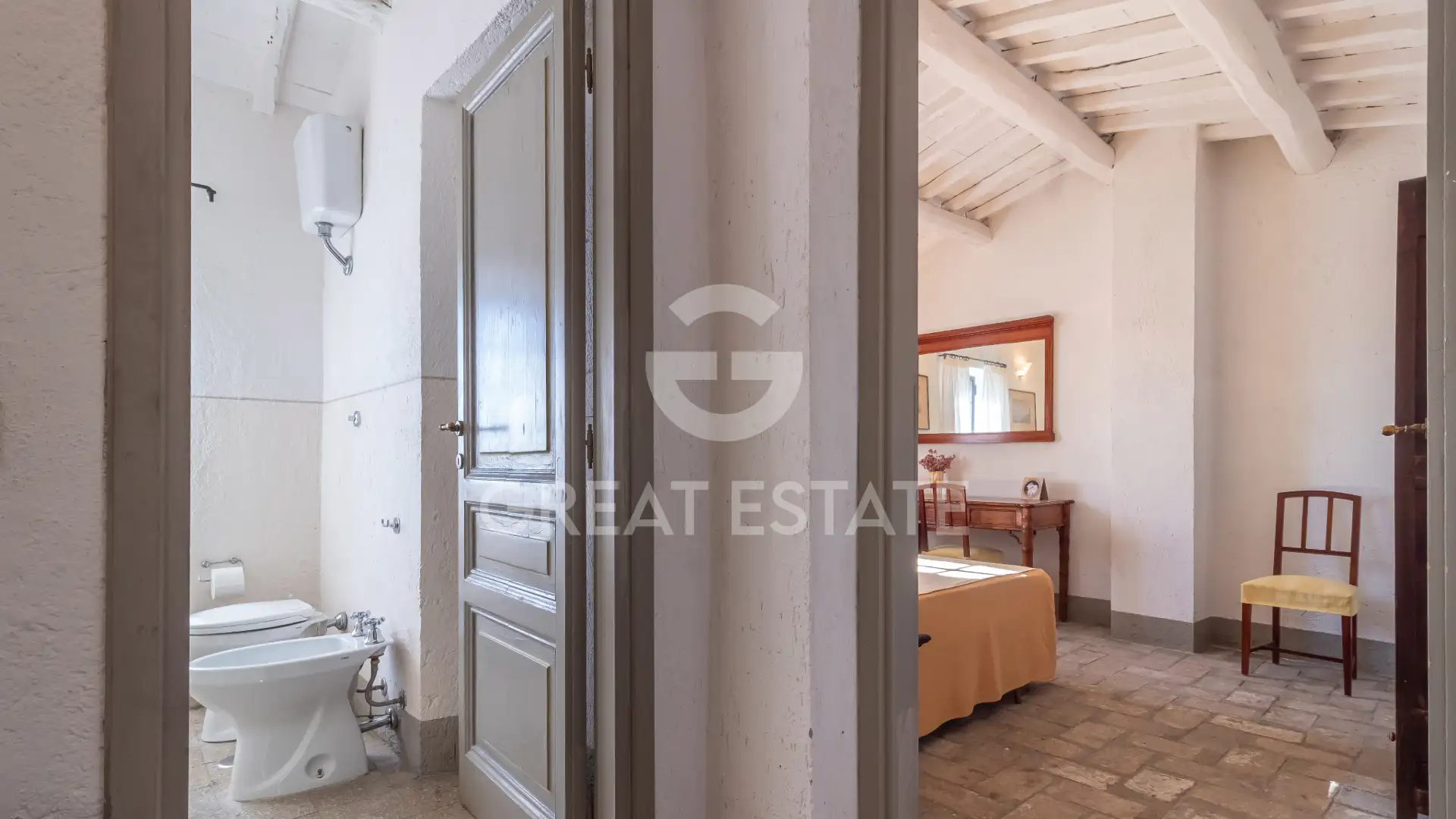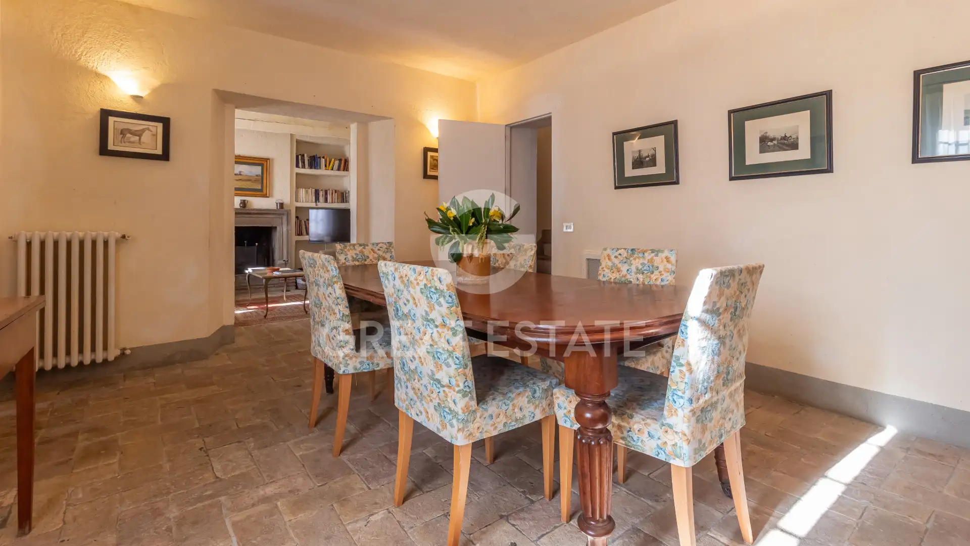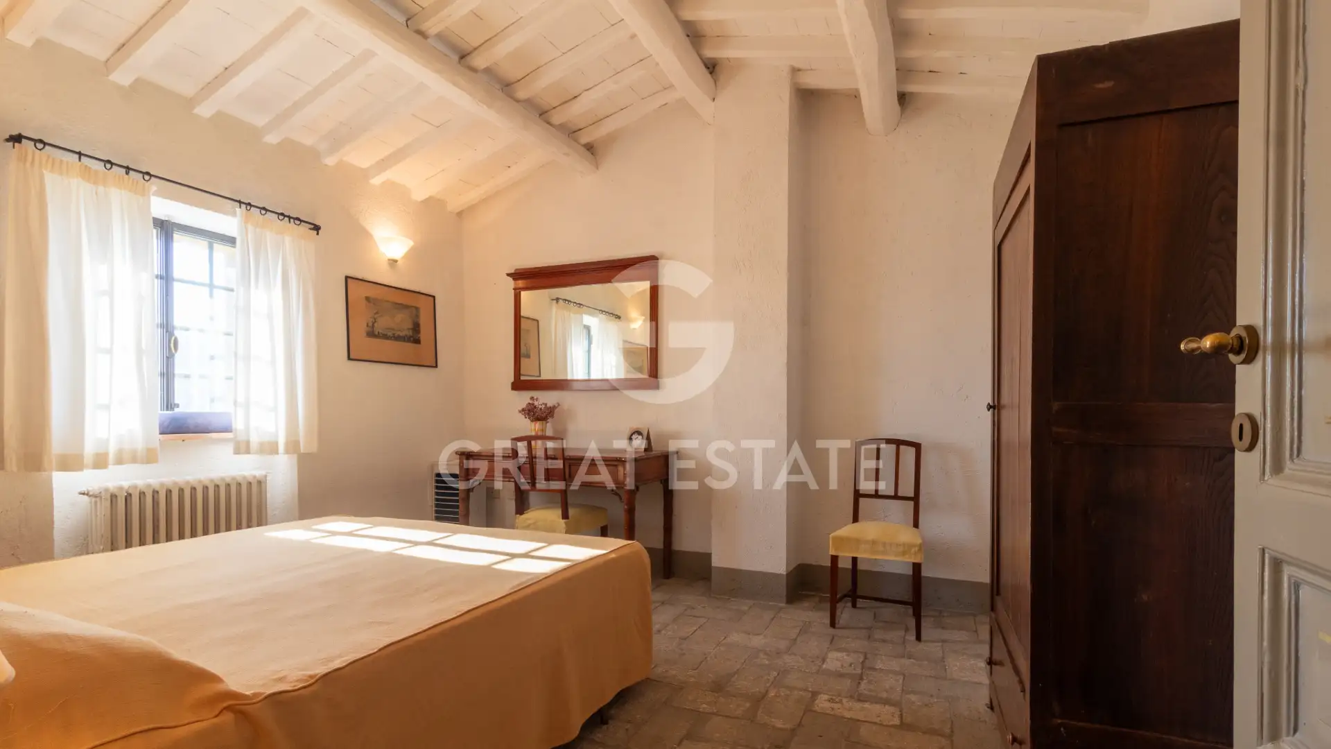 Accessed via a white gravel road offering breathtaking vistas, you then find yourself immersed in unspoiled countryside: welcome to La Marzolina, an ancient residence set in a commanding position overlooking the valley and surrounded by a garden with panoramic views. The property extends over 191 square meters across two levels. Upon entering on the ground floor, there is a spacious living area and, adjacent to it, a sitting room with fireplace; on the opposite side opens the kitchen, which overlooks a portico where you can enjoy magnificent views and dine al fresco. Next to this area is also the barbecue zone. On the same floor there is a hallway, a bathroom with bathtub, and a double bedroom, also overlooking the portico. The first floor can be reached either via the internal staircase or through an independent external entrance. This level features a charming living room with a stone fireplace, a double bedroom with en suite bathroom, a bathroom with shower, and alongside it another double bedroom.