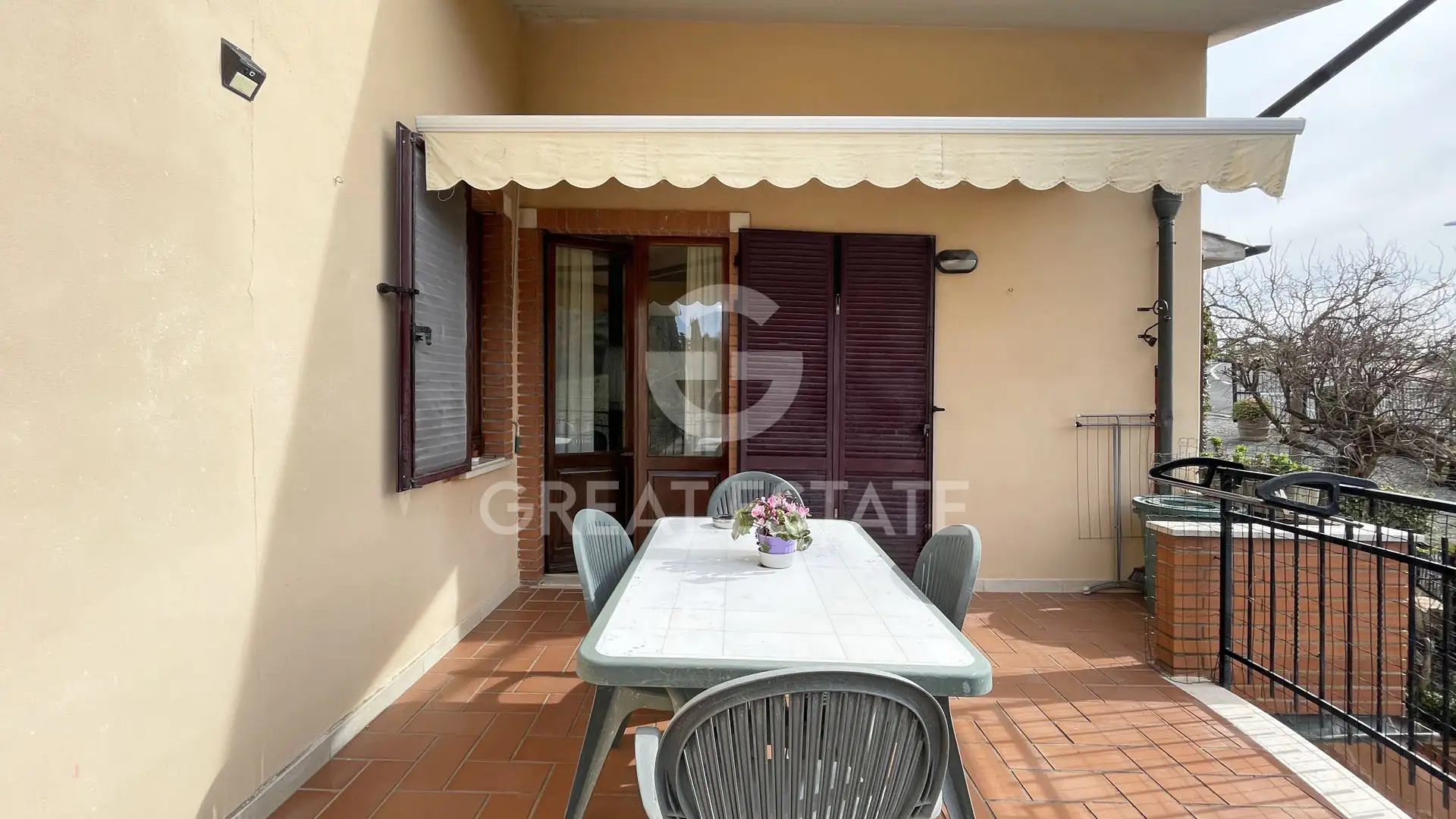 Access to the first floor is through a well-maintained portico, and the residence benefits from two separate entrances. Here we find the main apartment, comprising a laundry room, guest bathroom, dining room with access to a splendid panoramic terrace, kitchen with balcony, a spacious living room with terrace, three bedrooms, one of which with balcony, and a bathroom serving the sleeping area.