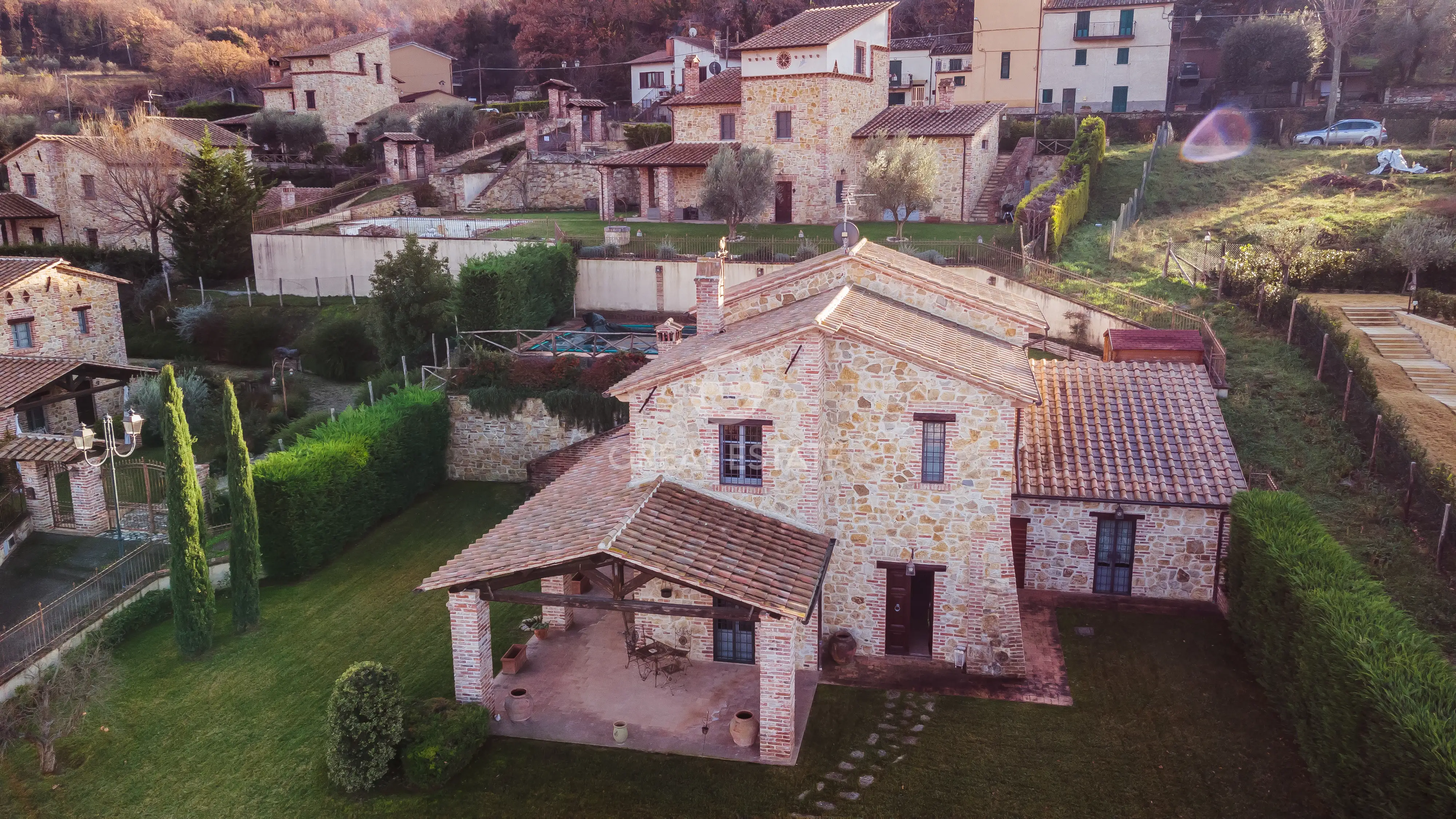 The property stands out for its high-quality finishes, with wooden beam ceilings and terracotta tiles, floors in terracotta, and details that evoke Umbrian tradition. Access to the estate is direct from the public road via a motorized gate, offering convenience and security.