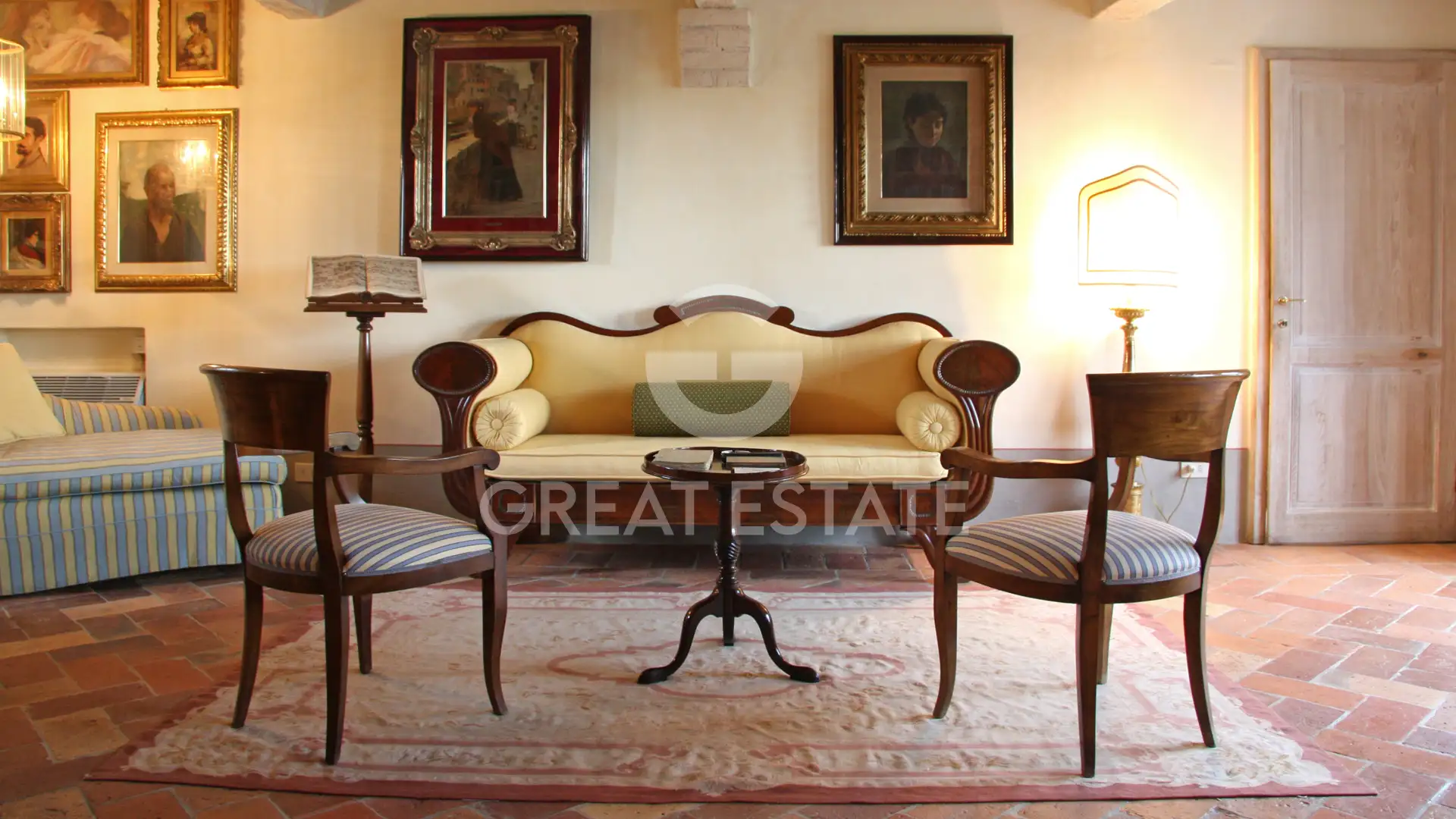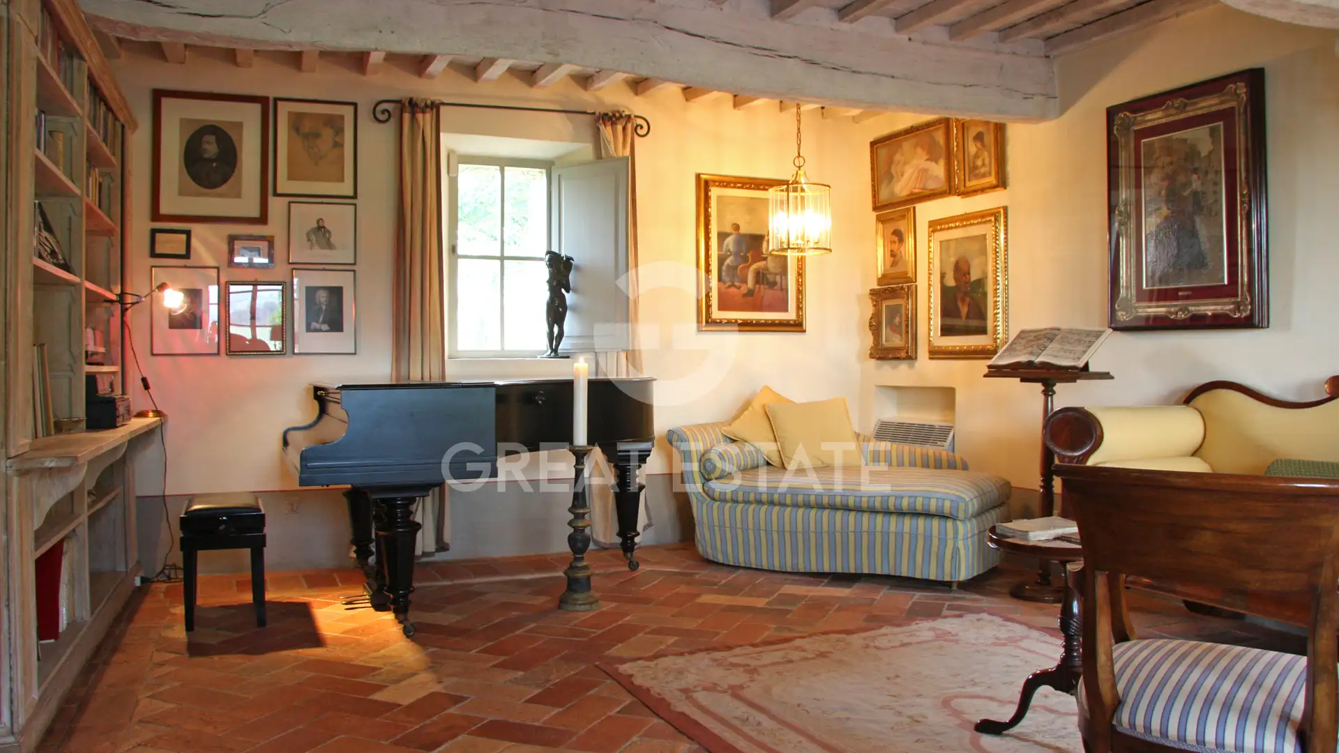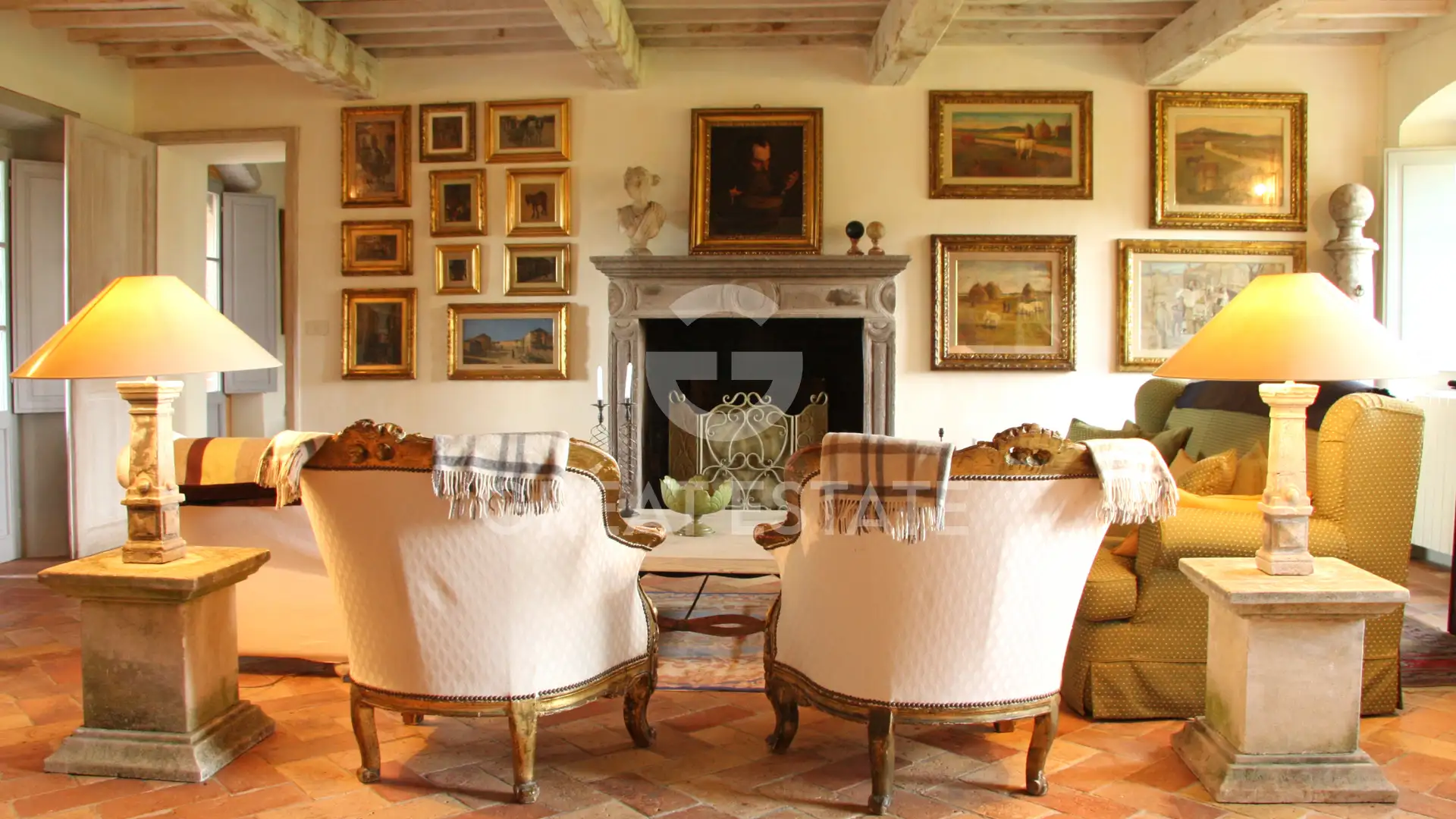 The first floor, accessible via an internal staircase as well as two external staircases, one with a loggia and one with a terrace, features a second kitchen and a charming library lounge with fireplace. On the same level there are four additional bedrooms, four bathrooms, and an elegant vestiaire.