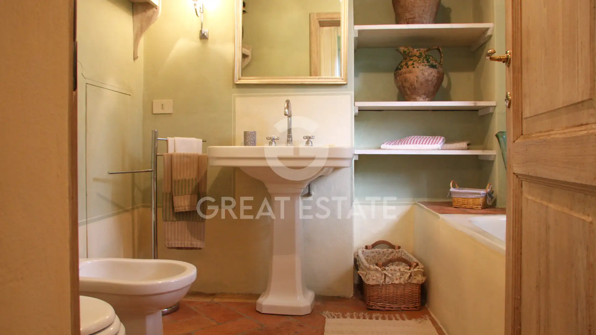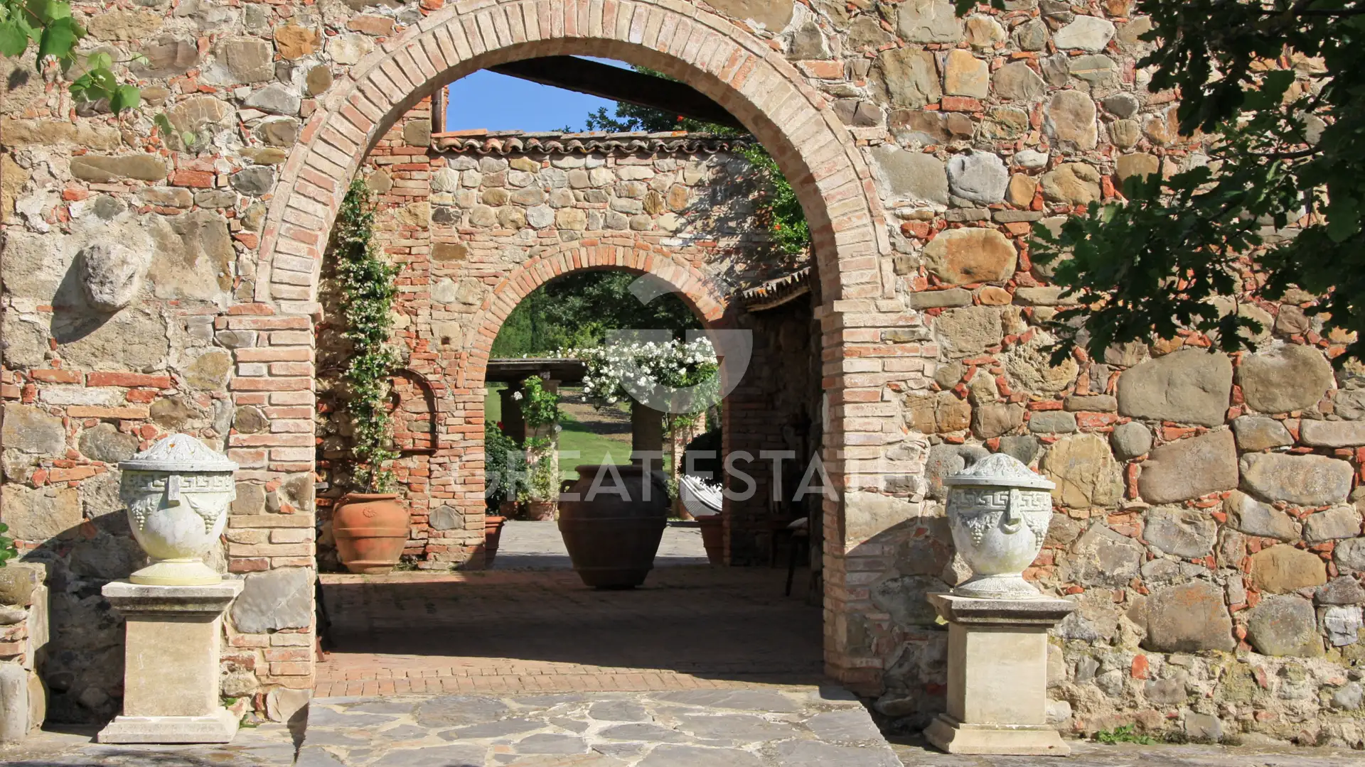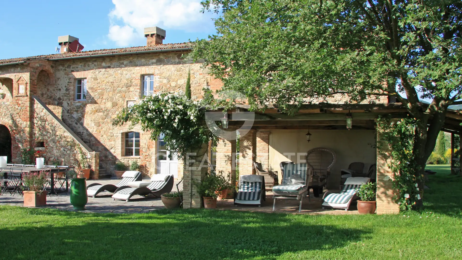 The outdoor areas are designed for a lifestyle devoted to conviviality: a porticoed courtyard adjacent to the kitchen, complete with an outdoor fireplace and antique wood-fired oven, provides the perfect setting for open-air lunches and dinners; the magnificent pool area, with two pergolas shading an elegant 12 x 6 mt. biodynamic infinity pool, heated and finished in travertine/concrete; a 3 x 3 mt. travertine hot tub with panoramic views over the entire valley.