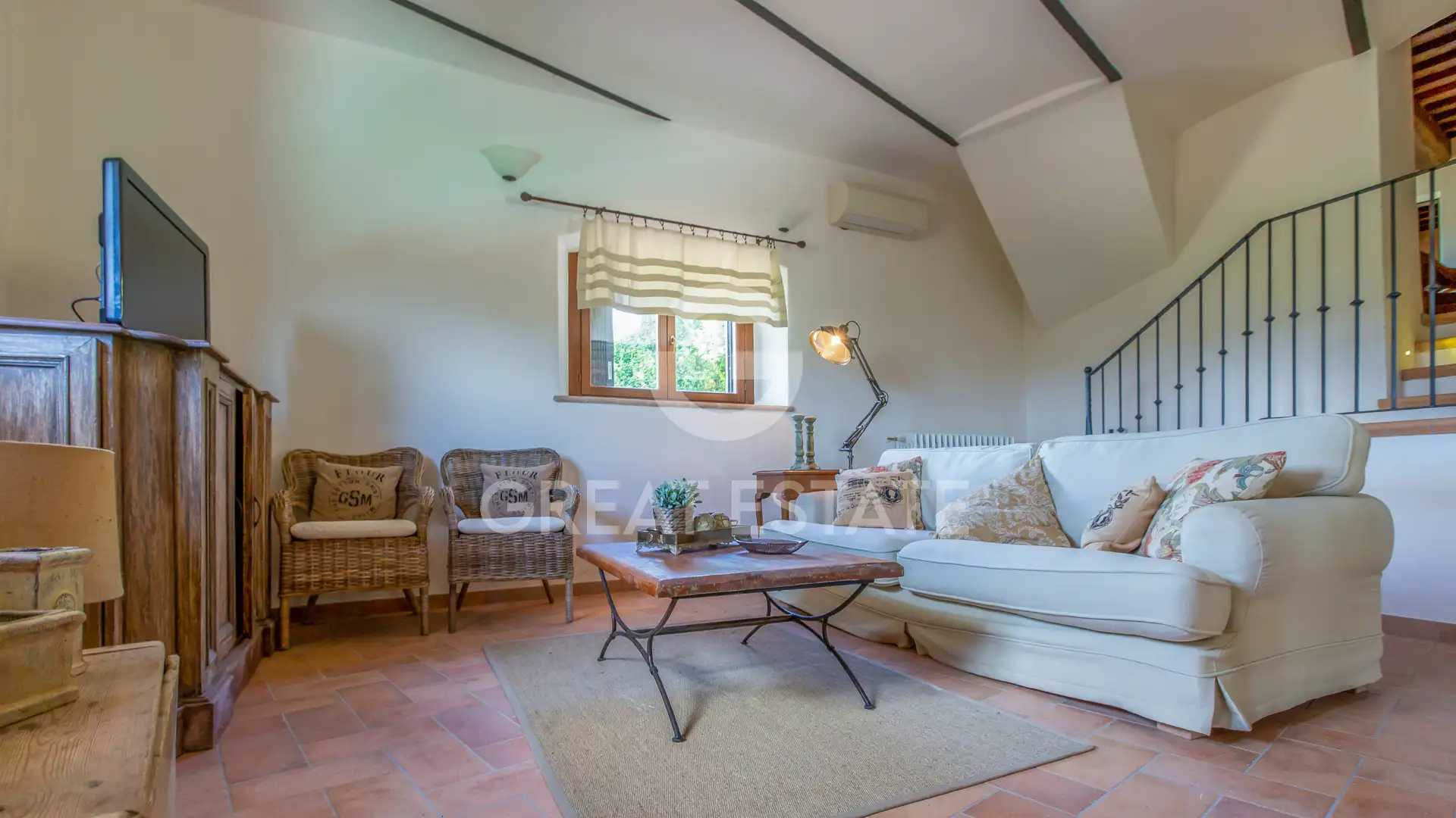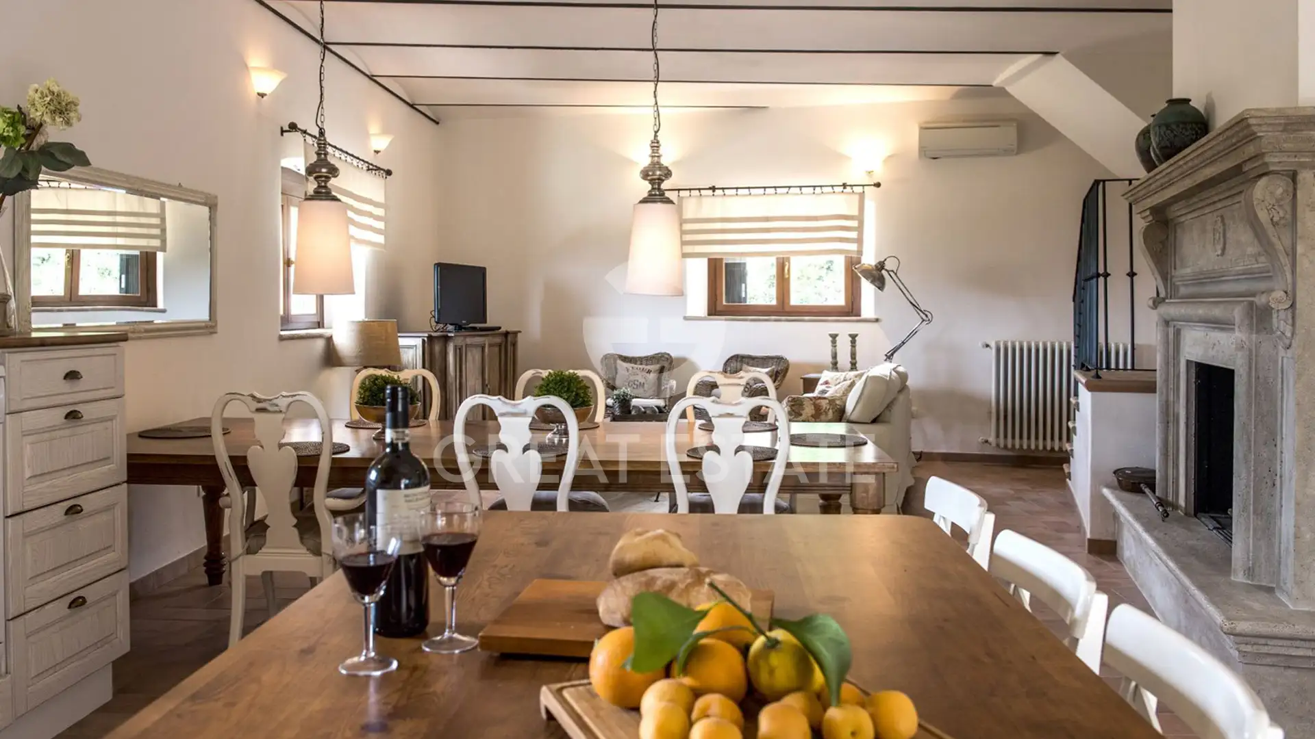 The first floor, also accessible via an external staircase with independent entrance, hosts a second living room with fireplace, three bedrooms and two bathrooms. The windows frame the hilly landscape and provide constant brightness to the interiors. The internal layout is functional and fluid, suitable both for private living and hospitality.