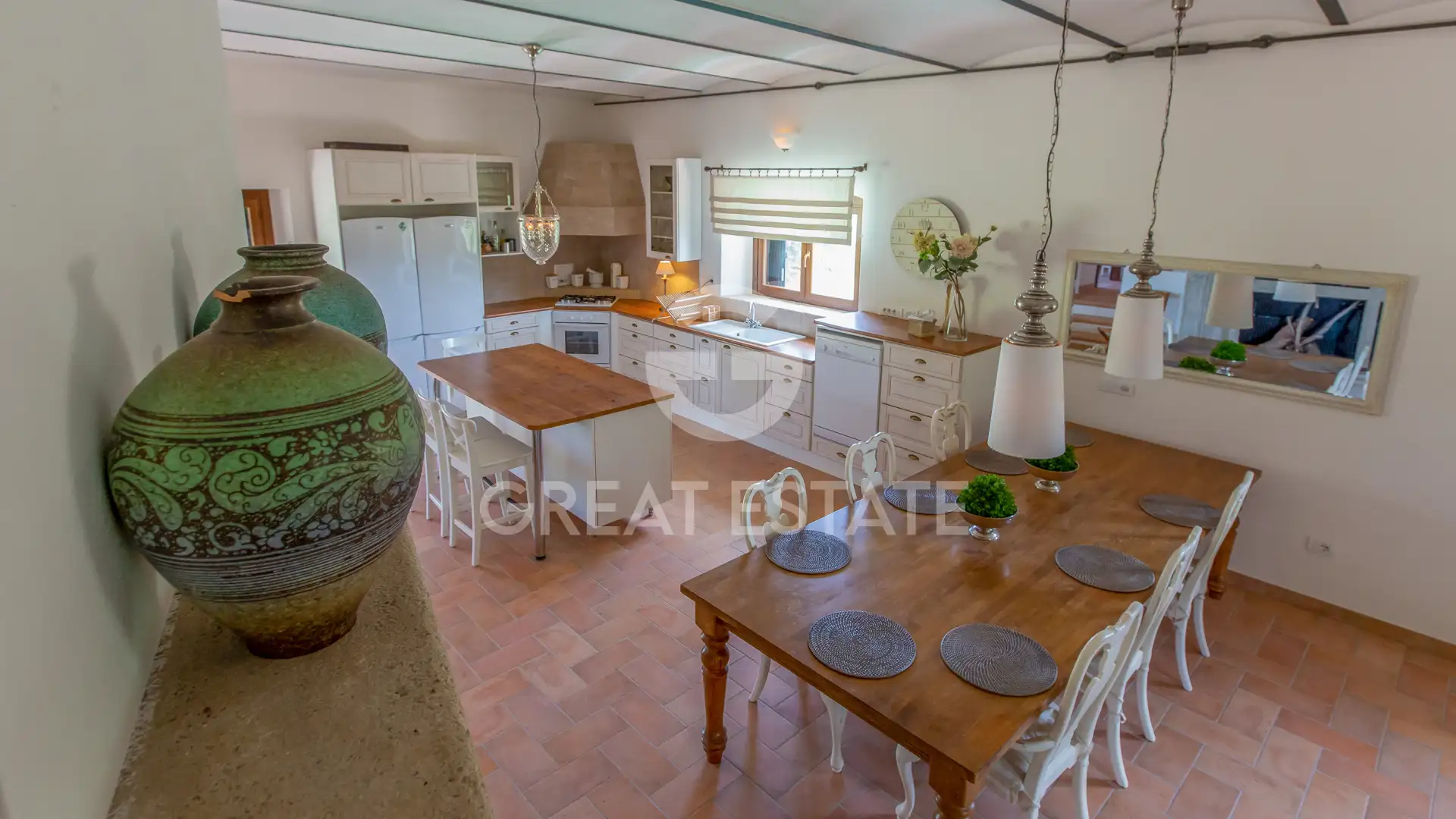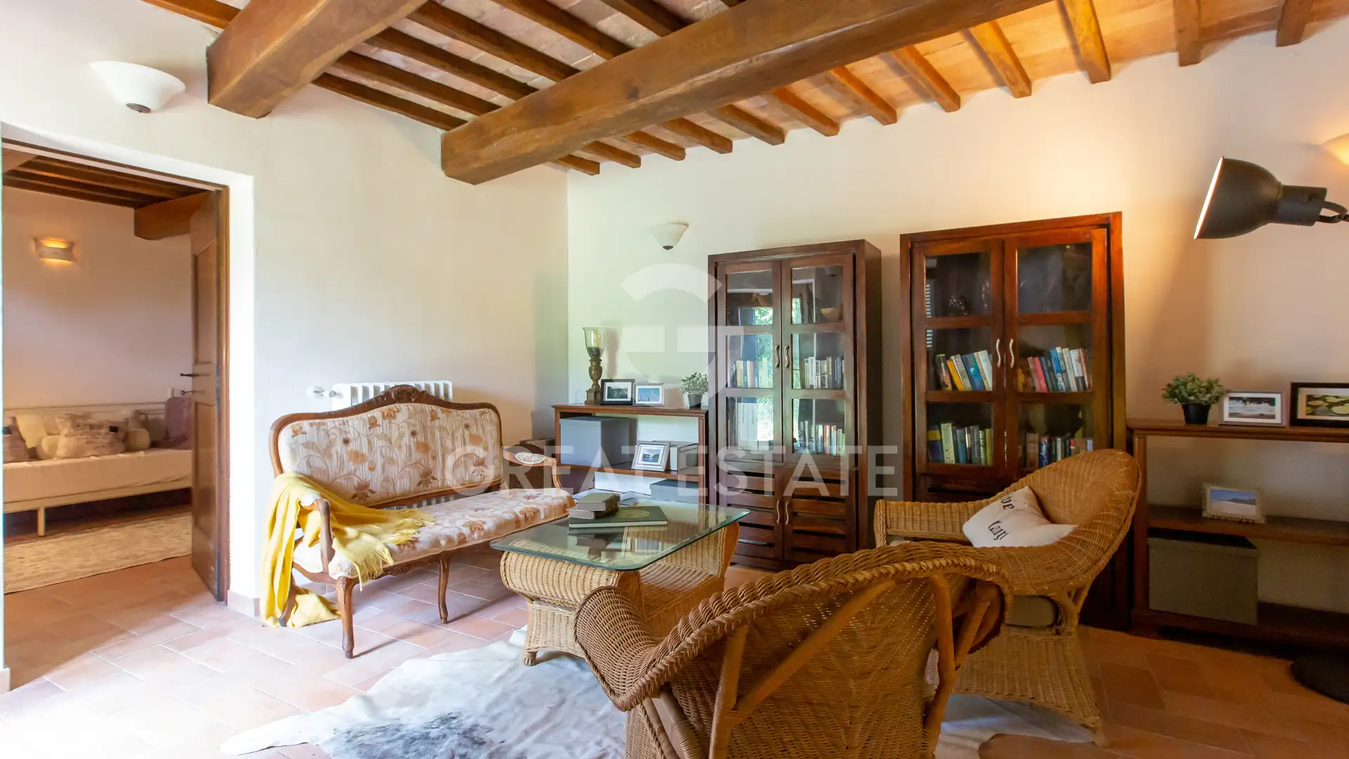 The main farmhouse measures about 360 sqm over three levels. On the ground floor, a spacious portico leads into the living area: a kitchen with central island and custom-made furnishings, dining room and living room with stone fireplace; the study with fireplace creates an intimate space for work or reading. Completing this level are a bathroom with sauna, laundry room, storage room and technical room. Terracotta floors, exposed beam ceilings and refined finishes enhance the historic character of the building.