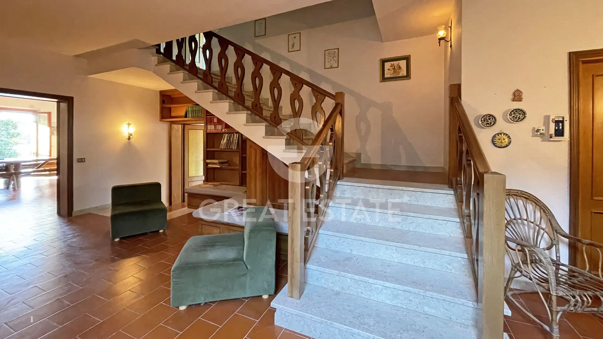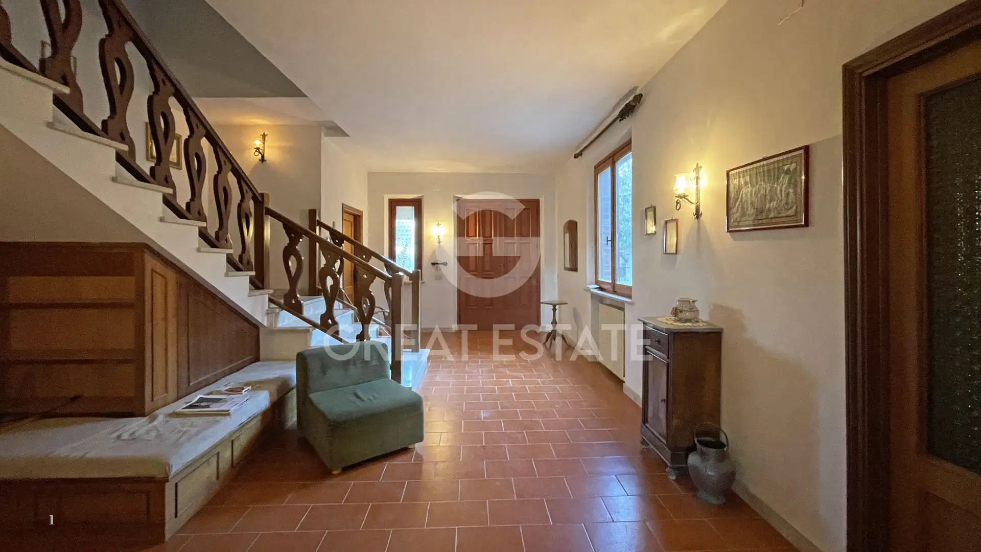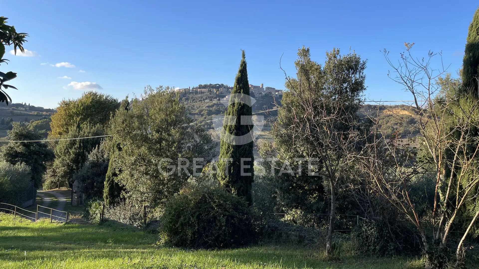 This charming property enjoys an ideal location, just a short walk from all main services, while offering the peace and allure of the Tuscan countryside, with splendid views over Montepulciano. The residence spans a total surface area of 354 sq m arranged over two levels, in addition to a basement level housing a spacious 87 sq m garage. On the ground floor, a generous entrance welcomes you and leads to a bright living room with two external accesses, one of which opens directly onto the portico, a dining room that is also filled with natural light and features two exits to the garden, one overlooking a second portico ideal for al fresco lunches and dinners, a kitchen, a bedroom, and a bathroom. The first floor hosts an additional living area with a large lounge and dining space, a kitchen, and a storage room; these rooms offer the possibility of dividing the property into two independent residential units, as well as a sleeping area comprising four bedrooms, one of which includes an en-suite bathroom, and a second bathroom serving the remaining bedrooms. The basement level features the 87 sq m garage with a technical room and a characteristic cellar area. The property is completed by an external annex, once used as stables, which retains the charm of traditional Tuscan rural structures. Finally, the estate is surrounded by a private park of approximately 2,045 sq m, perfect for relaxation and for fully enjoying summer days in complete privacy.