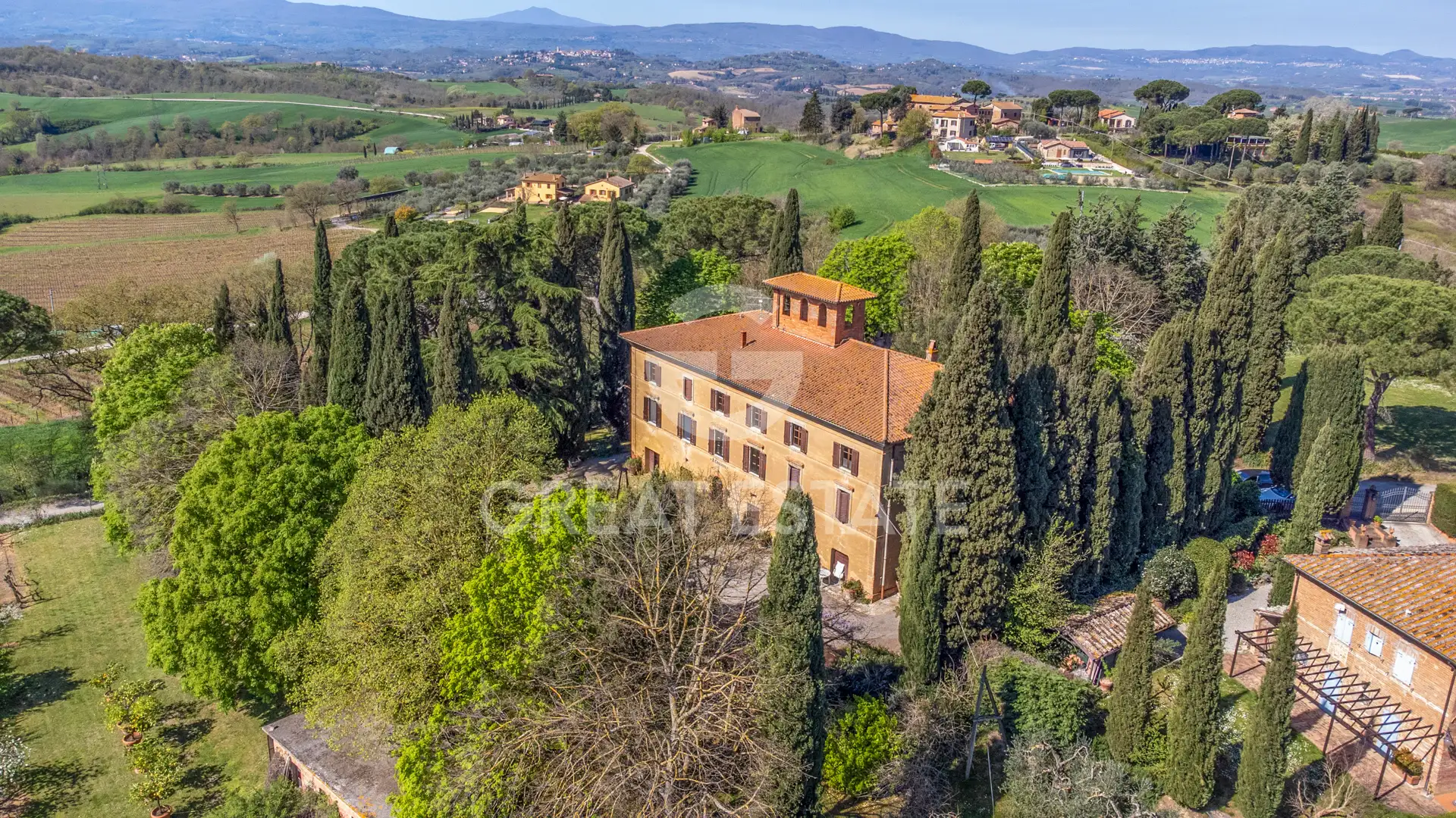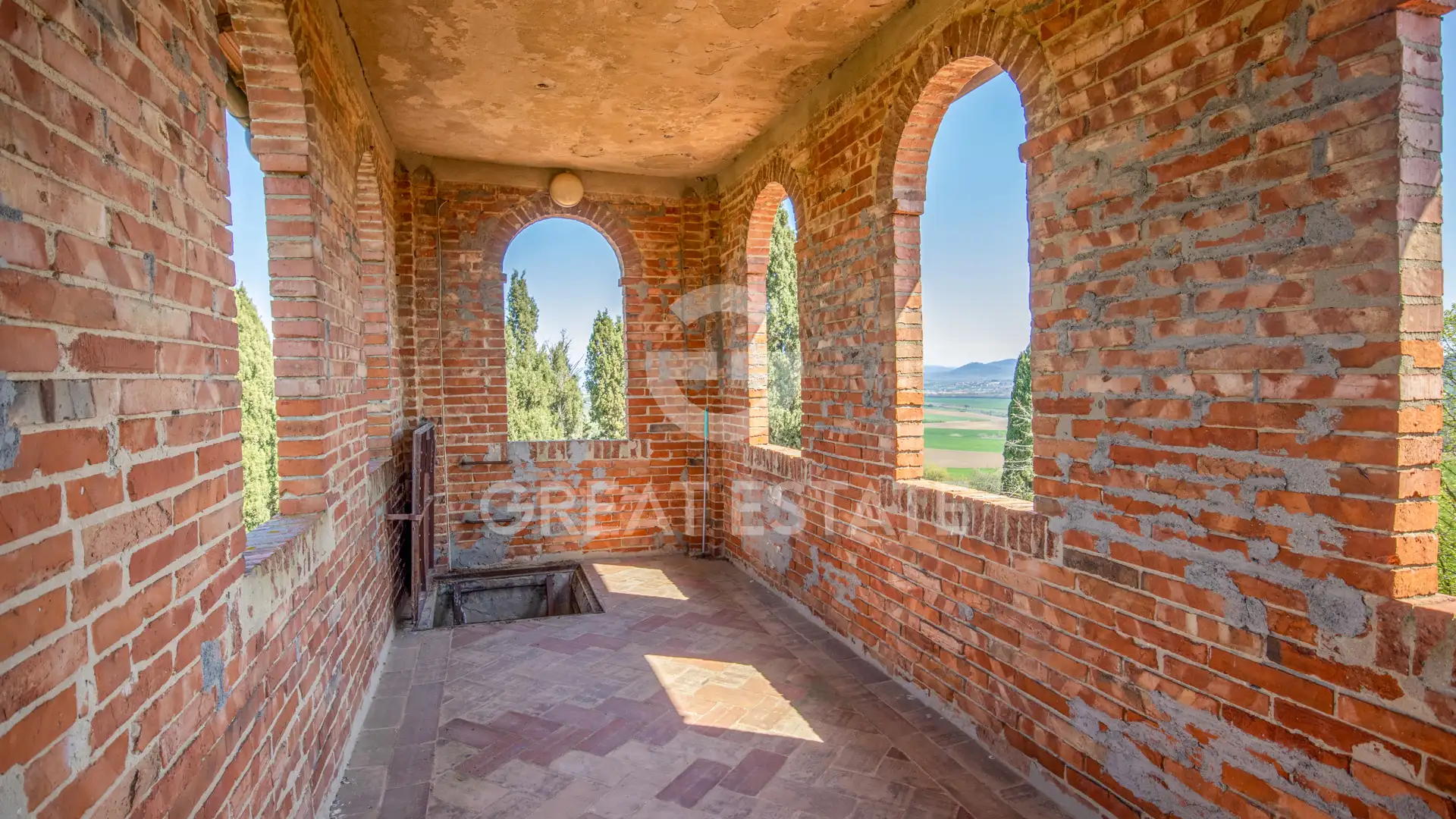 The main entrance opens into a spacious reception hall with high ceilings and terracotta flooring, from which the vertical connection develops via an internal staircase leading to the upper floors. The interiors are distributed across 16 rooms in total, including living areas, reception rooms, and bedrooms that retain original features such as wooden beams, arches, and thick masonry walls. The windows, overlooking the greenery and rolling hills, enhance the natural brightness ensured by the southern exposure.