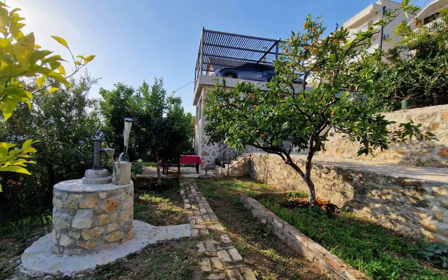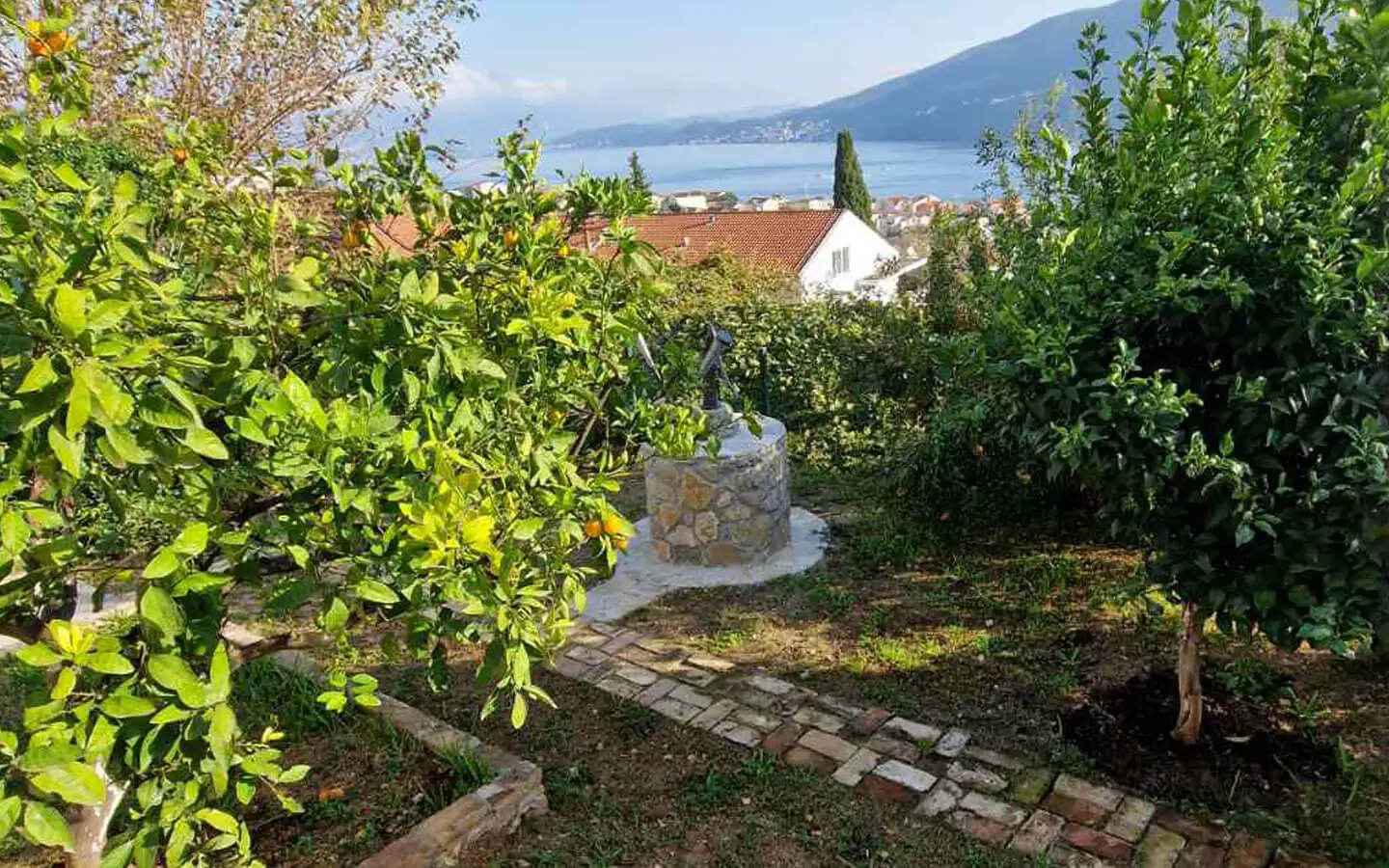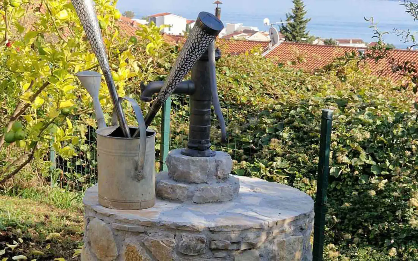 The property is surrounded by a beautiful Mediterranean garden with fruit trees, creating a peaceful and authentic coastal atmosphere. There is a landscaped yard with greenery and natural shade, a traditional stone well that adds charm and historical character, and a terrace with stunning sea views, perfect for relaxing and entertaining with family and friends.