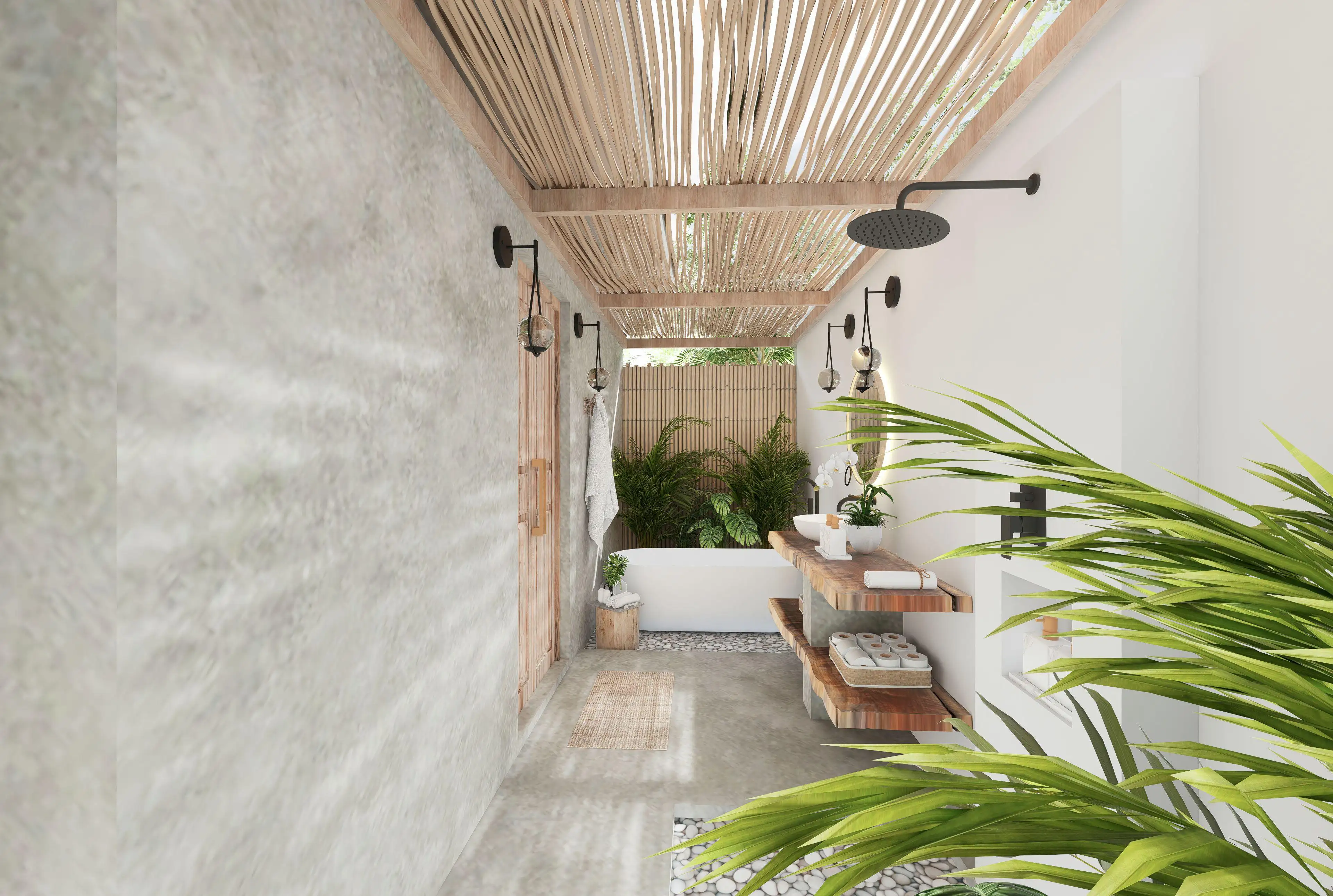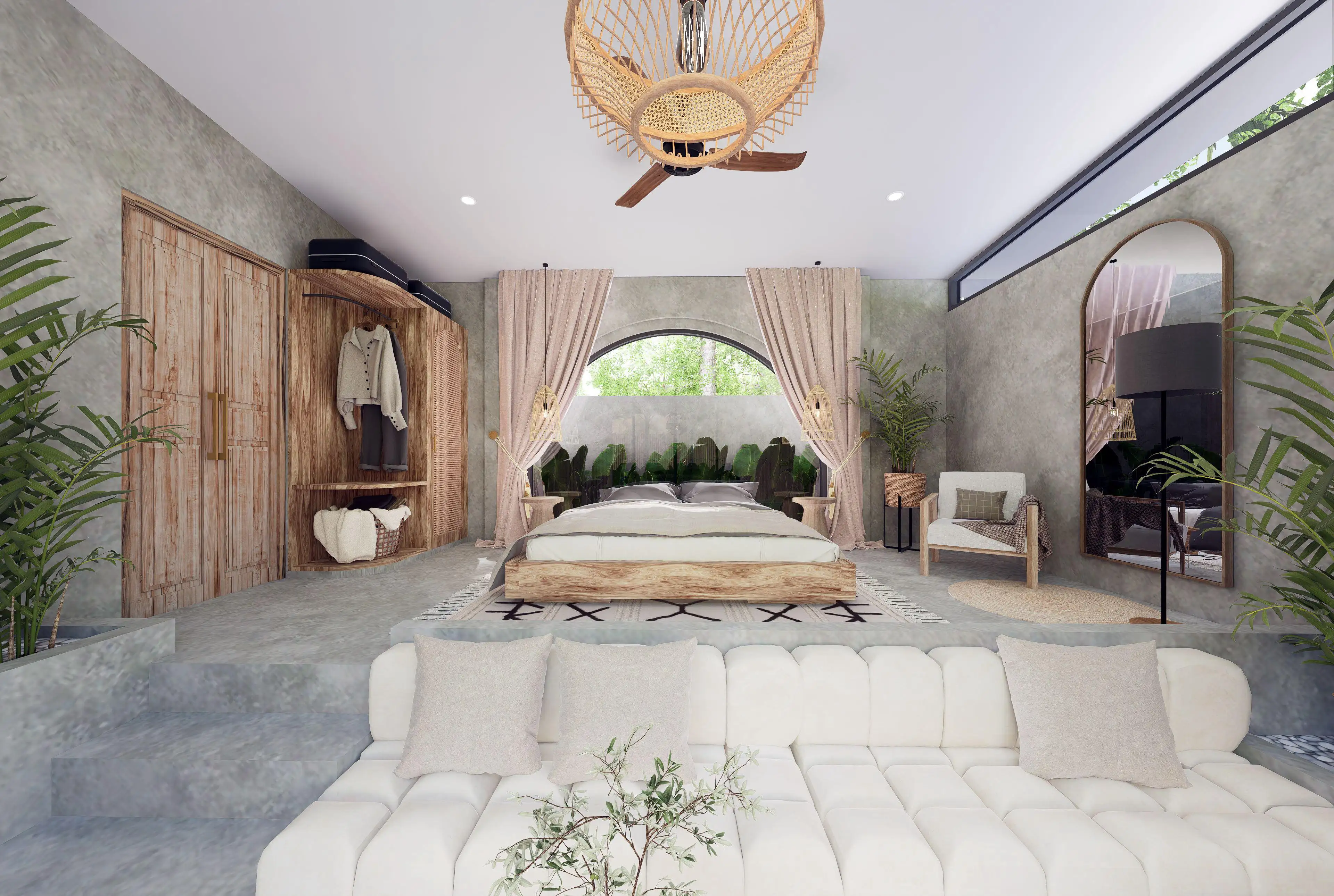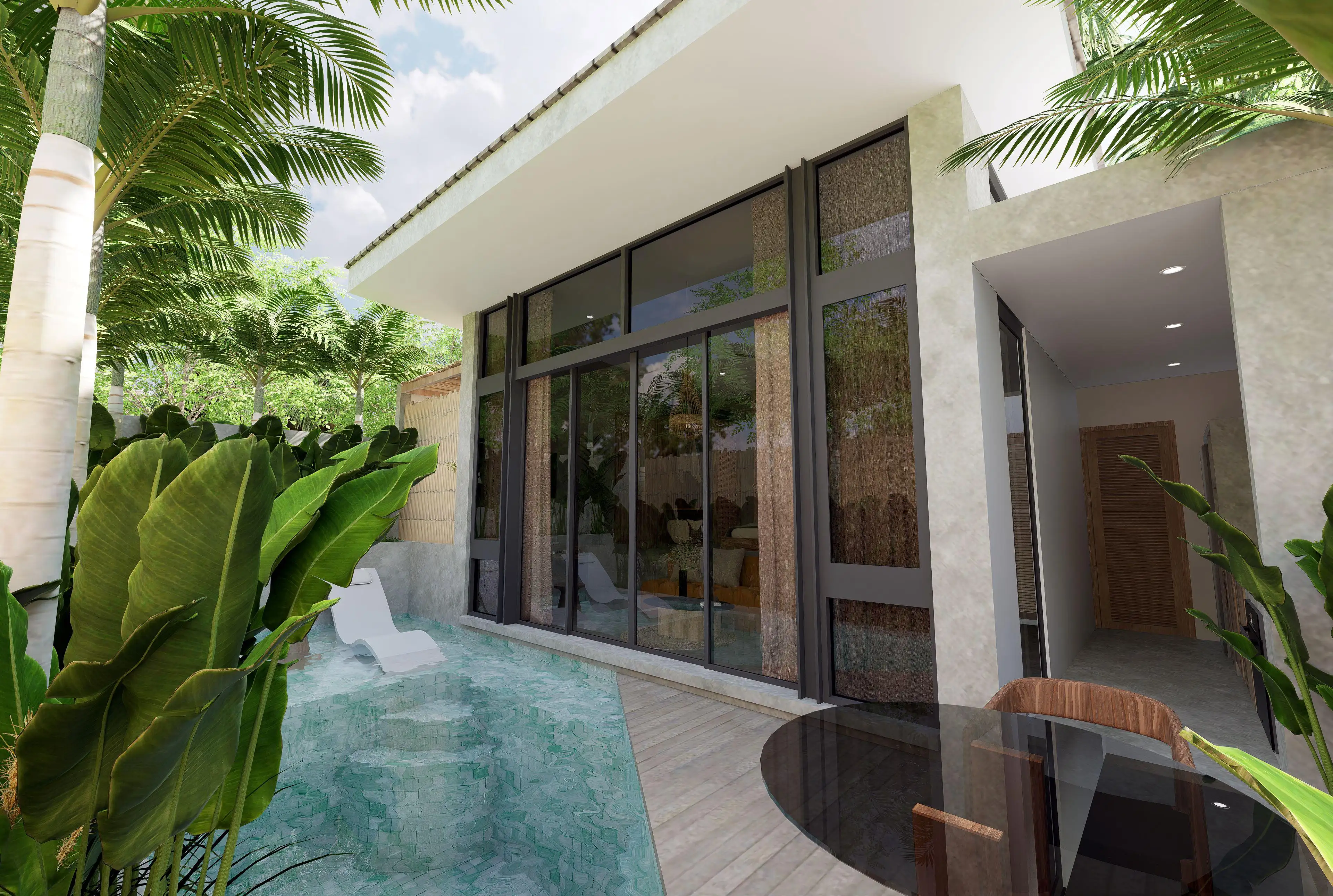 The complex is situated in a strategic location, far from the bustling crowds yet still accessible to key destinations around the Bukit area. Its tranquil surroundings and elevated position create a perfect balance between privacy and convenience, making it appealing for both short-term rentals and long-term stays. The design maximizes comfort while maintaining a strong focus on modern tropical living.