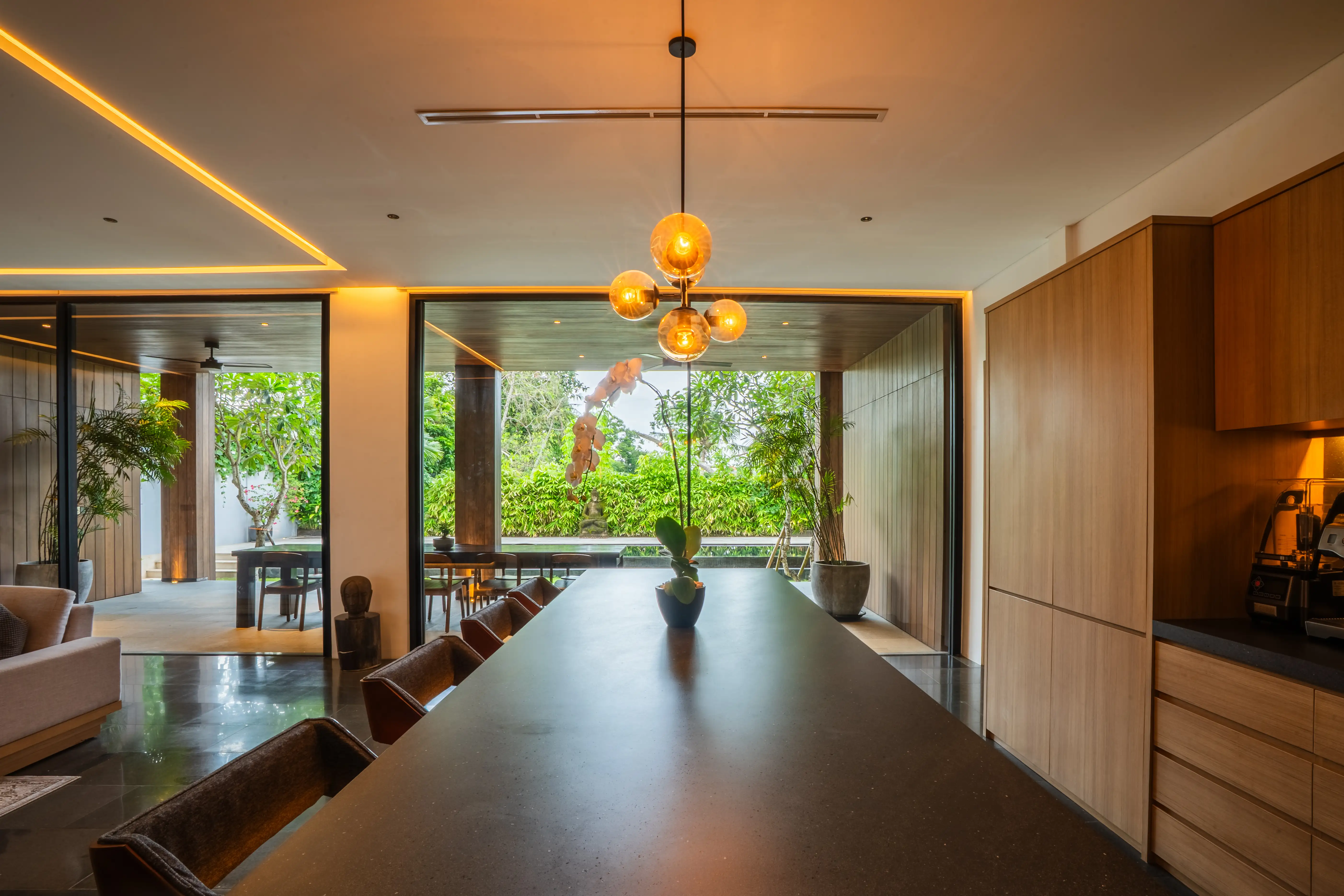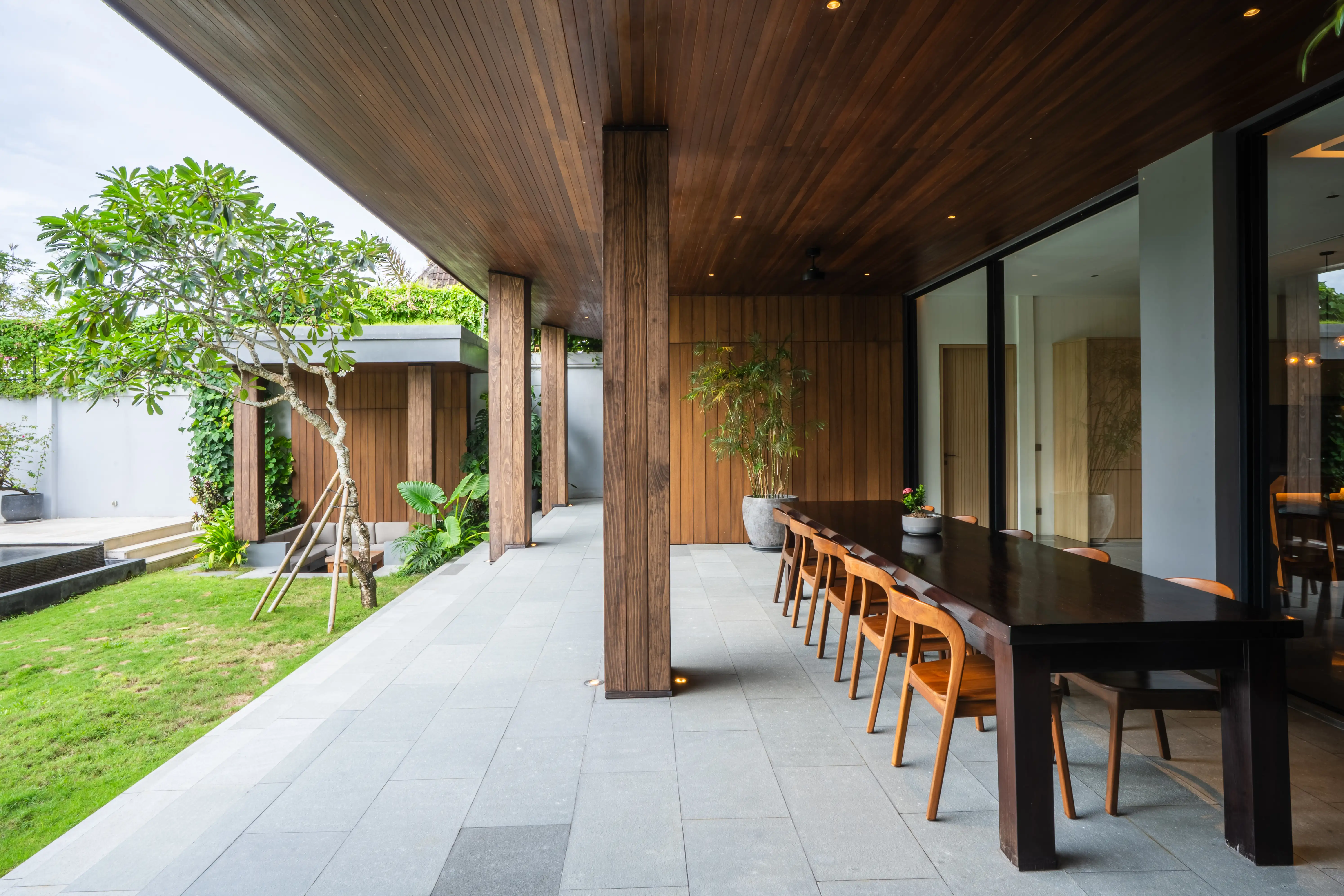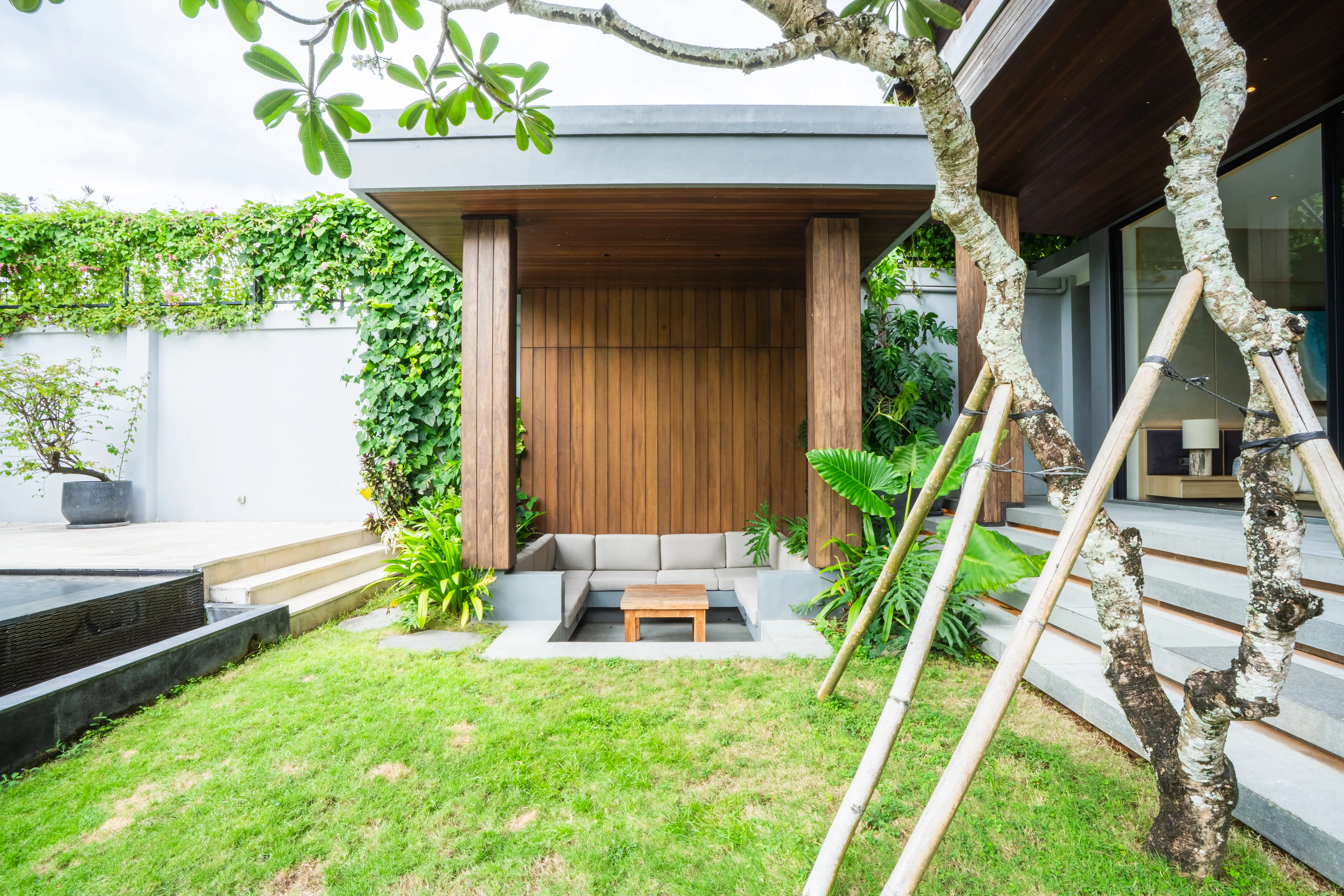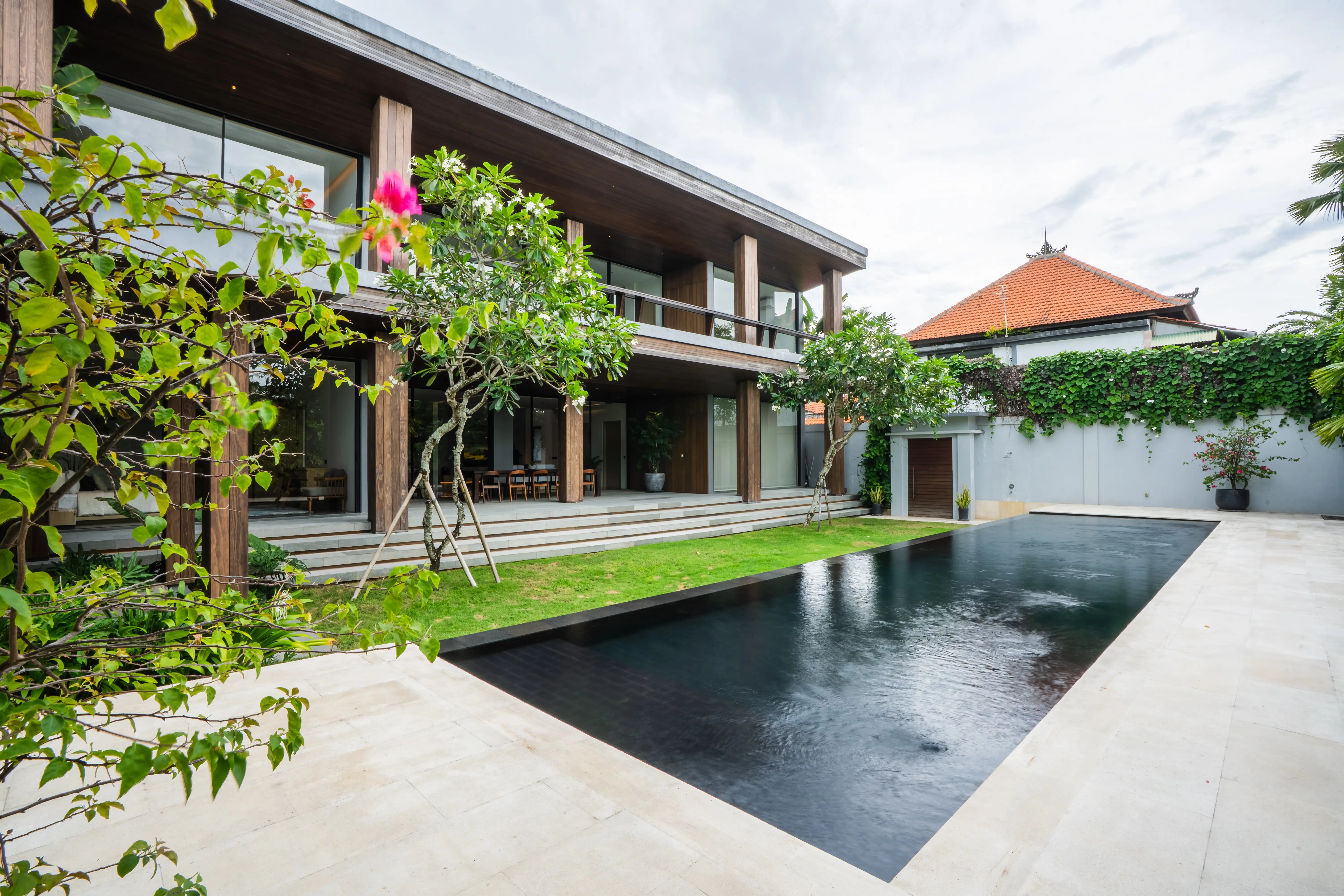 A large private swimming pool is complemented by a sunken gazebo, outdoor sitting/dining spaces, tropical garden areas, and additional storage for sunbeds and beanbags—perfect for relaxing days at home or welcoming guests. A shaded parking area accommodates a car and motorbikes comfortably. Practical features include strong electricity capacity (separate lines for main and pool), deep-well water, filtration system, multiple boilers/heaters, high-speed internet, and a central AC system in the living area—supporting daily comfort and smooth villa operations.