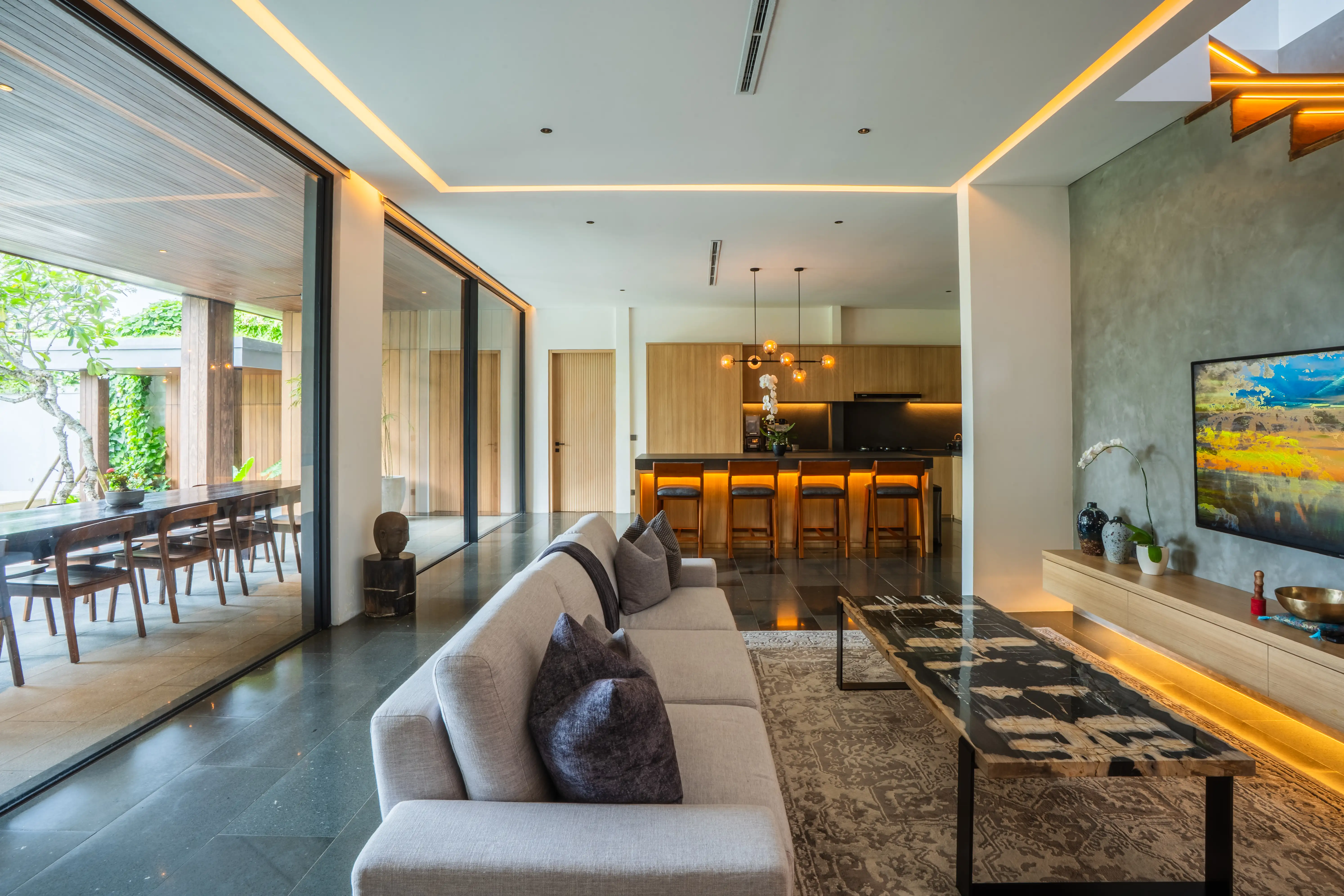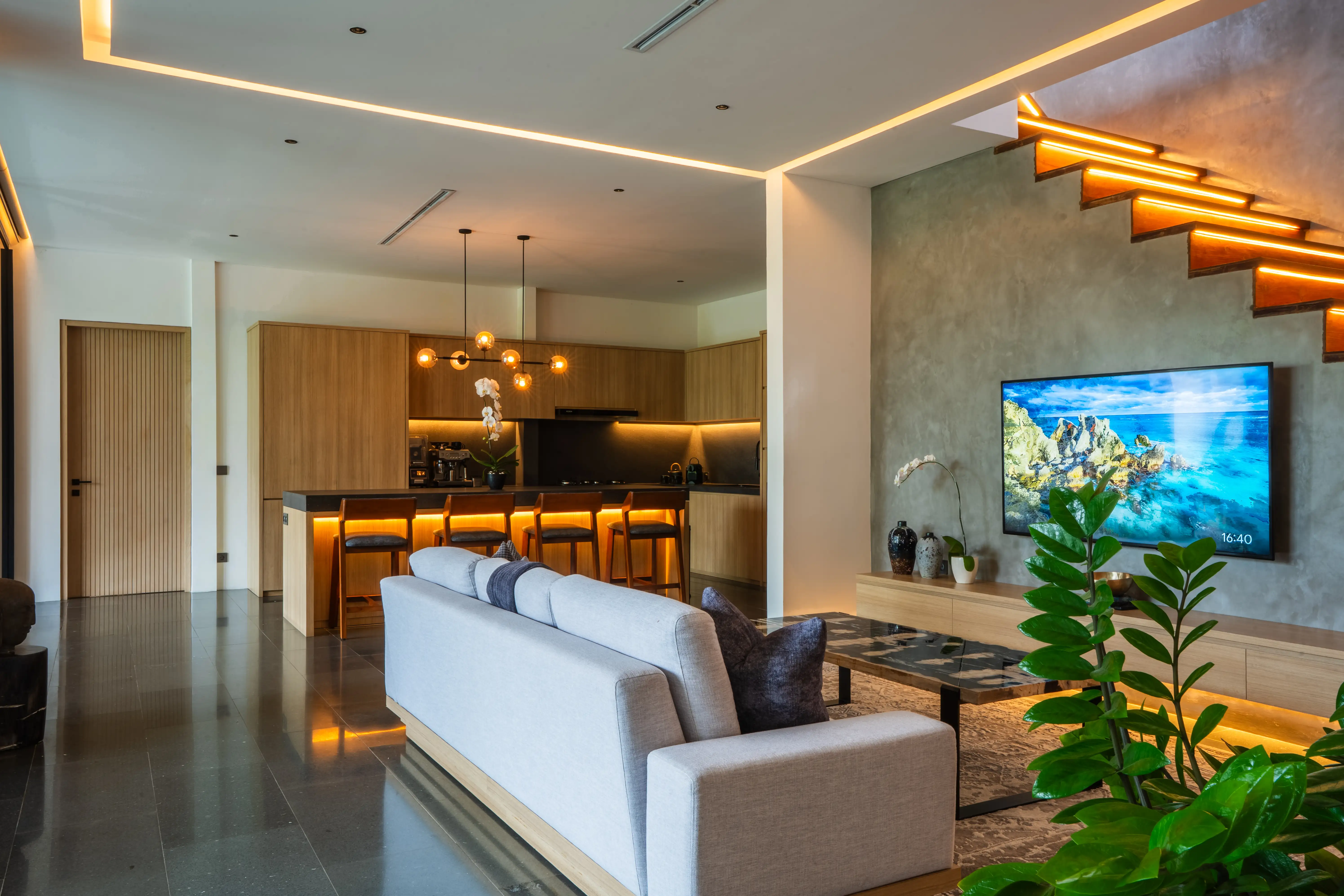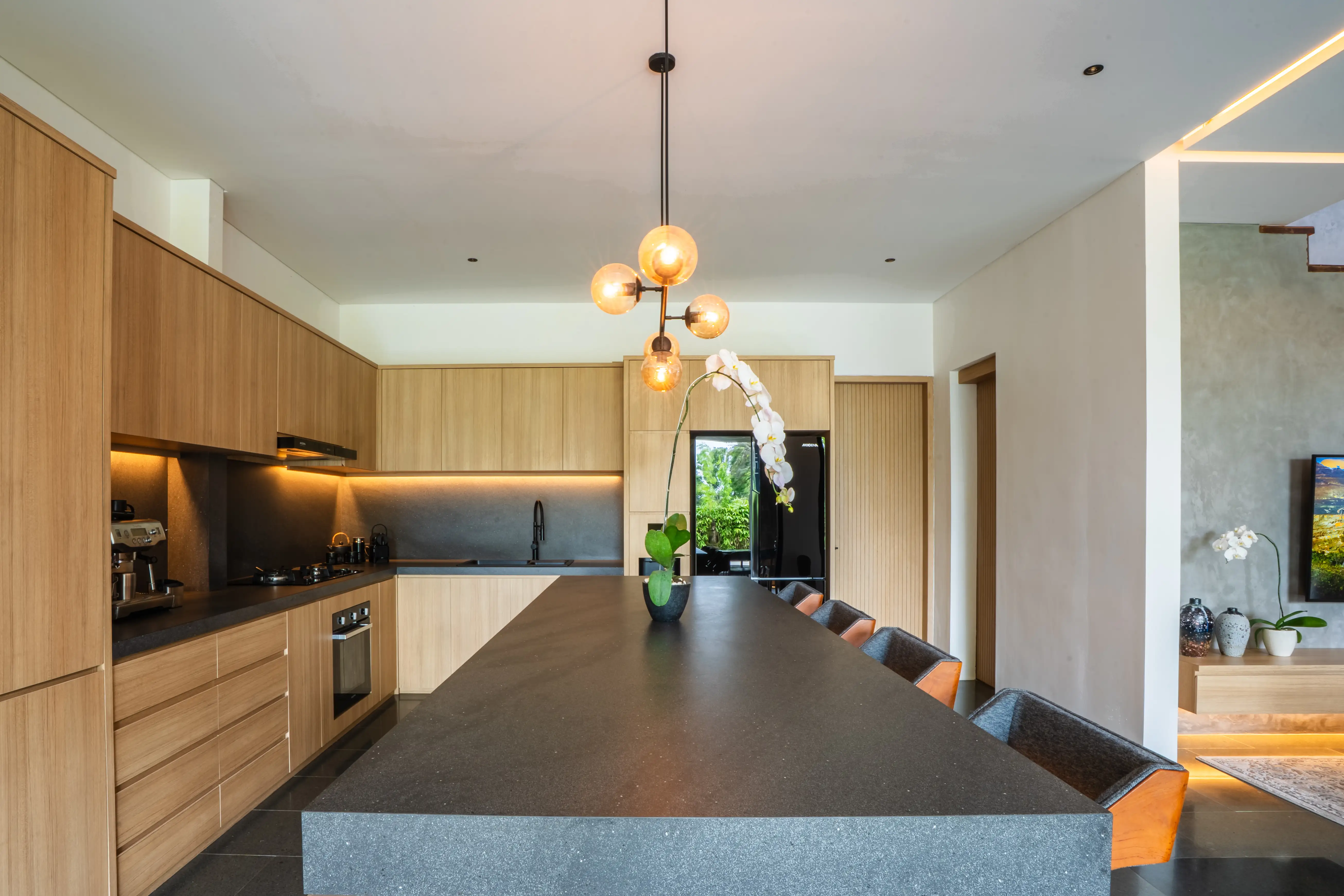 Sitting on approximately 667 sqm of land with a large 574 sqm building, the villa delivers space on a level rarely found in the area. The layout includes 4 massive bedrooms and a total of 7 bathrooms (main, guest, and staff), making it a strong option for family living, entertaining, or luxury rental operations. The heart of the home features an enclosed living, dining, and kitchen area with a sleek island counter, modern cabinetry, and high-quality appliances—creating an atmosphere that feels both elegant and functional. A separate dirty kitchen adds convenience for daily cooking or hosting, while extra spaces such as a family/TV room, service (wash & dry) area, storage room with racks, and an open area that can be used as a studio or home office elevate the villa’s livability. The master suite also includes a walk-in wardrobe, emphasizing comfort and privacy.Outdoors, the villa provides a complete resort-style experience.