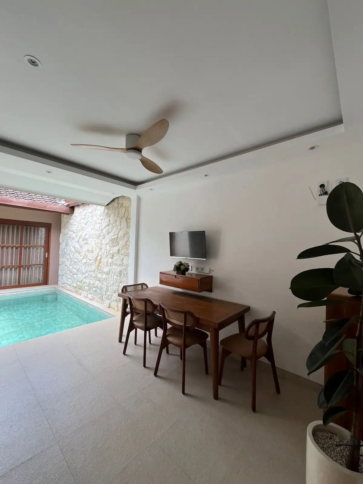 This leasehold villa sits on a 100 sqm plot with an 80 sqm building size, thoughtfully designed to maximize comfort in a compact layout. It features one bedroom and two bathrooms, complemented by an open living room, dining area, and a fully equipped kitchen set. Fully furnished and complete with a private pool and car parking, the villa is ready for immediate personal use or rental. The layout allows for a seamless indoor–outdoor flow, creating a comfortable atmosphere that feels practical yet inviting for everyday living.