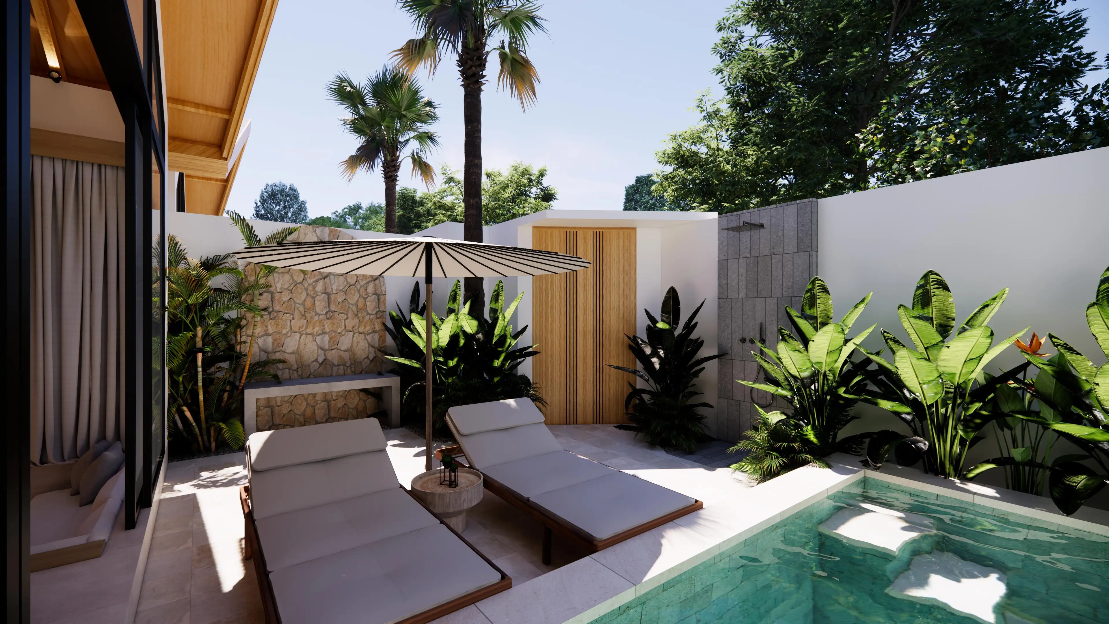 Stepping outside, the villa reveals a compact yet inviting outdoor area with a private pool of roughly 10 sqm, surrounded by greenery that enhances the sense of seclusion. A pair of sunbeds and a shaded seating zone create a pleasant place to unwind in the Bali sun. The villa sits on a 104 sqm land plot, organized efficiently to maximize usable space while maintaining an intimate tropical atmosphere. With a peaceful neighborhood setting and only a short drive to Melasti, Balangan, and Padang-Padang, the location offers easy access to beach clubs, dining spots, and cultural landmarks such as GWK. This makes the property suitable for individuals or couples who want a well-designed home with access to the best parts of South Bali.