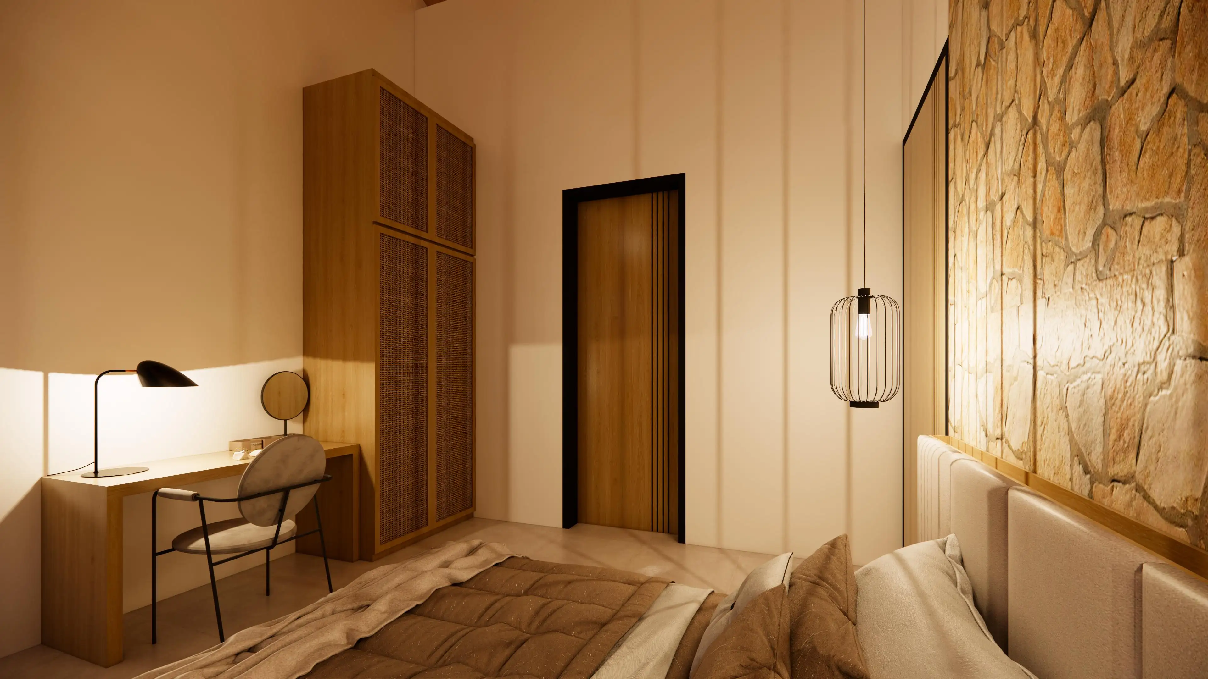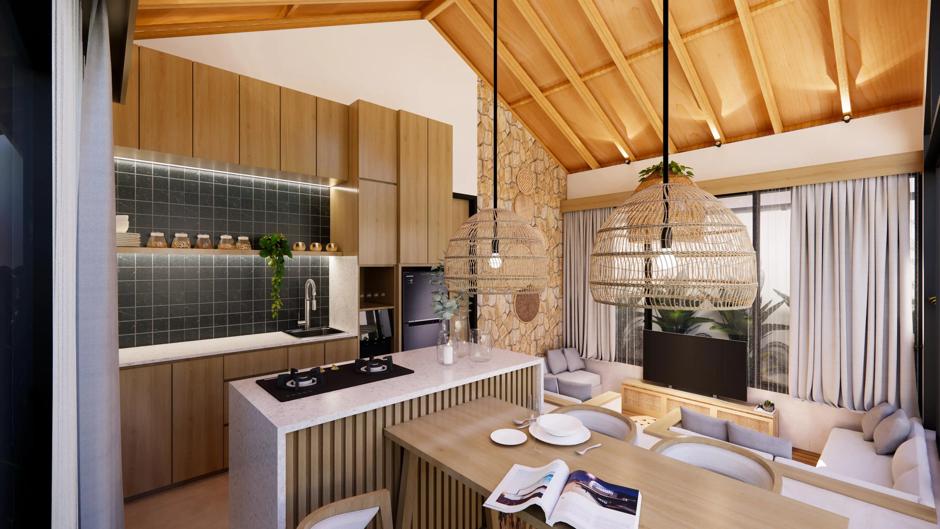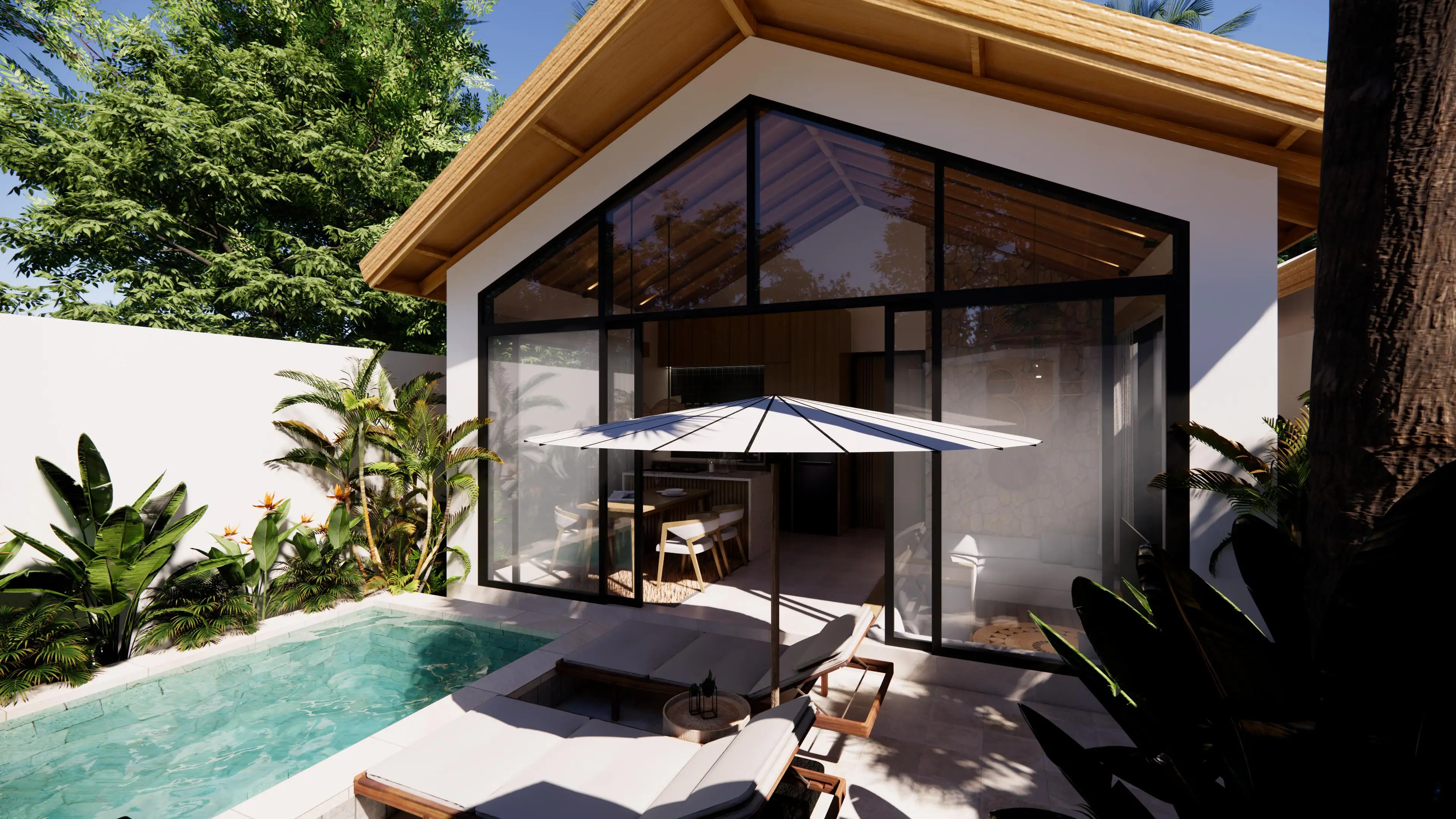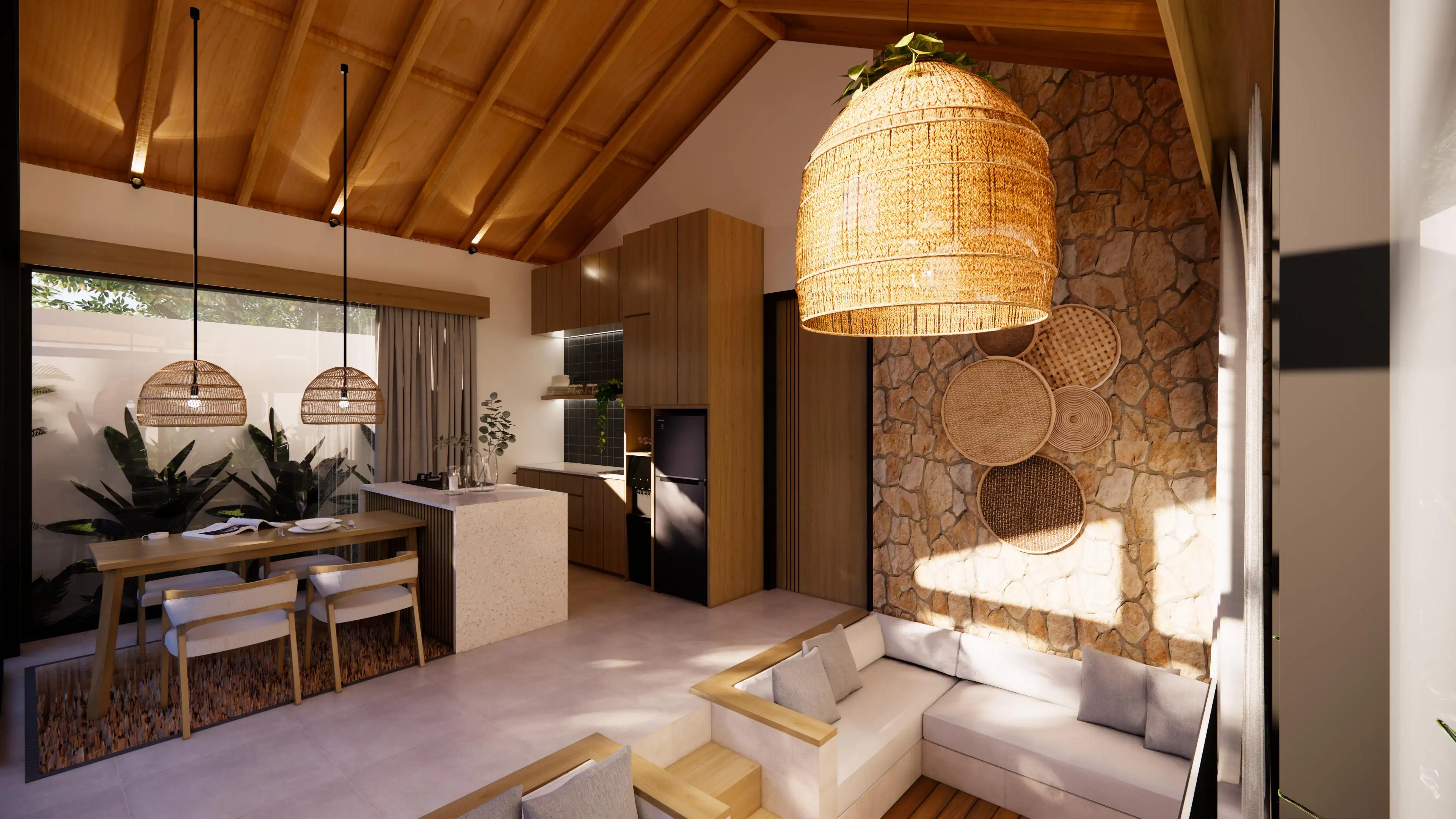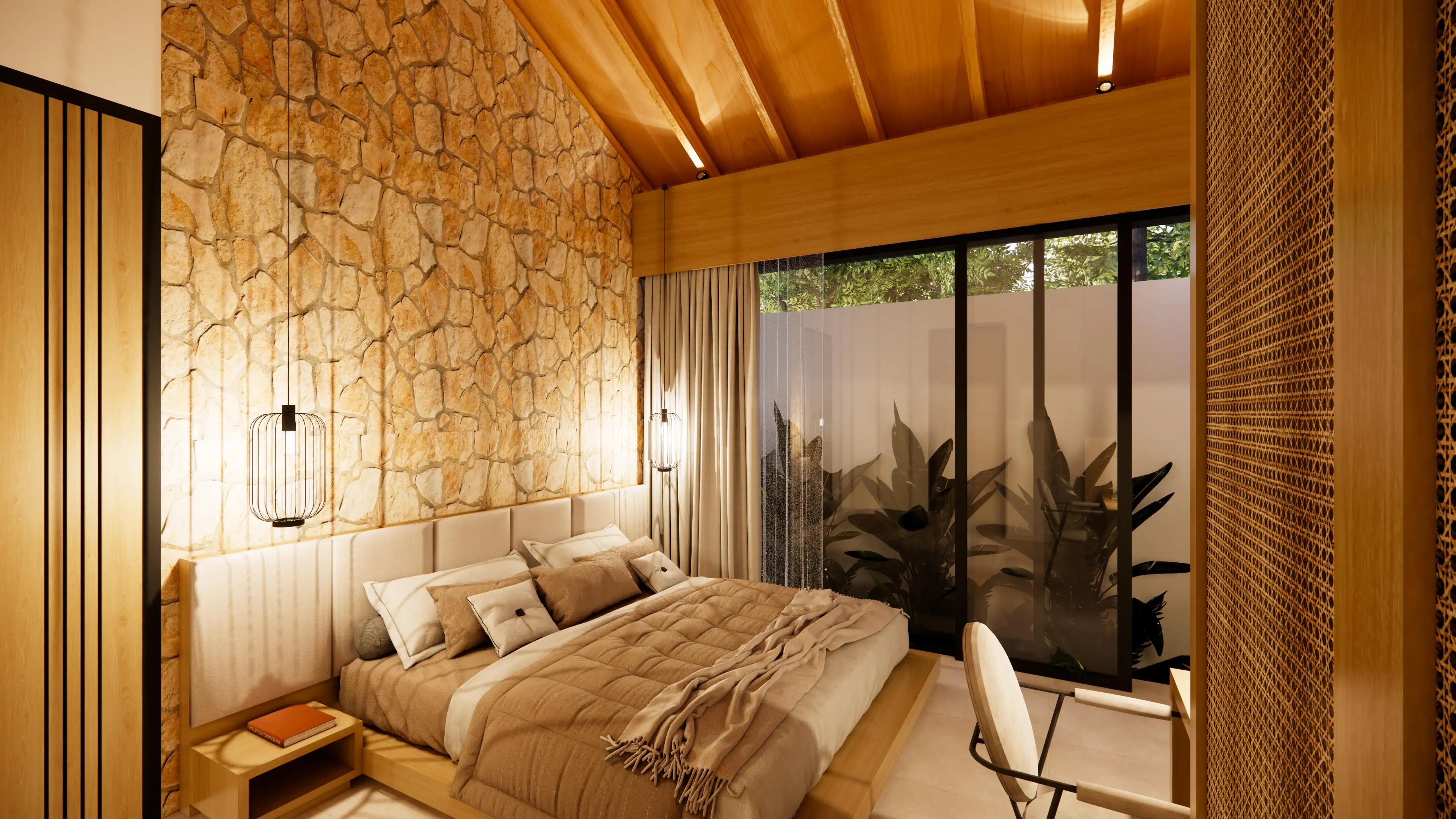Inside, the villa opens into an enclosed living area that blends seamlessly with the dining and kitchen space. The interior styling features light natural tones, woven textures, and soft lighting that warm the entire room. The kitchen is equipped with modern cabinetry, stone finishes, and practical storage, making it suitable for both longer stays and everyday convenience. The bedroom, with its stone accent wall and floor-to-ceiling windows facing tropical plants, feels private and serene. With approximately 14.87 sqm of bedroom space and an additional 8.12 sqm bathroom area, the layout ensures comfort without compromising flow. The bathroom includes both a walk-in shower and a soaking tub, designed with vertical windows that soften the natural daylight while maintaining full privacy.