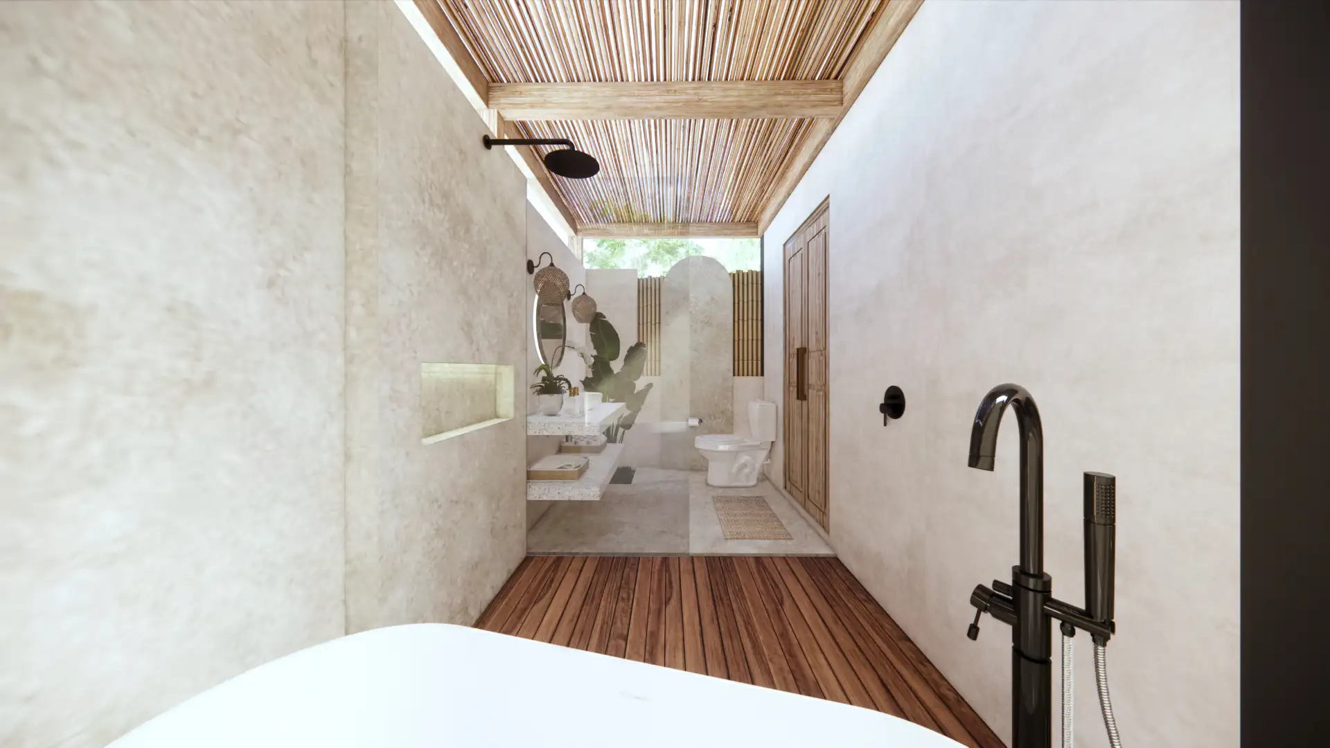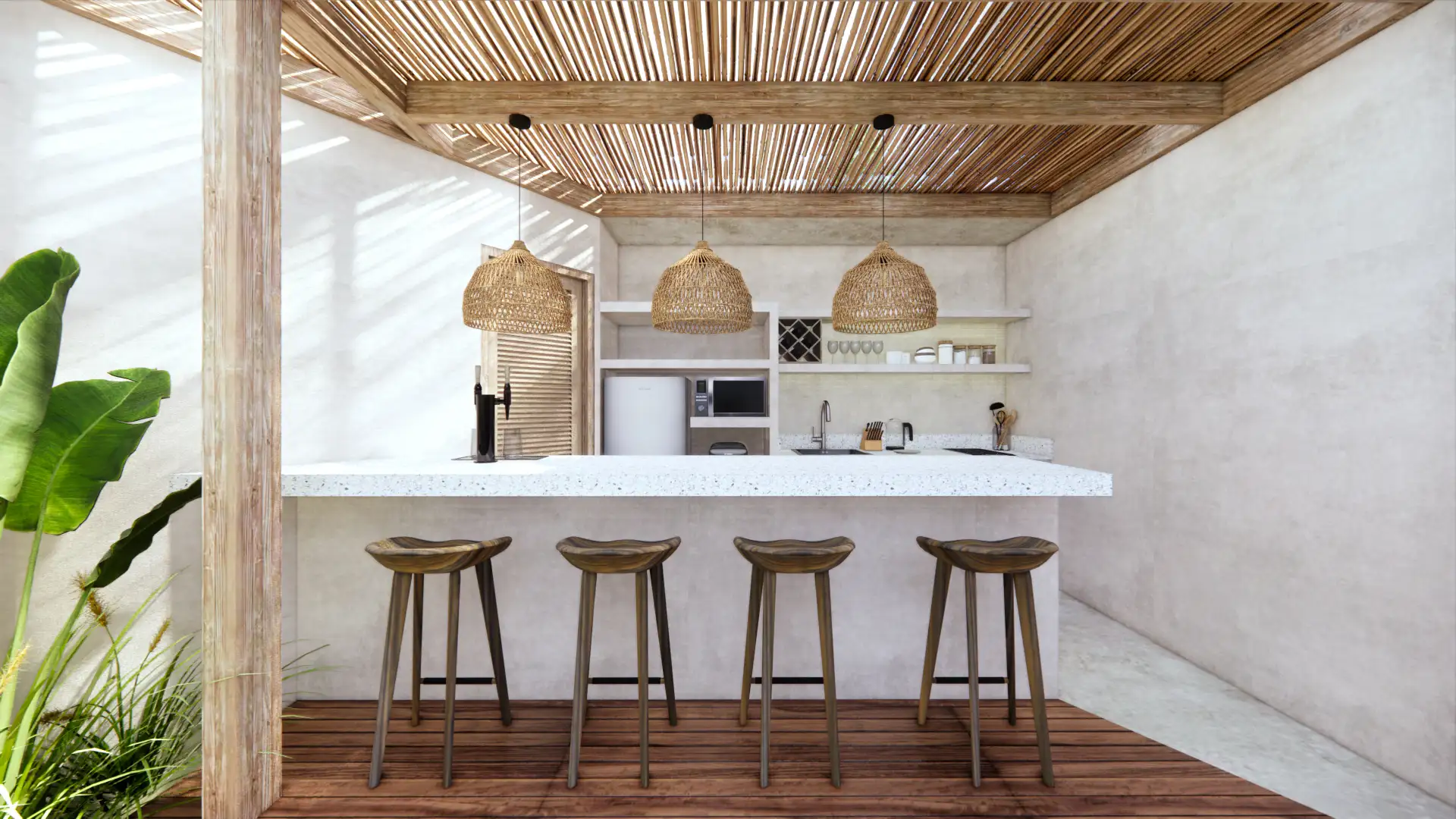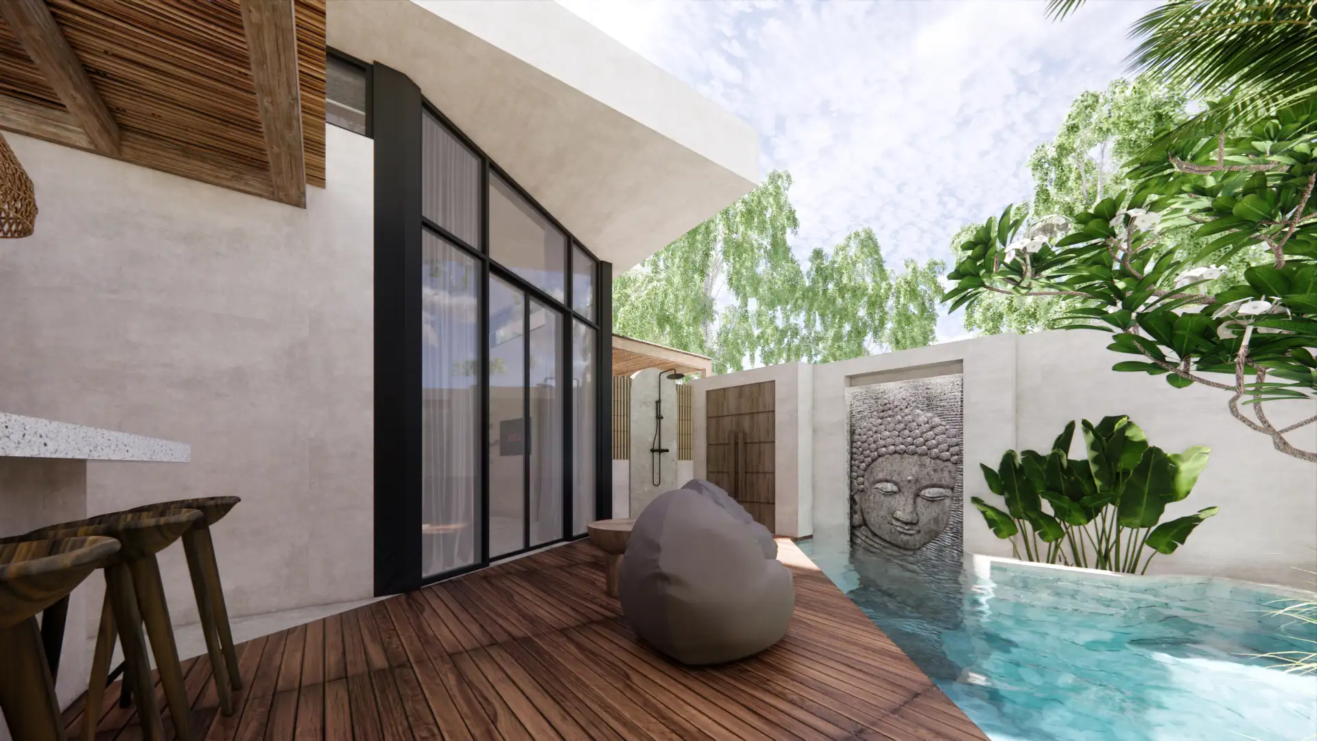 This thoughtfully designed one-bedroom villa offers an intimate and refined living experience within a compact yet beautifully arranged 90 sqm land plot with a 50 sqm building size. The layout embraces a modern open-plan concept, combining the kitchen and living area into a breezy, connected space that feels warm and welcoming. A private pool serves as the centrepiece of the outdoor area, complemented by integrated gardens that soften the architecture and bring a natural tropical rhythm to the home. With a dedicated living room, one well-appointed bathroom, high-speed internet, and a comfortable setup for hosting guests through the reception area, the villa delivers a sense of convenience and contemporary comfort ideal for daily living or short-term stays.