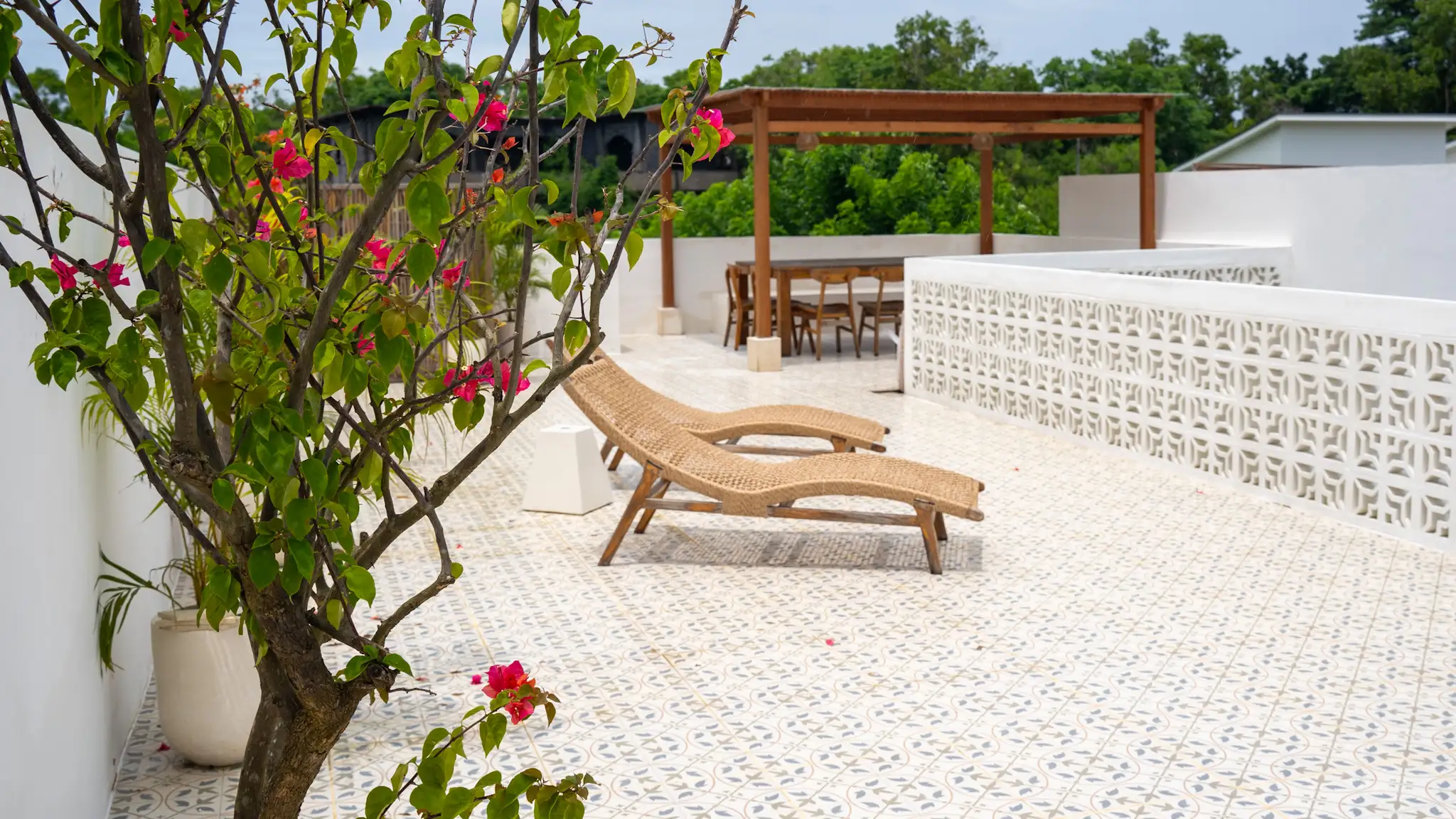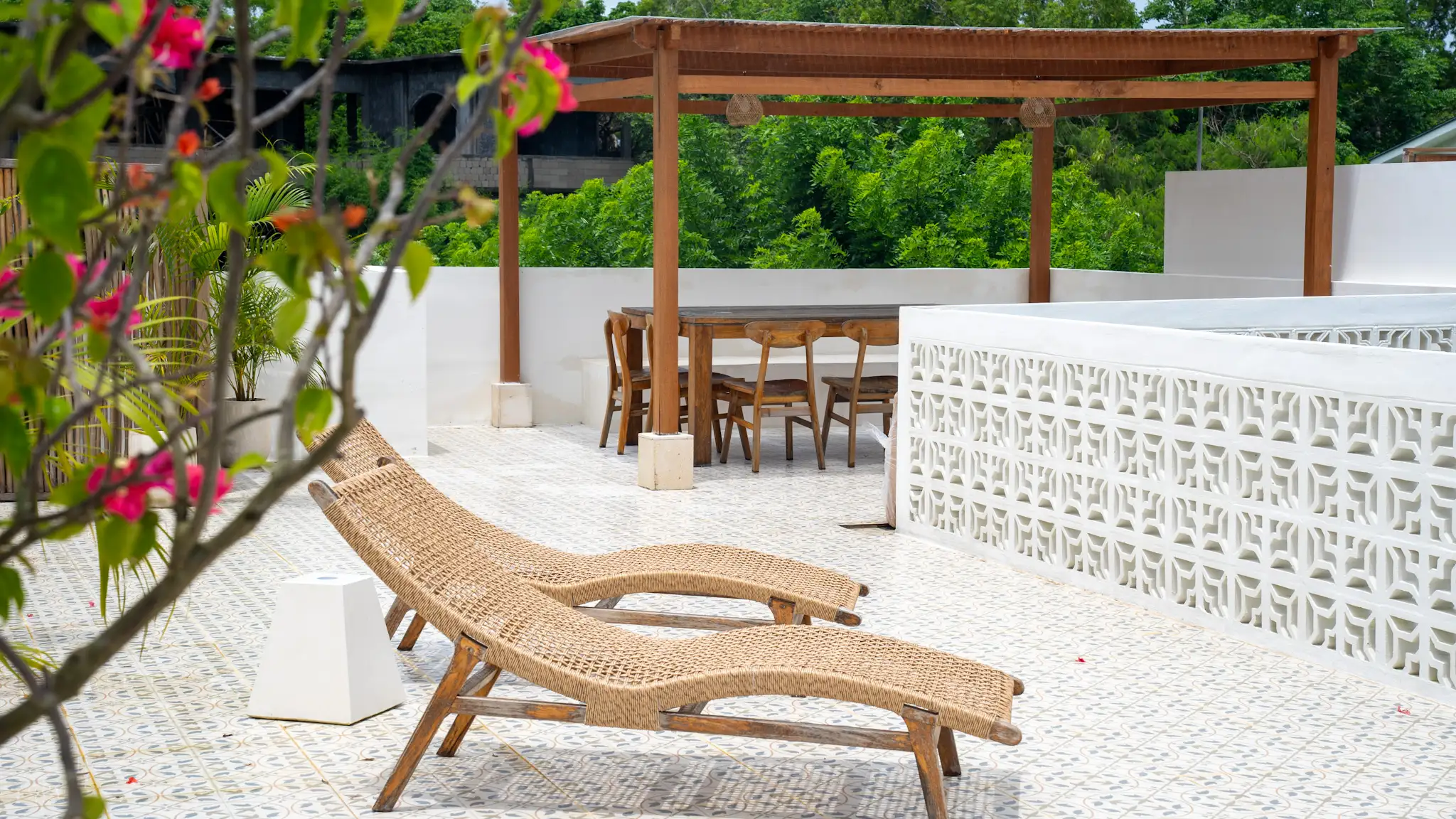Both bedrooms are designed to provide a restful retreat, complete with en-suite bathrooms, quality finishes, and natural ventilation. The master bedroom opens directly toward the pool area, creating a private resort-style experience that enhances guest appeal. The open living and dining area connects seamlessly with the compact yet functional kitchen, making it suitable for both short-term stays and longer residence. A private swimming pool and deck area form the heart of the villa, offering space for relaxation, sunbathing, and casual gatherings. The surrounding garden elements and tropical plants add a calming visual layer while maintaining easy upkeep, an important factor for owners focused on efficient property management.