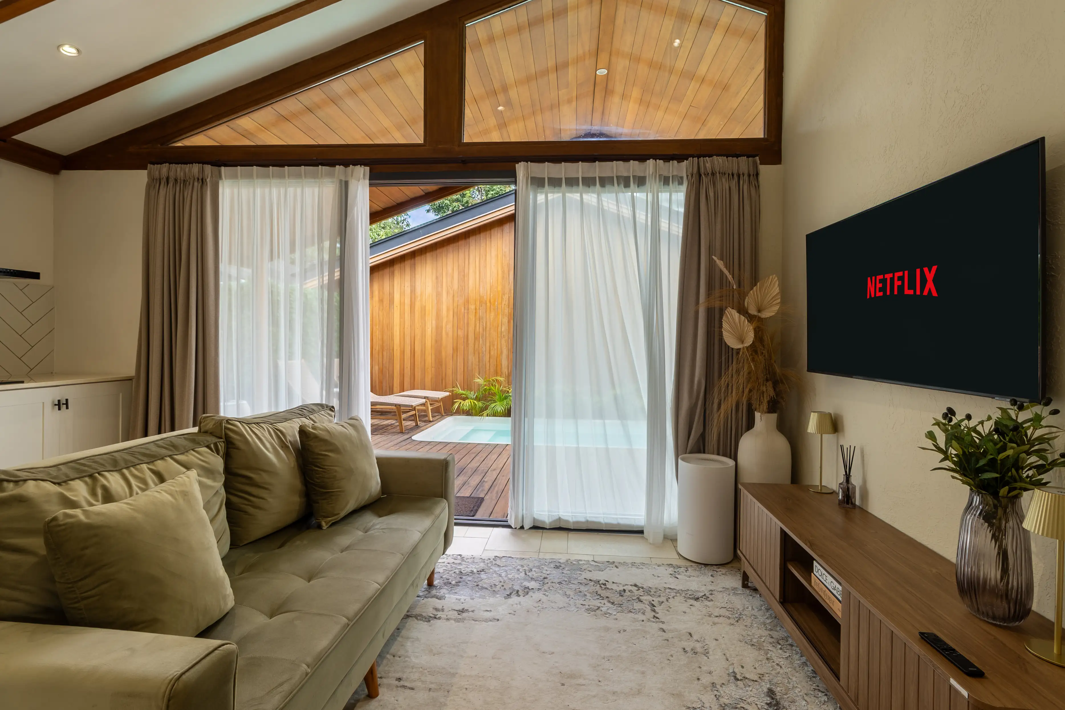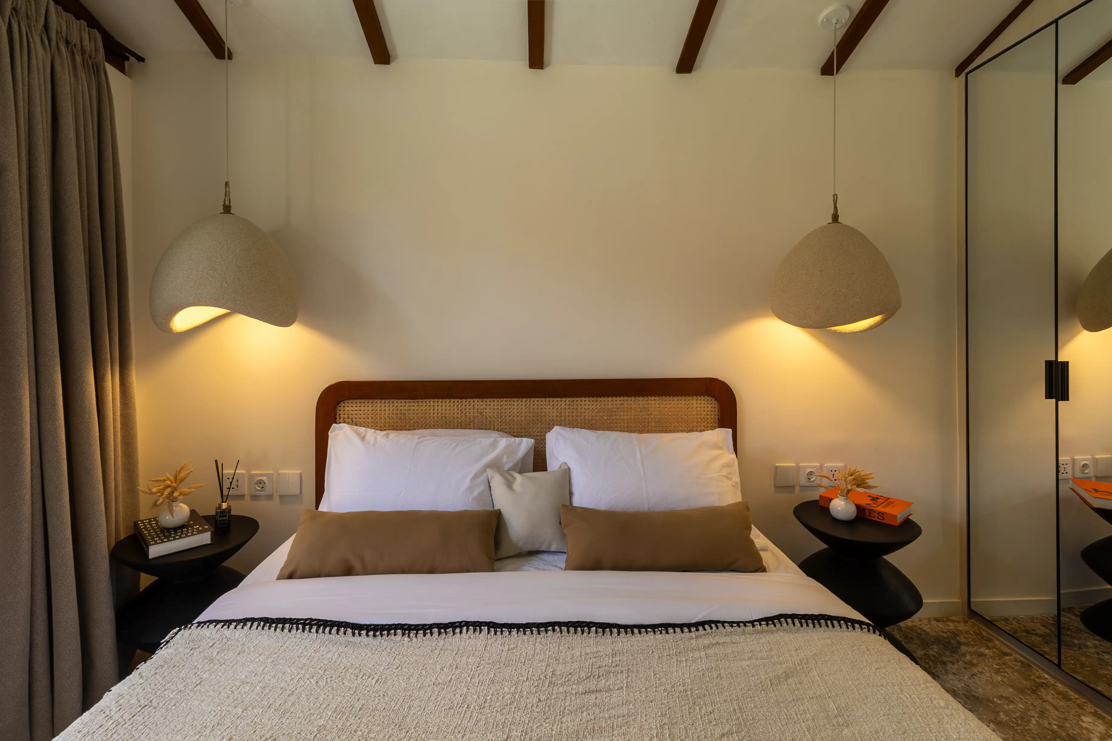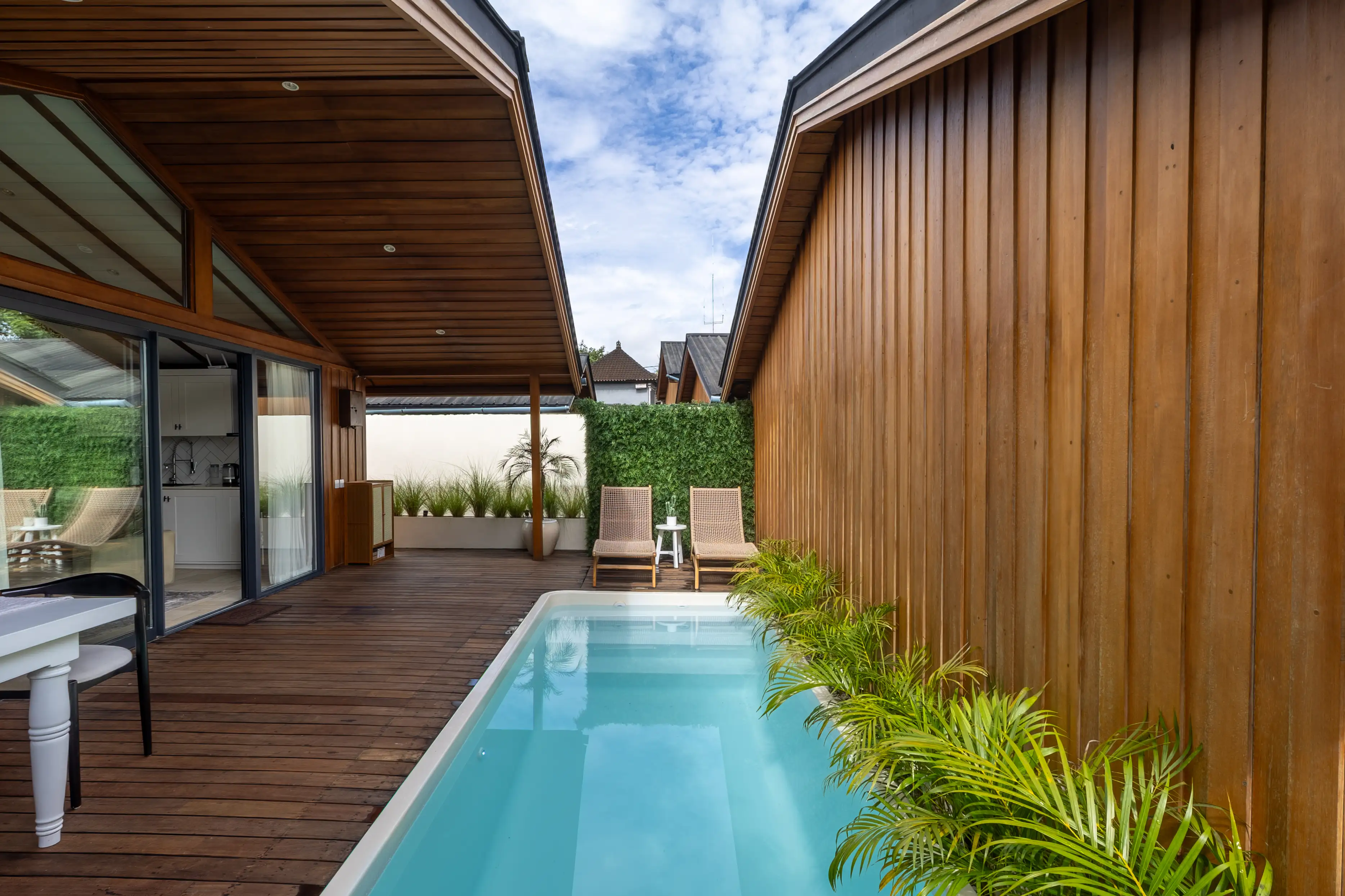 The villa comes with two well-appointed bedrooms, each designed for comfort, offering soft lighting, quality furnishings, and easy access to the outdoor areas. The living room opens directly to a private pool and sun deck, giving guests a seamless indoor–outdoor experience. This setup is ideal for holiday rentals, as it delivers the kind of privacy and convenience many travelers look for in Bali. The villa’s thoughtful layout ensures efficient use of space, making the 109 sqm land feel open, functional, and relaxing. With beaches only 10 minutes away, residents can easily reach some of the most beautiful coastlines in the Bukit area, from Melasti to Pandawa.