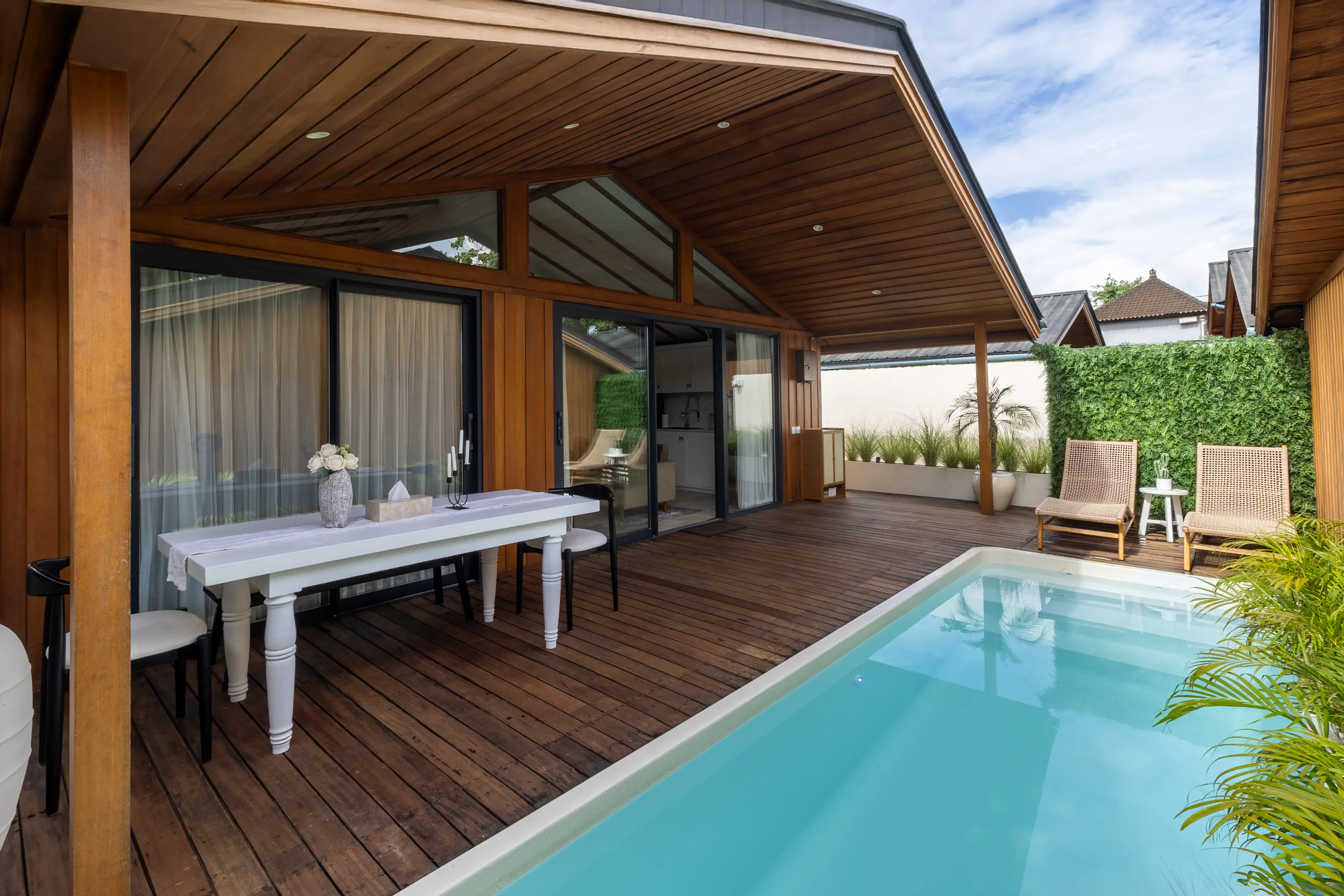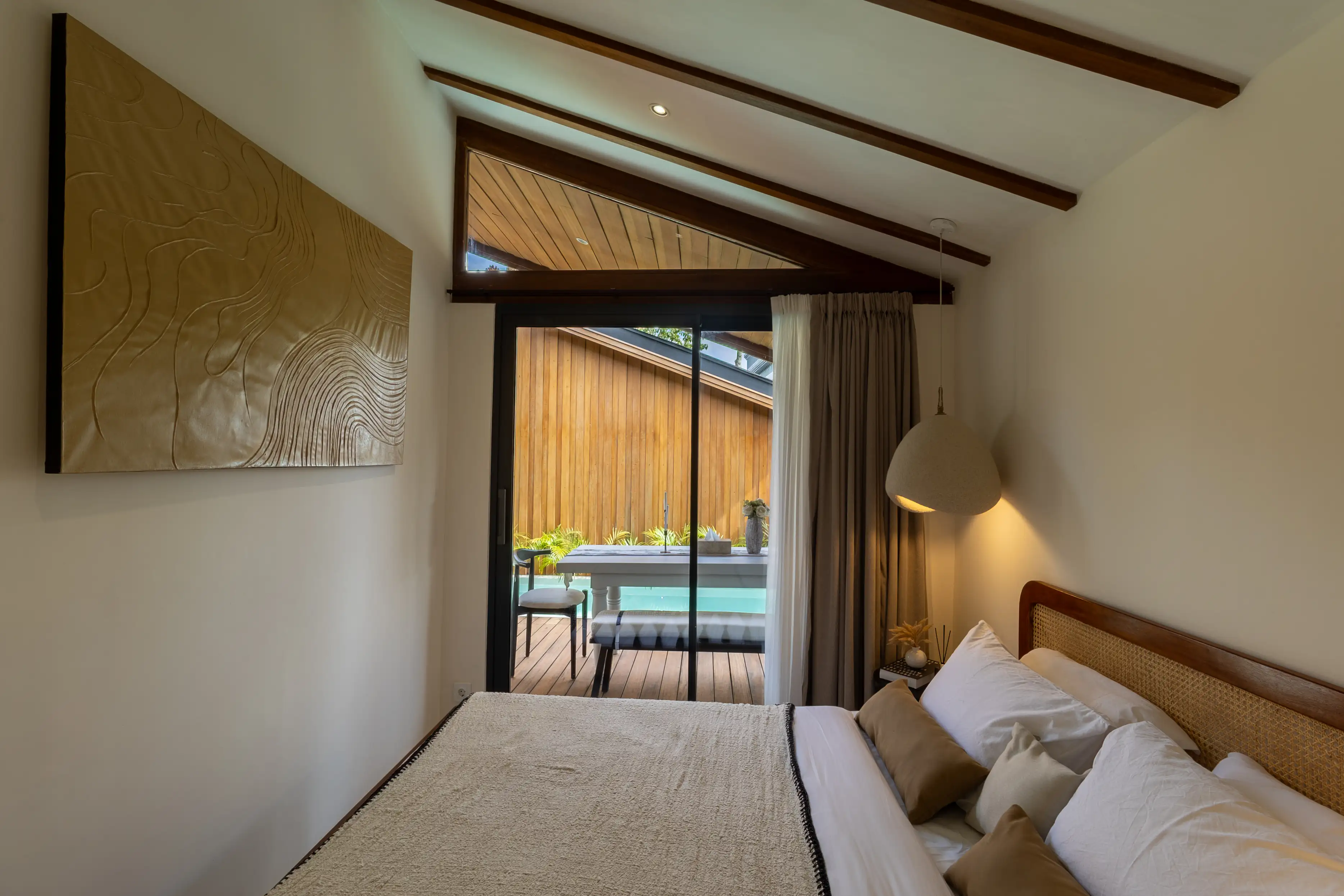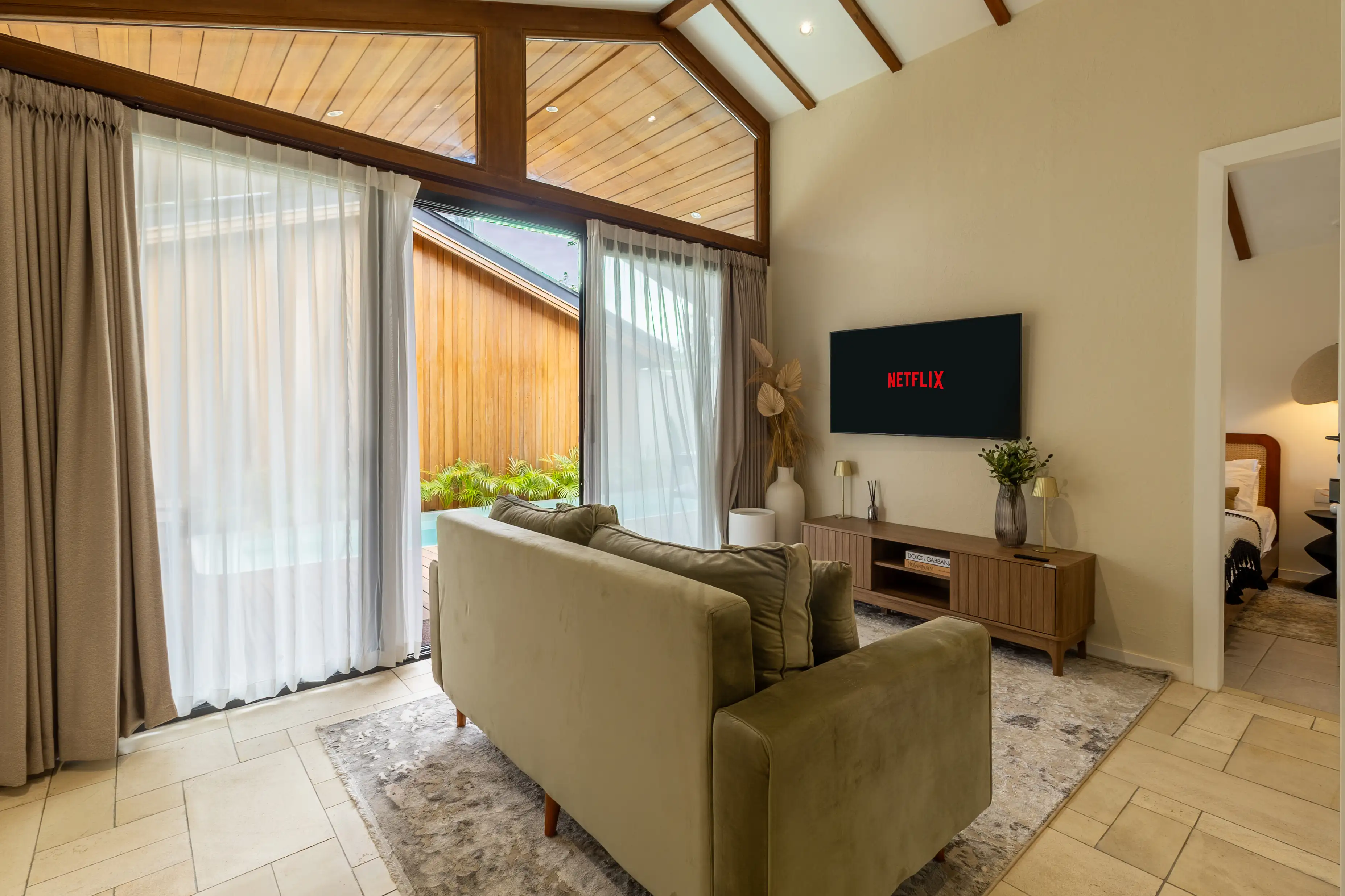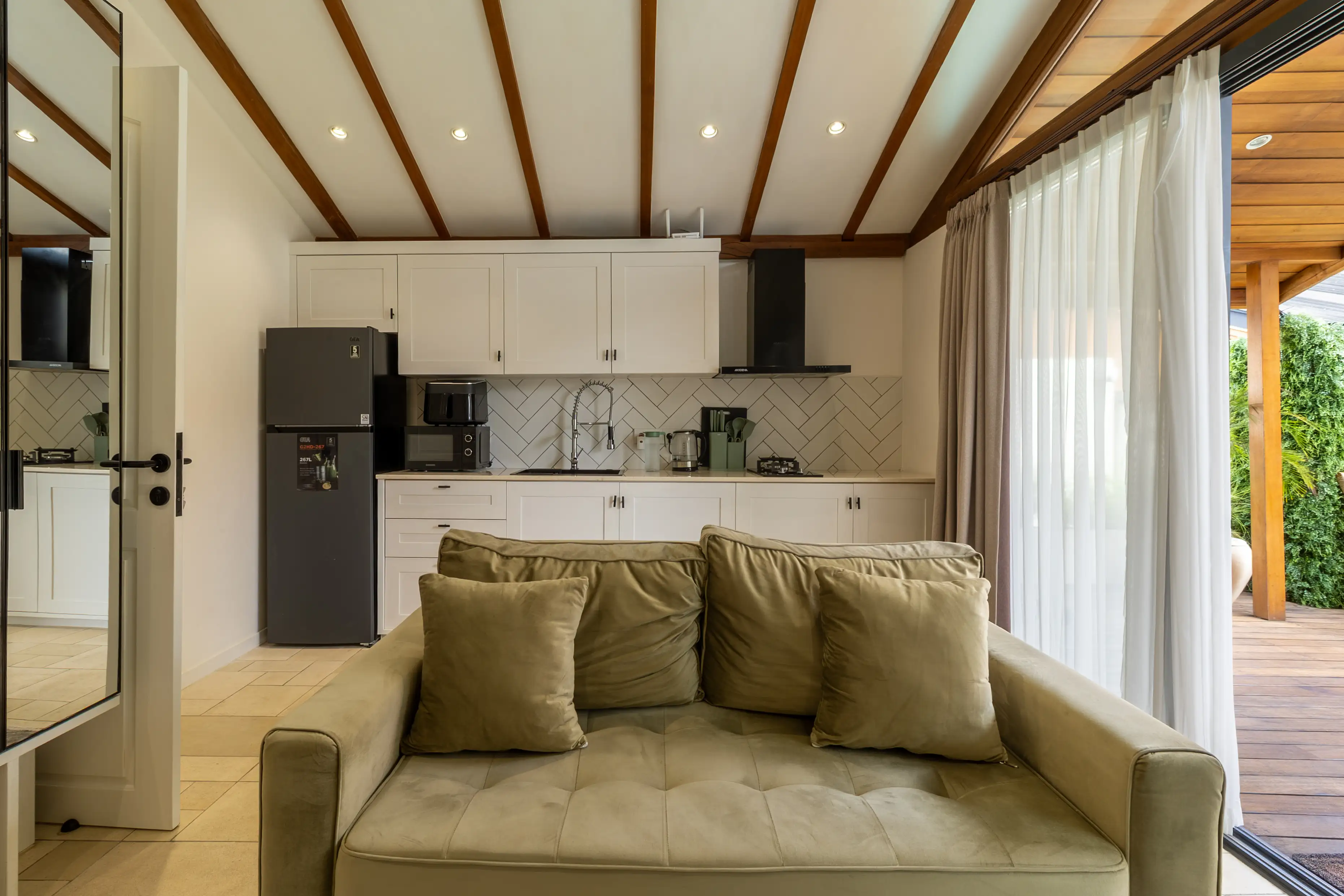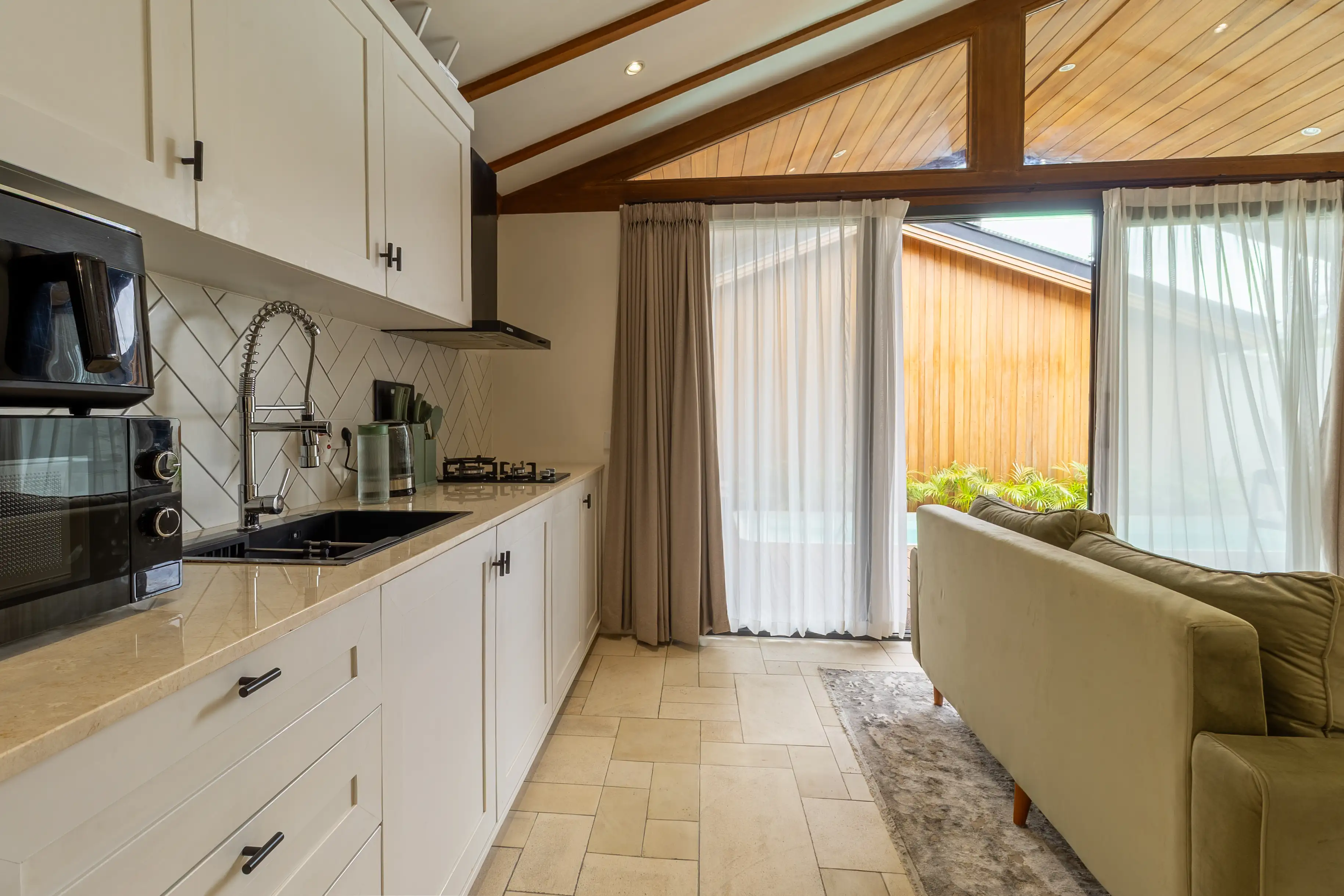 This thoughtfully designed 2-bedroom villa in Ungasan offers a comfortable blend of style, convenience, and investment potential. Set on 109 sqm of land, the home features a warm interior palette, high ceilings with exposed wooden beams, and large glass doors that bring in natural light. The enclosed living room flows into a fully equipped kitchen, showcasing clean cabinetry, quality appliances, and a functional layout suited for both short stays and long-term living. Its modern finishes, calming tones, and curated décor create an inviting atmosphere that appeals to couples, small families, or digital nomads seeking a private retreat in one of Bali’s fastest-growing residential areas