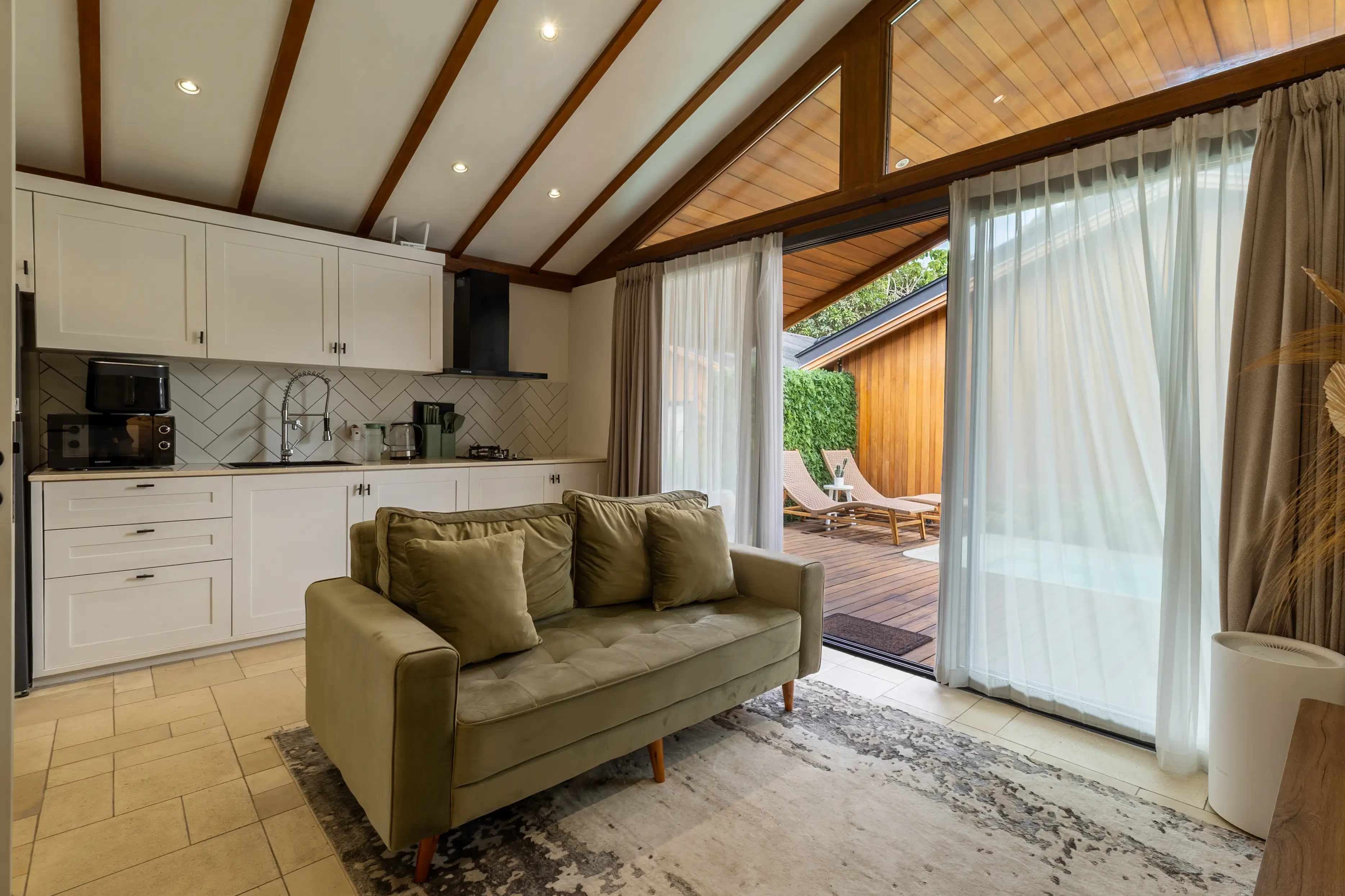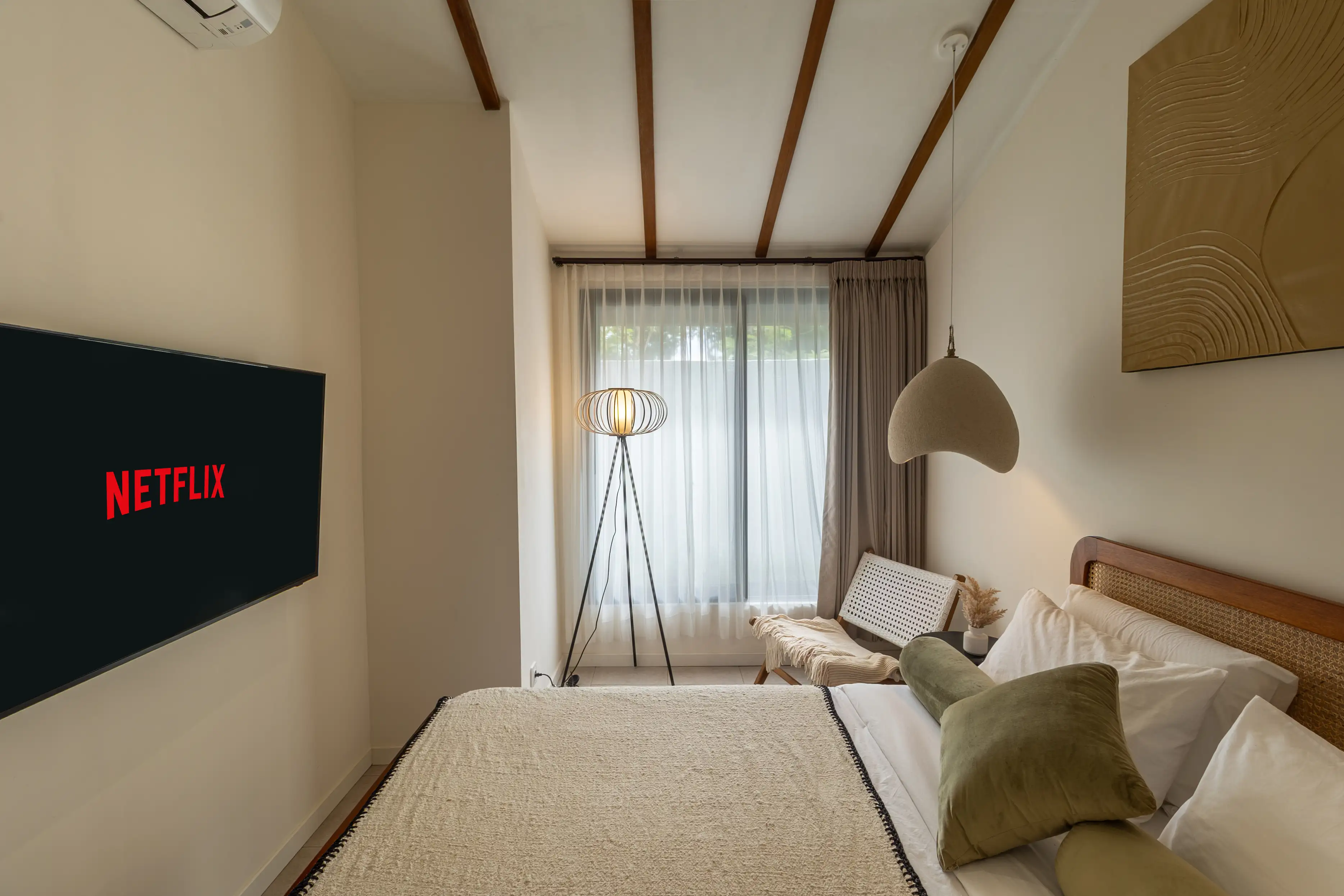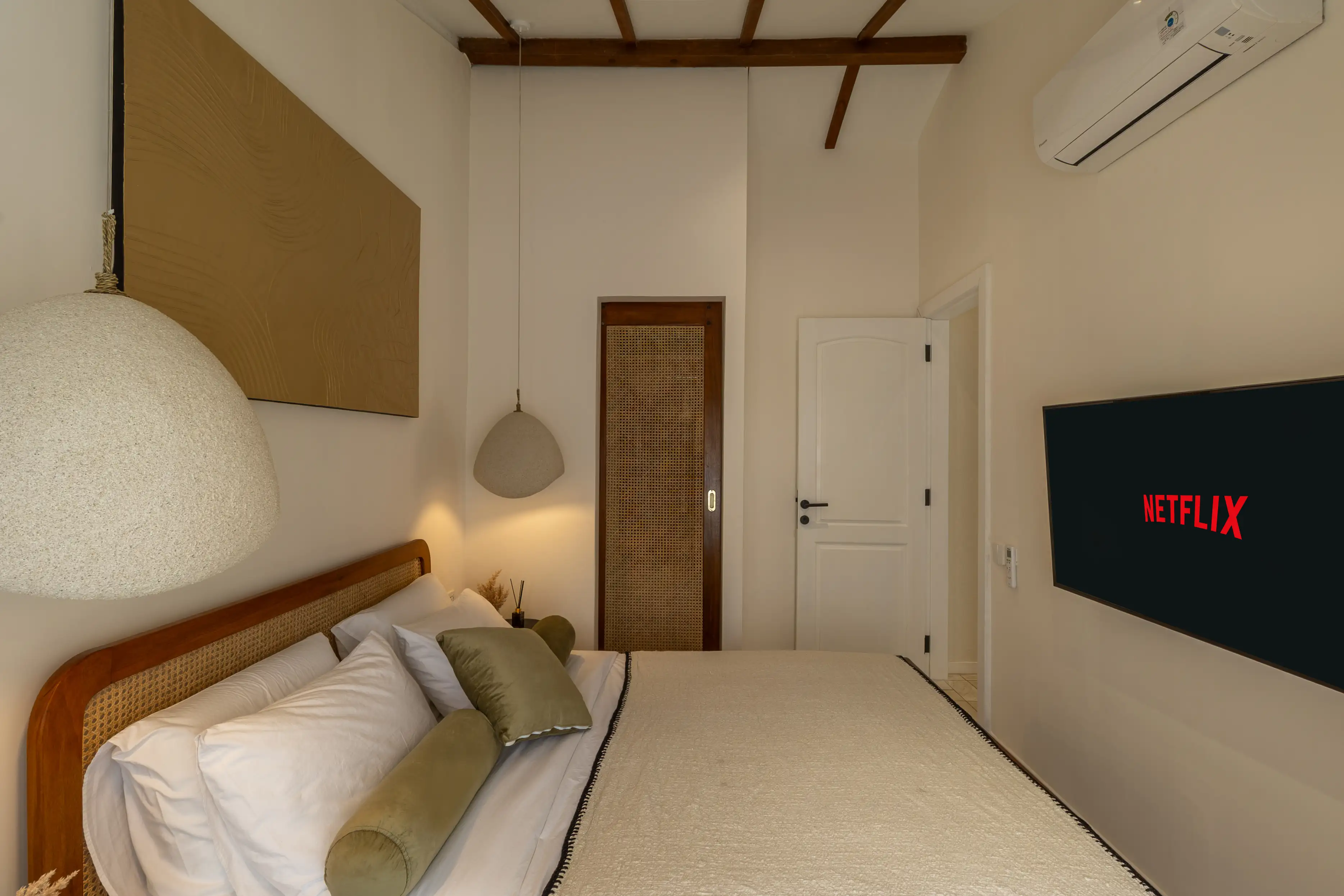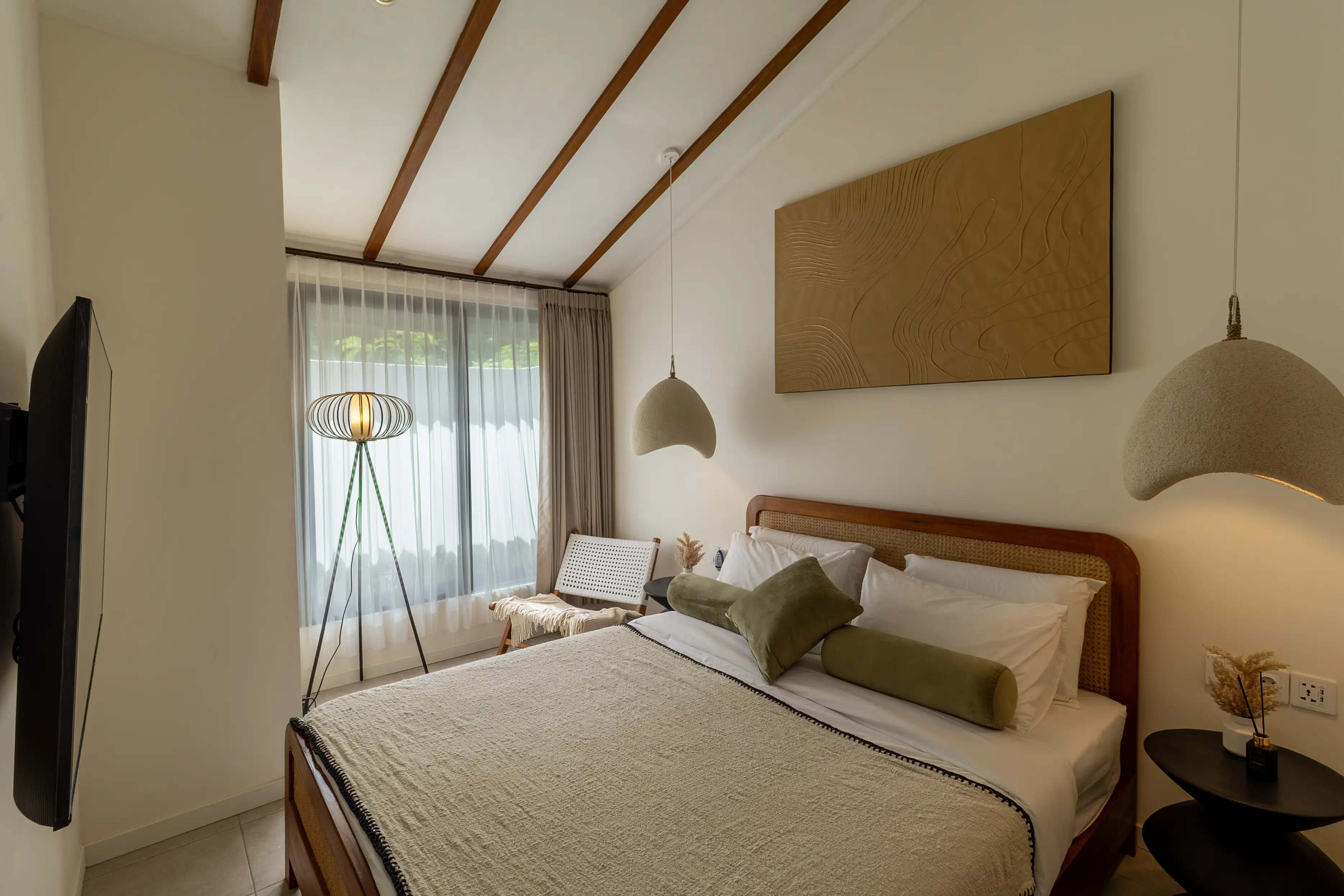 This thoughtfully designed 2-bedroom villa in Ungasan offers a comfortable blend of style, convenience, and investment potential. Set on 109 sqm of land, the home features a warm interior palette, high ceilings with exposed wooden beams, and large glass doors that bring in natural light. The enclosed living room flows into a fully equipped kitchen, showcasing clean cabinetry, quality appliances, and a functional layout suited for both short stays and long-term living. Its modern finishes, calming tones, and curated décor create an inviting atmosphere that appeals to couples, small families, or digital nomads seeking a private retreat in one of Bali’s fastest-growing residential areas