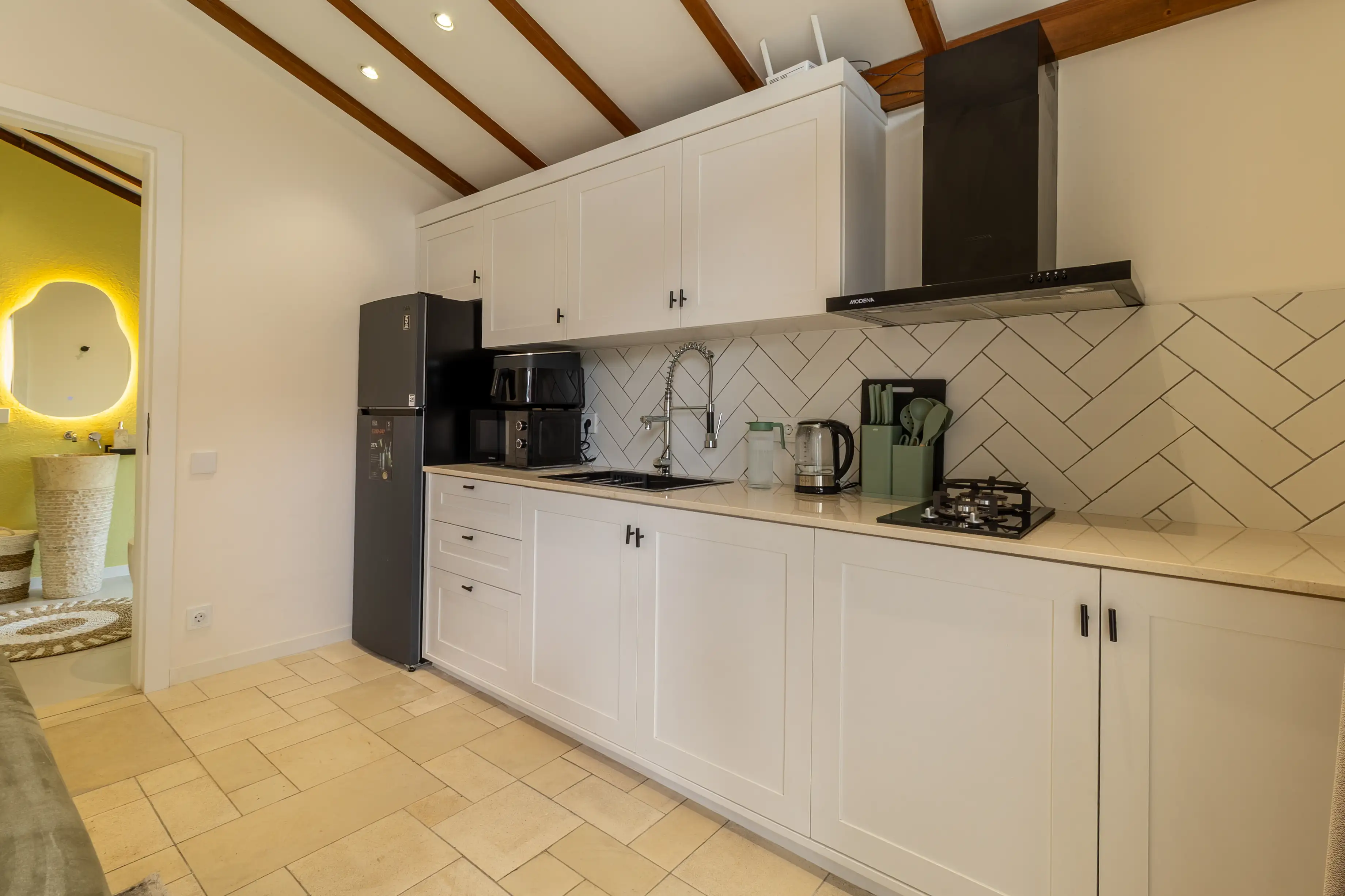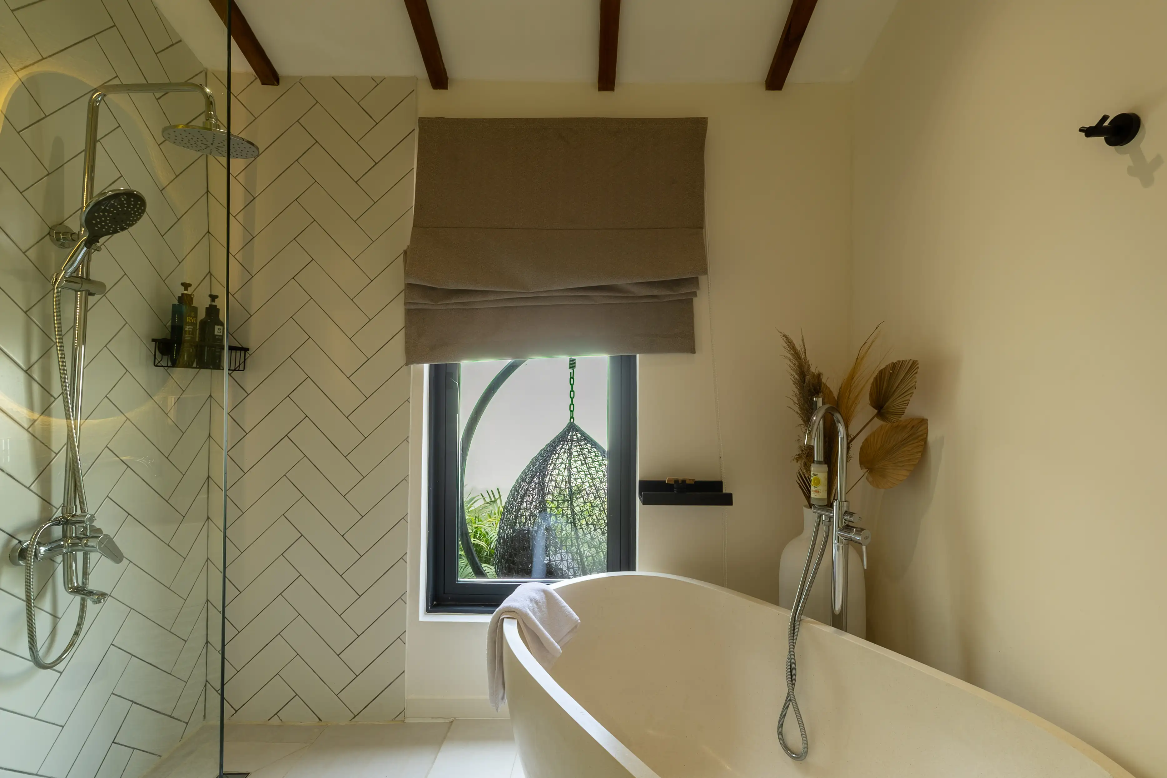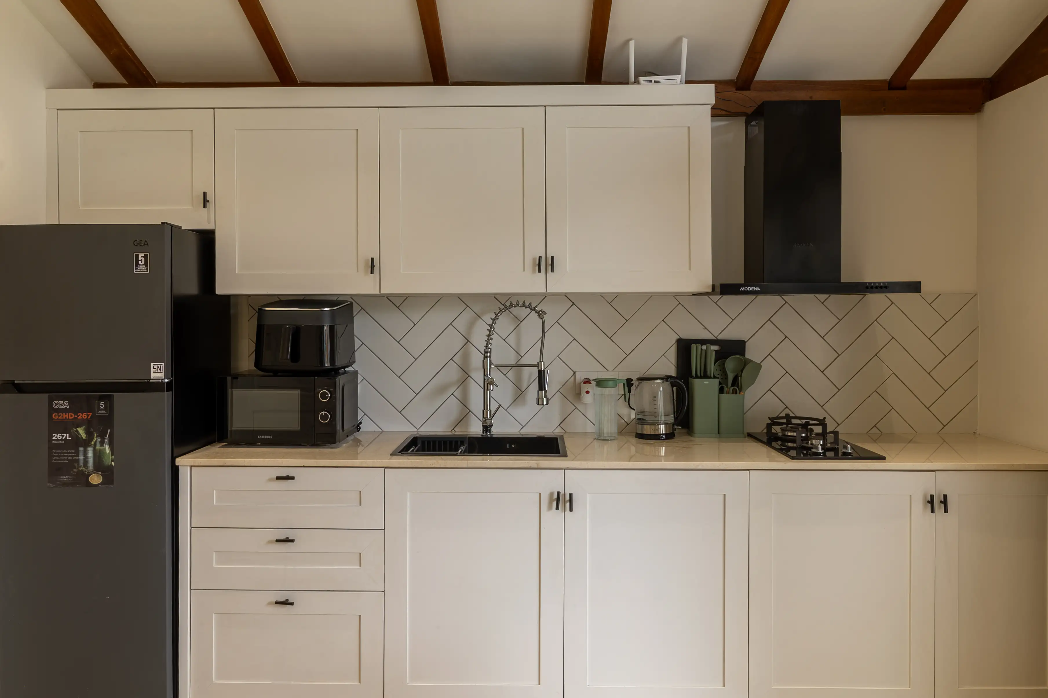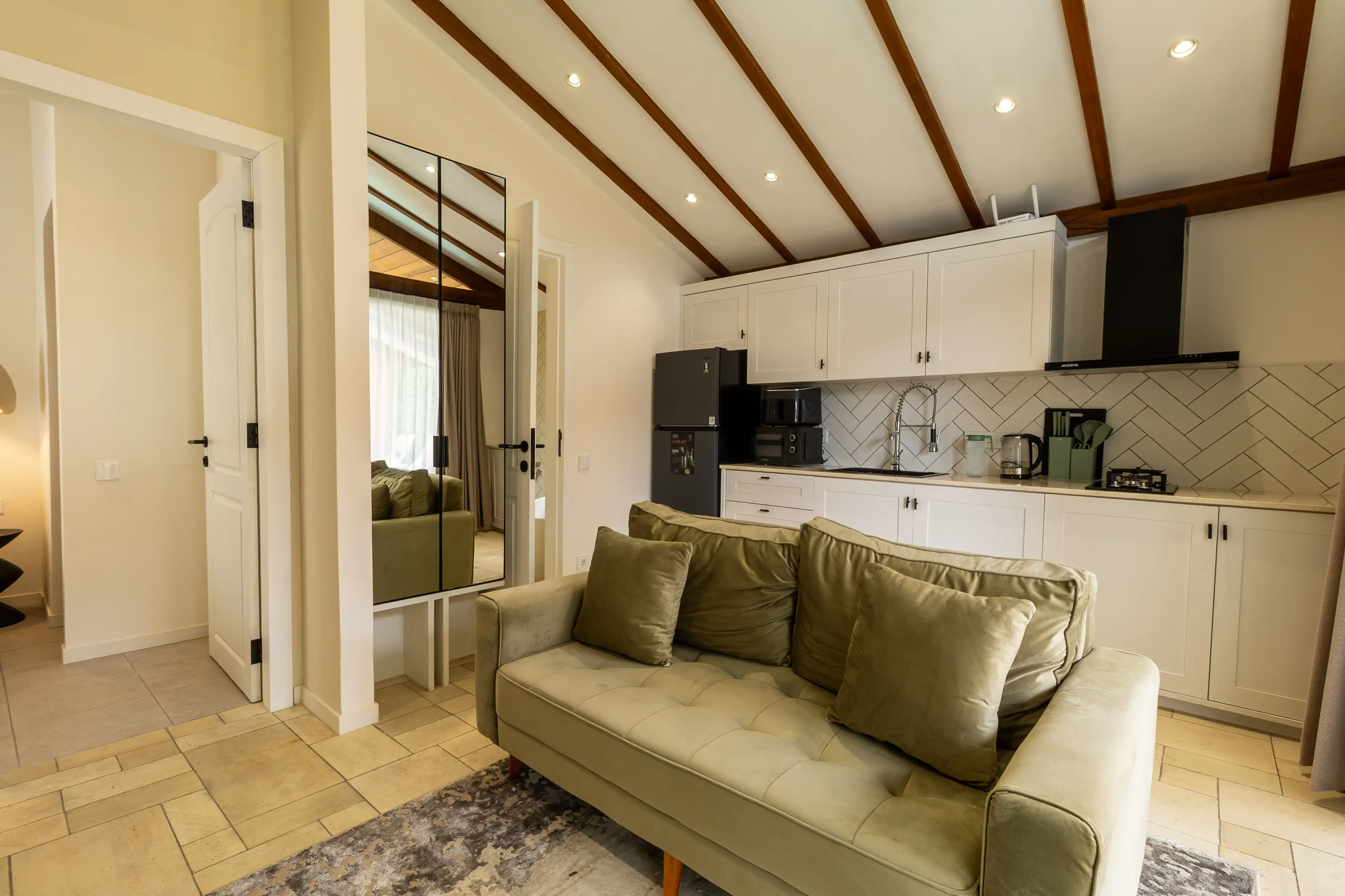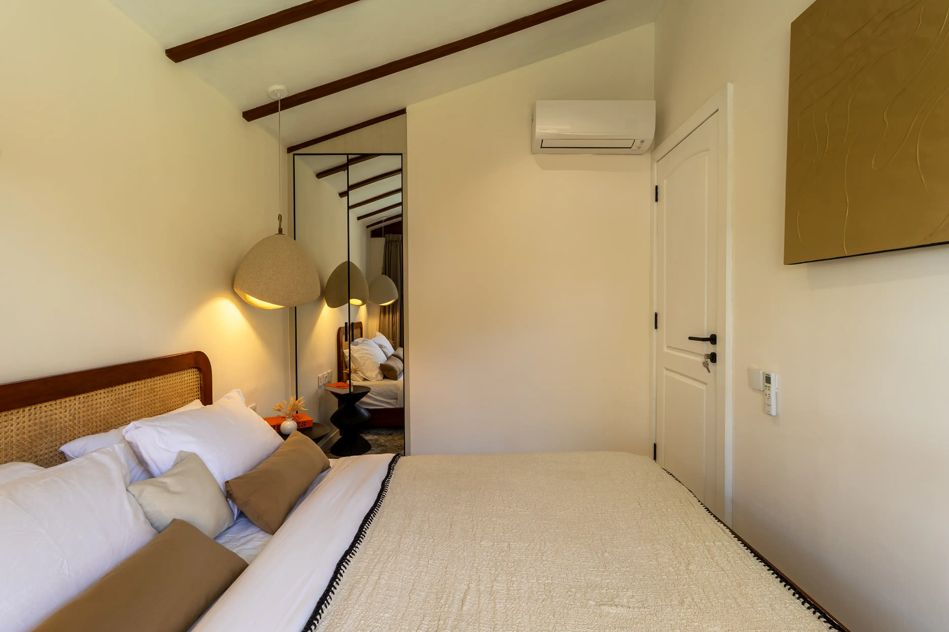 This thoughtfully designed 2-bedroom villa in Ungasan offers a comfortable blend of style, convenience, and investment potential. Set on 109 sqm of land, the home features a warm interior palette, high ceilings with exposed wooden beams, and large glass doors that bring in natural light. The enclosed living room flows into a fully equipped kitchen, showcasing clean cabinetry, quality appliances, and a functional layout suited for both short stays and long-term living. Its modern finishes, calming tones, and curated décor create an inviting atmosphere that appeals to couples, small families, or digital nomads seeking a private retreat in one of Bali’s fastest-growing residential areas