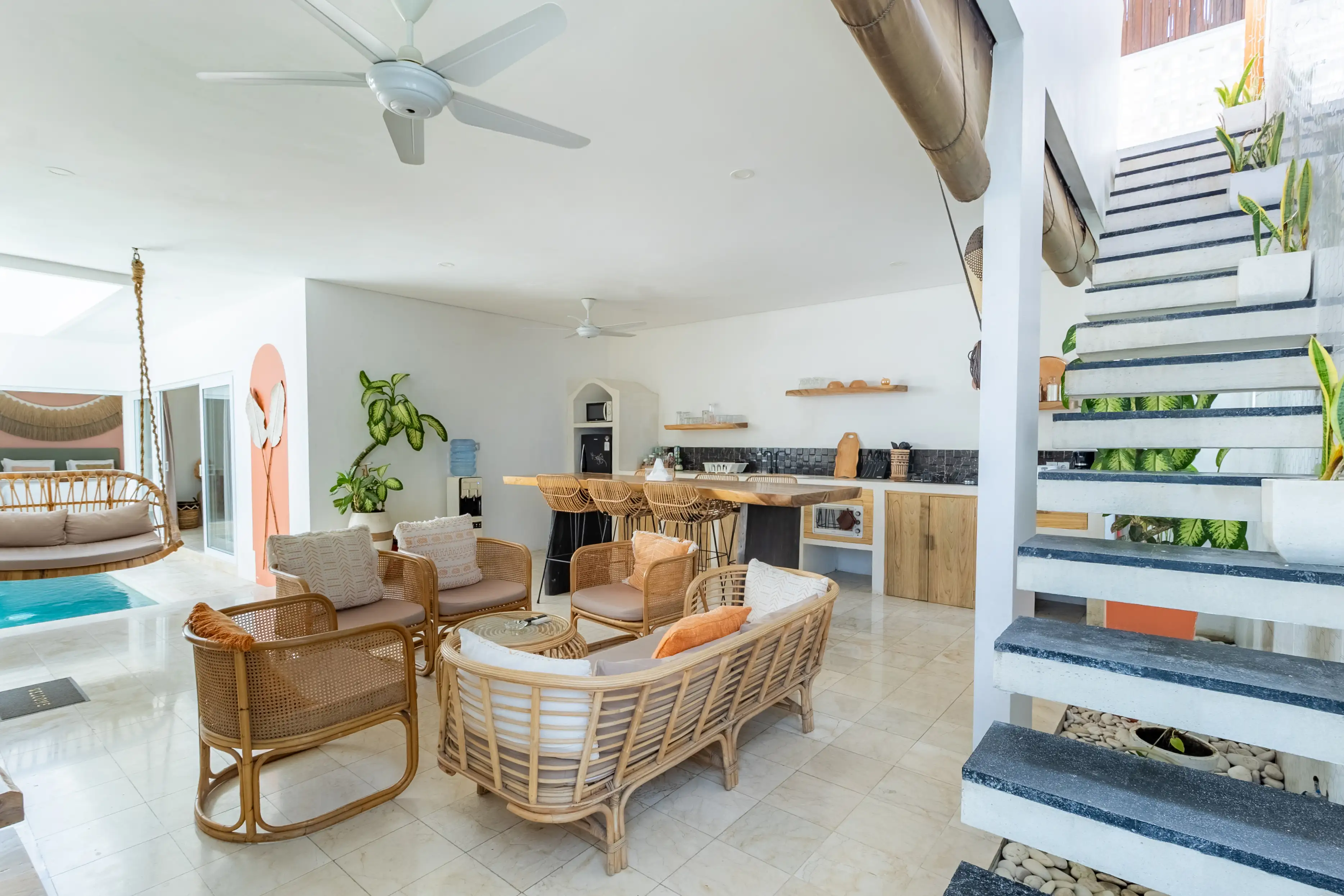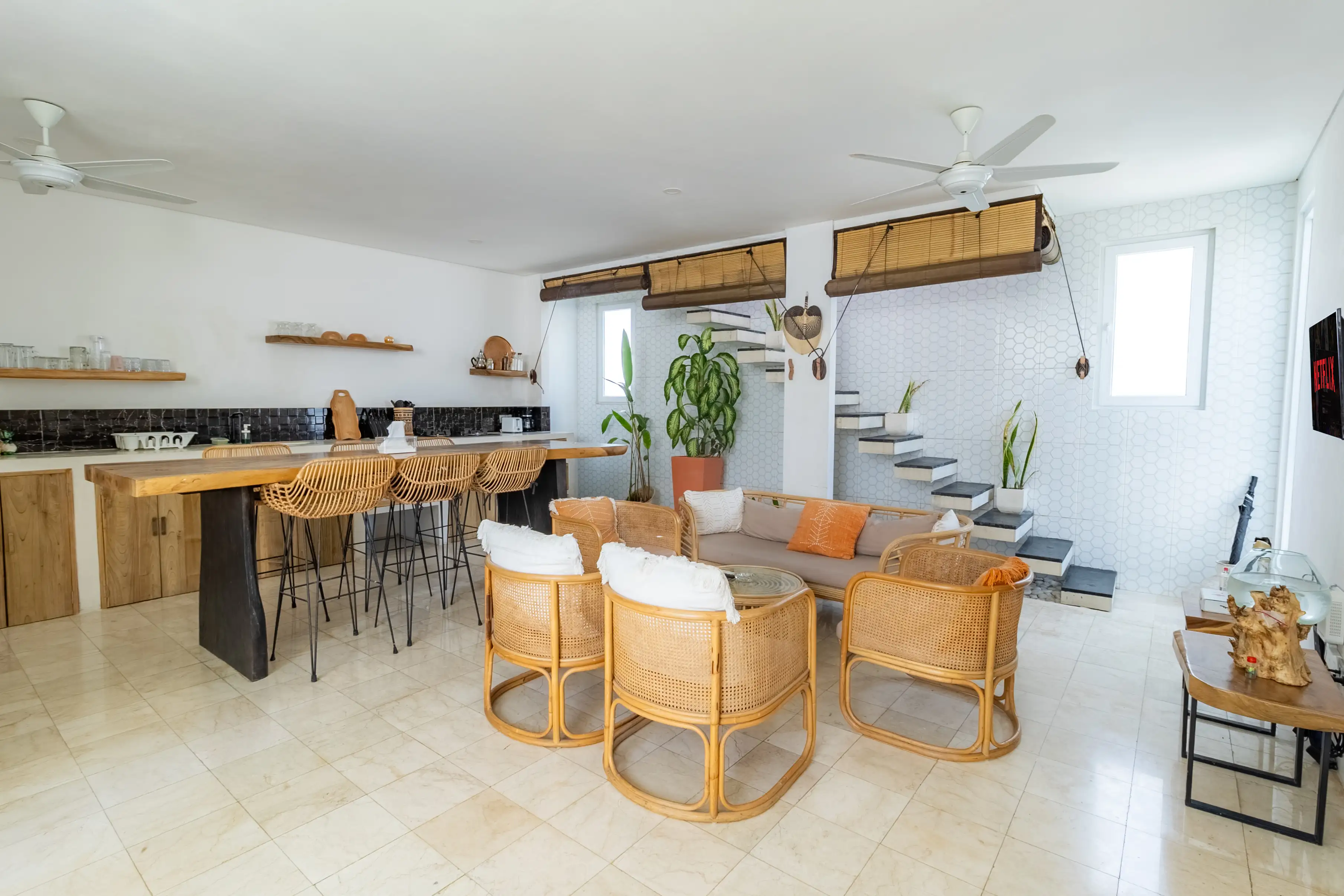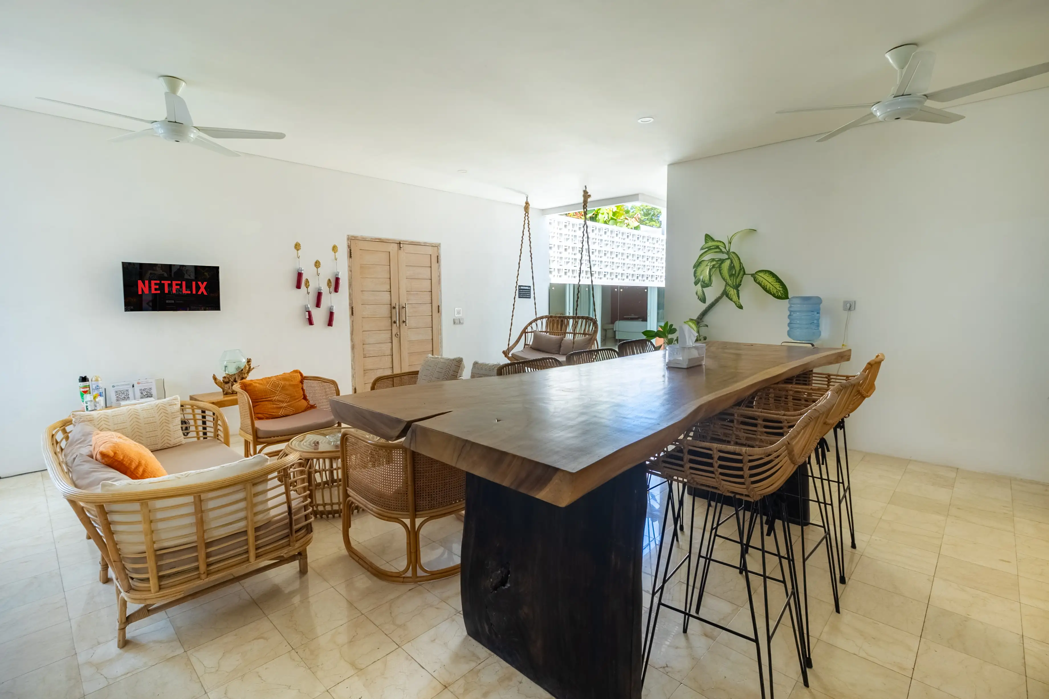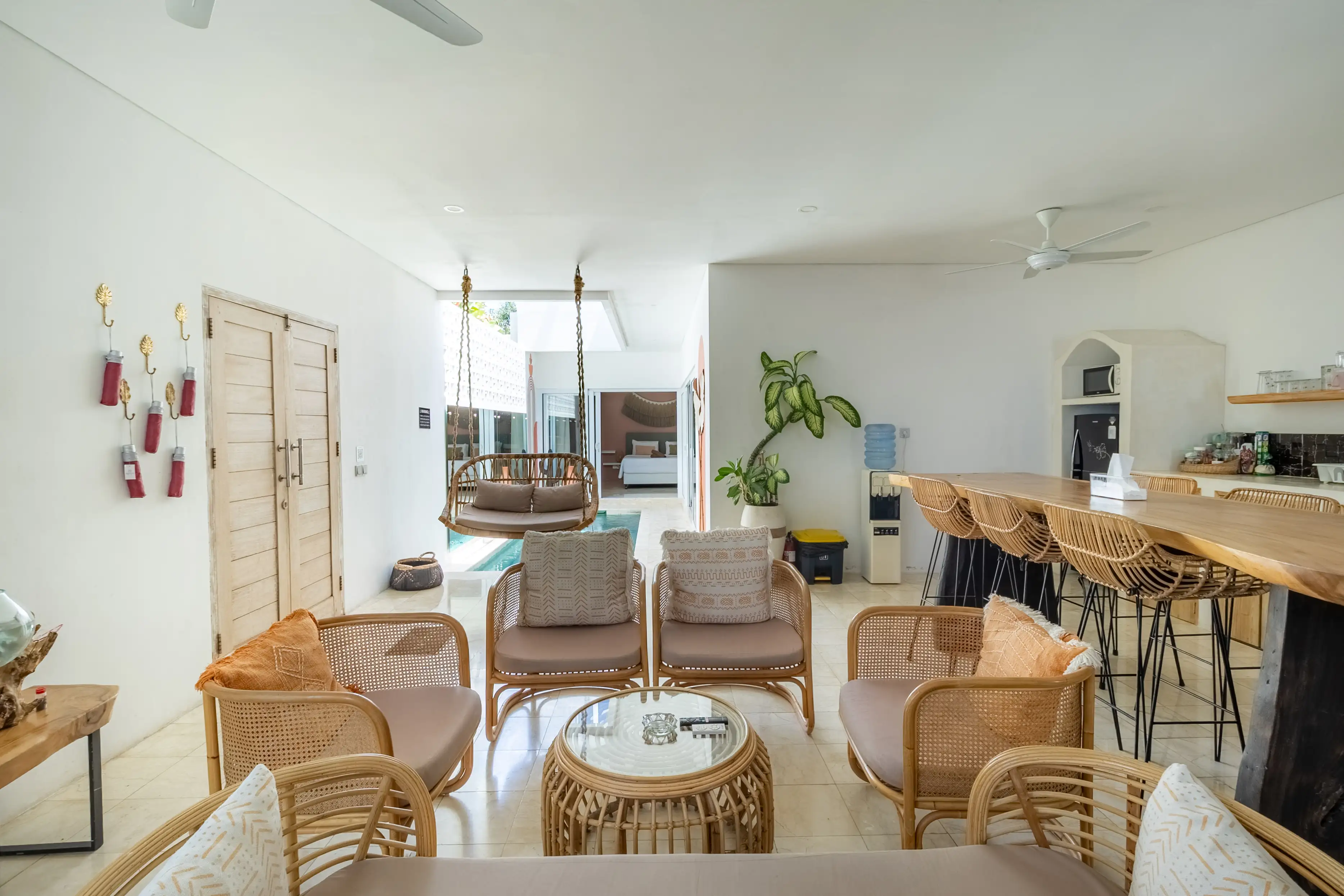 Featuring three spacious bedrooms and three modern bathrooms, the home provides ample space for families or groups. A large private balcony becomes the centerpiece—perfect for social gatherings or simply enjoying Bali’s famous sunsets. The villa’s tropical modern aesthetic is echoed throughout the enclosed living spaces, combining natural textures with clean lines for a refreshing ambiance.