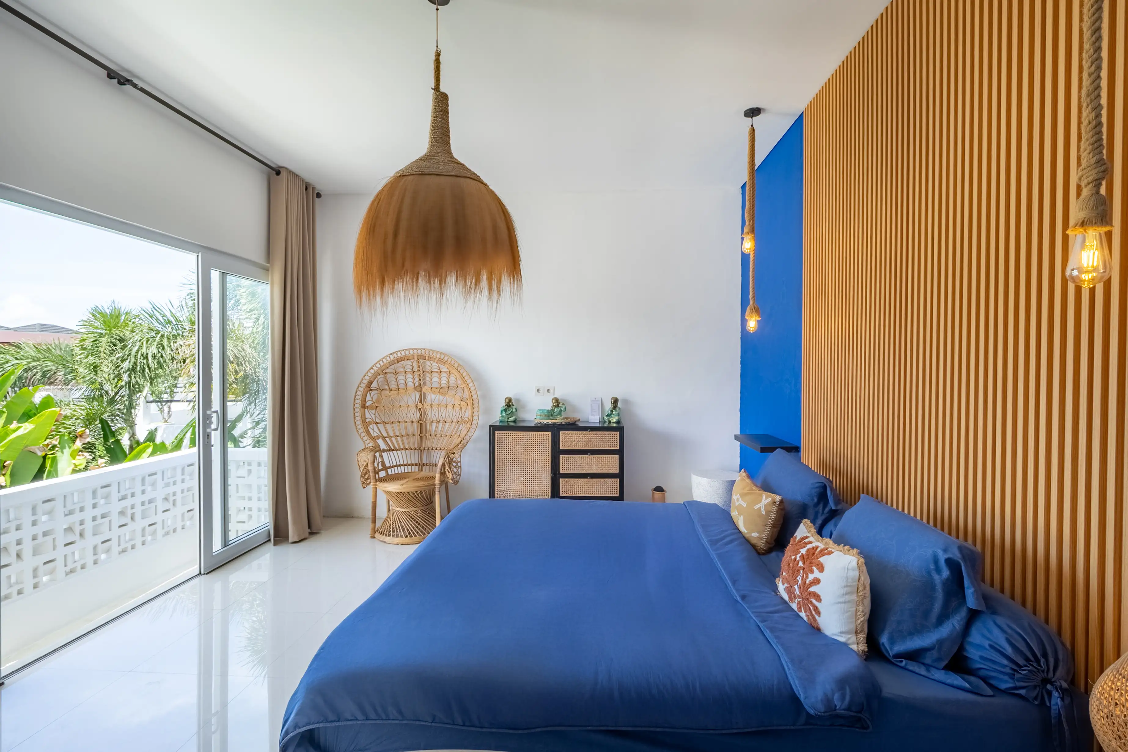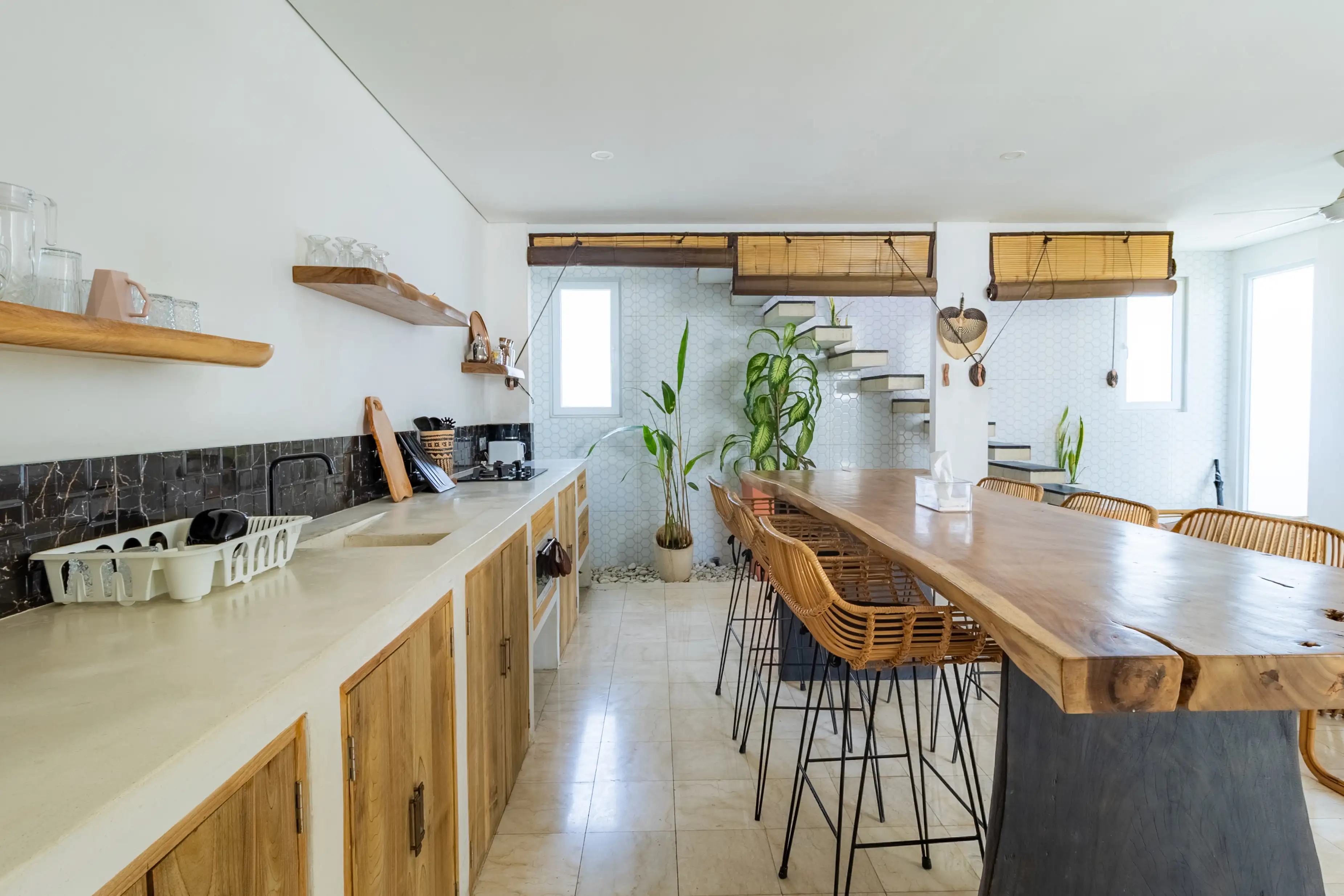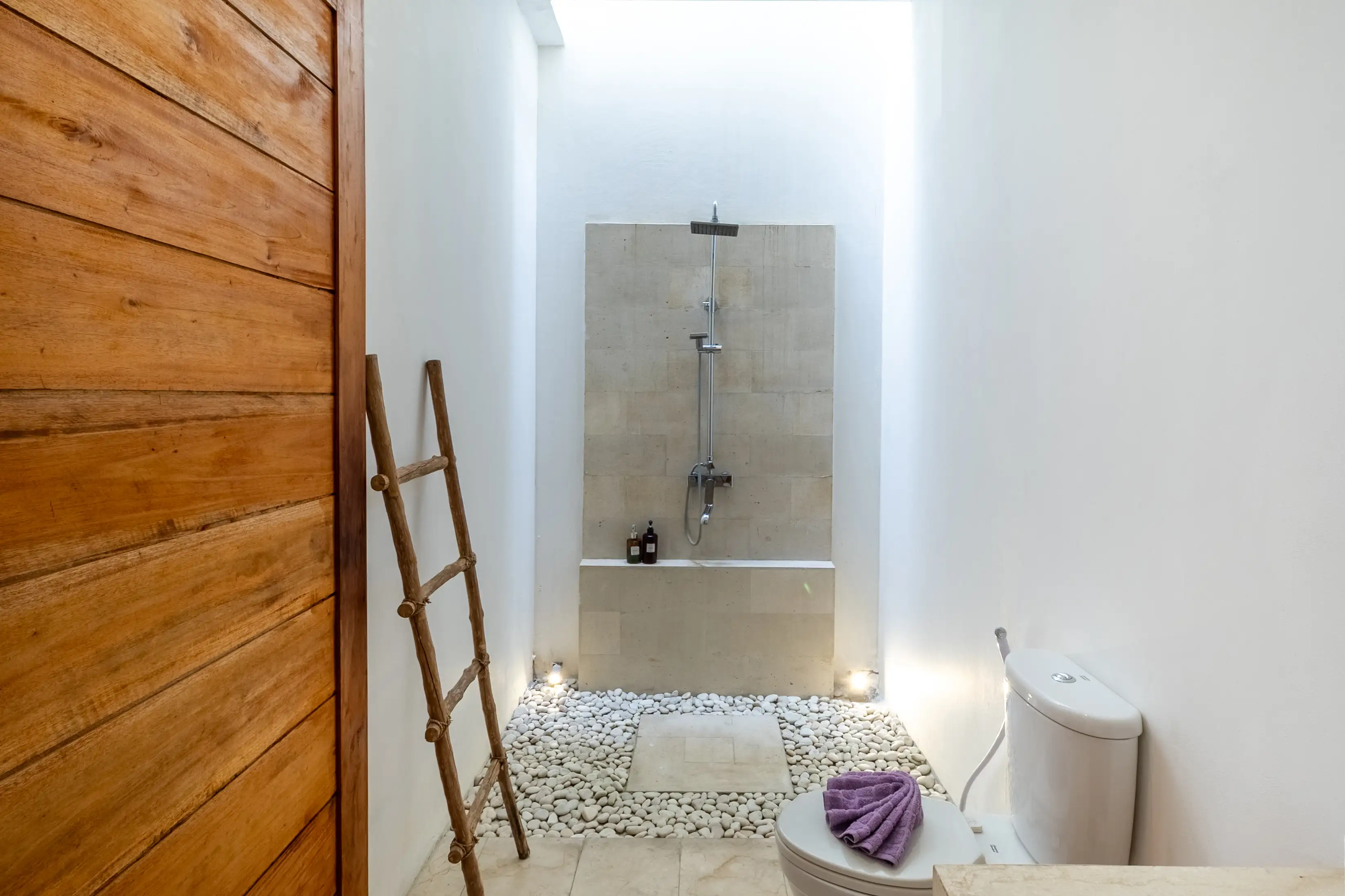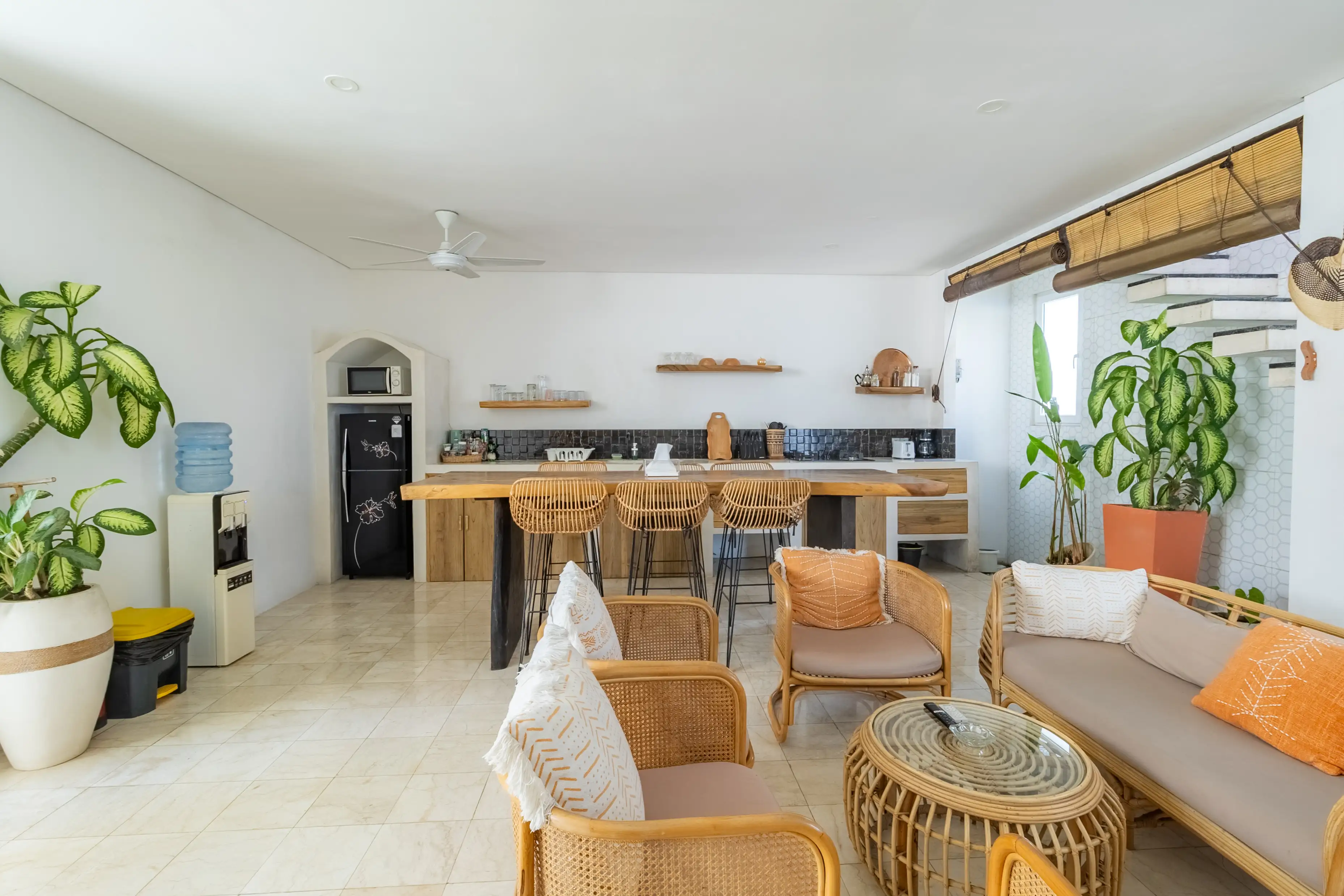 Featuring three spacious bedrooms and three modern bathrooms, the home provides ample space for families or groups. A large private balcony becomes the centerpiece—perfect for social gatherings or simply enjoying Bali’s famous sunsets. The villa’s tropical modern aesthetic is echoed throughout the enclosed living spaces, combining natural textures with clean lines for a refreshing ambiance.