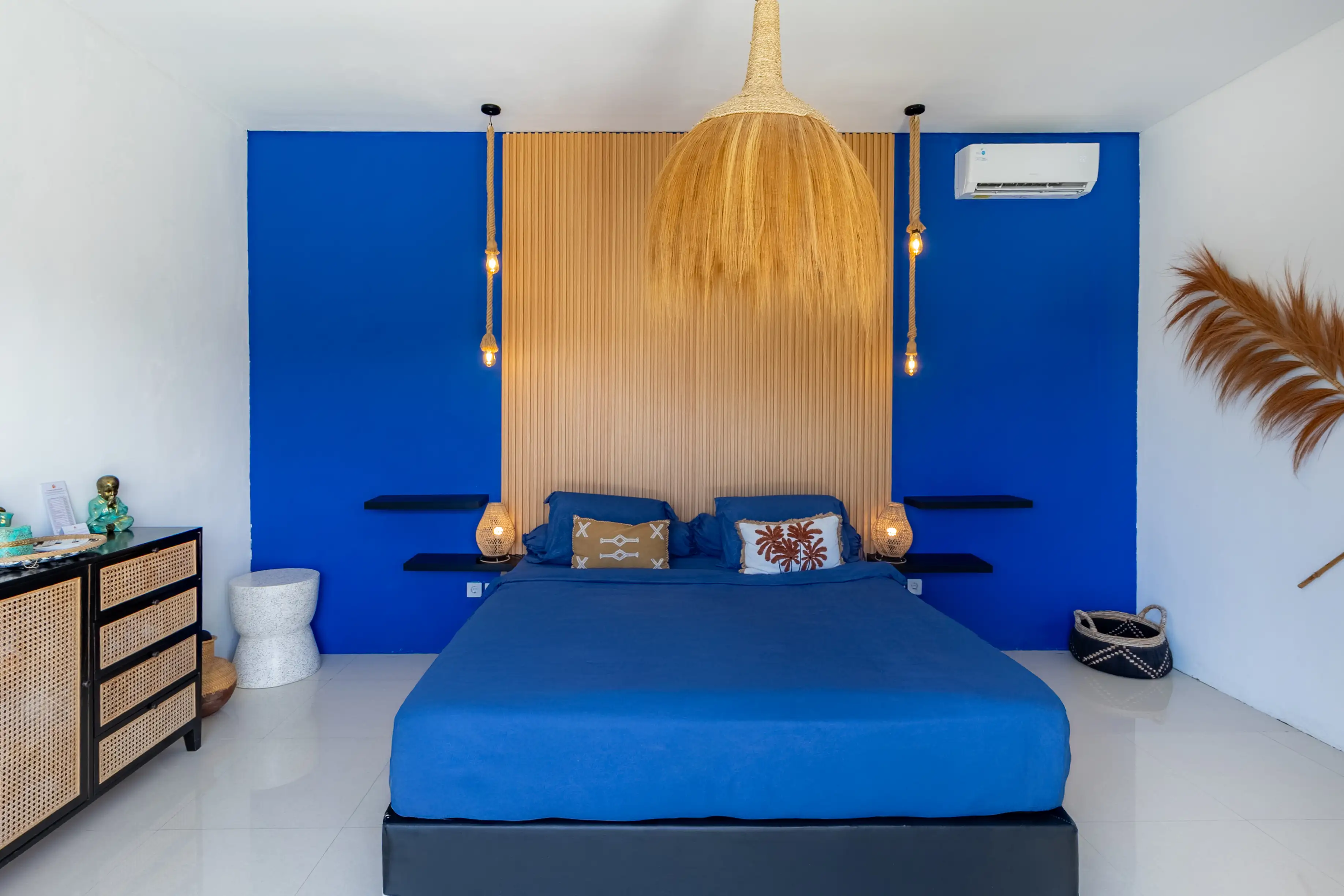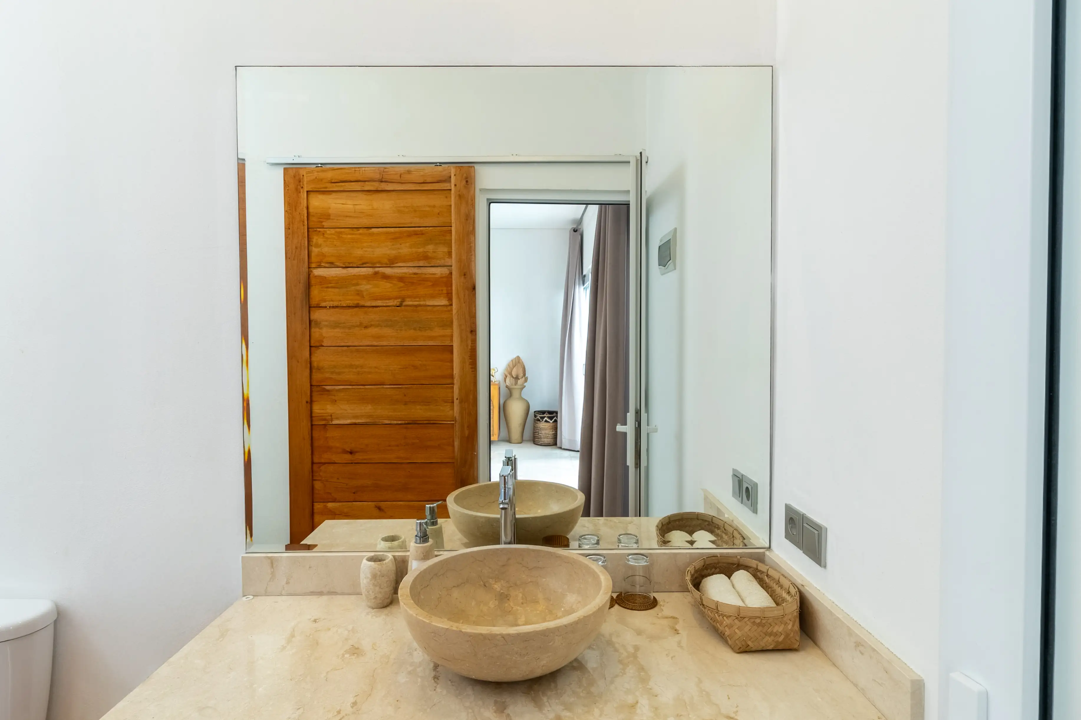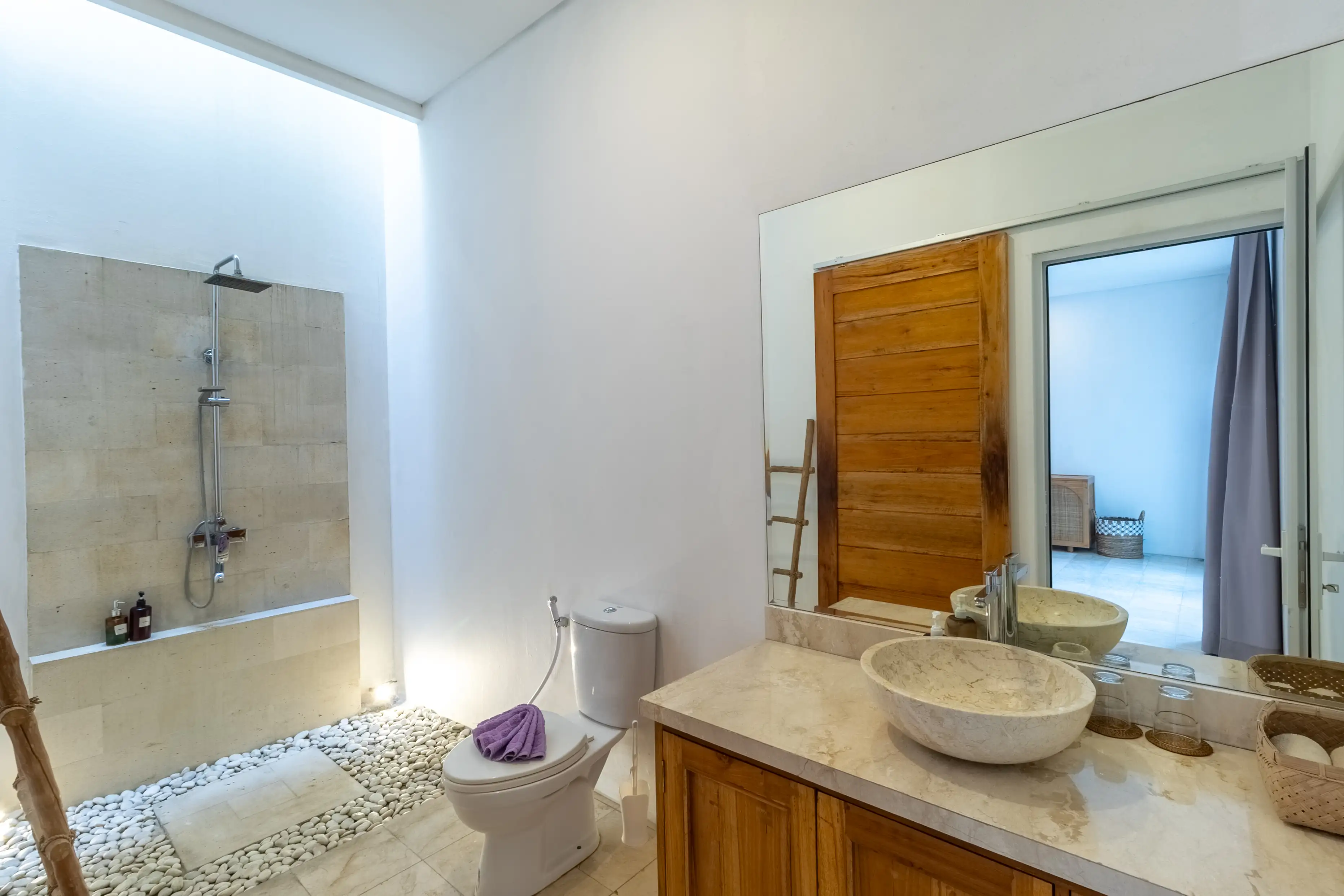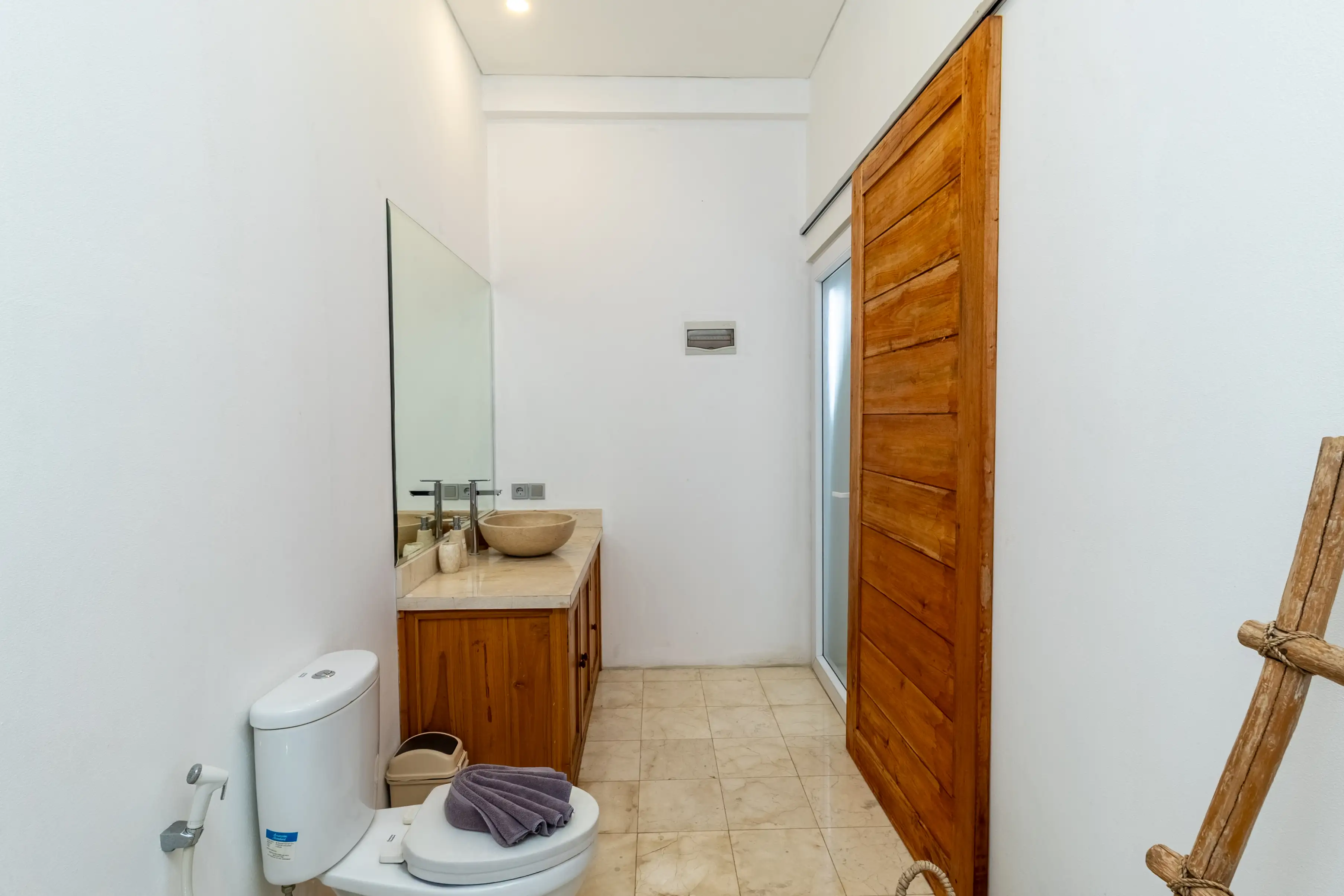 Featuring three spacious bedrooms and three modern bathrooms, the home provides ample space for families or groups. A large private balcony becomes the centerpiece—perfect for social gatherings or simply enjoying Bali’s famous sunsets. The villa’s tropical modern aesthetic is echoed throughout the enclosed living spaces, combining natural textures with clean lines for a refreshing ambiance.