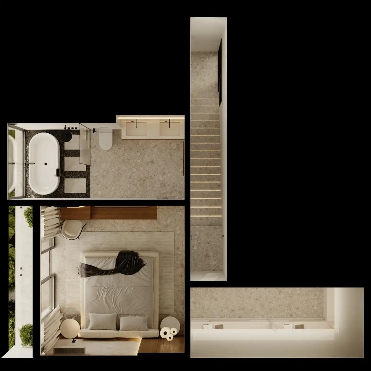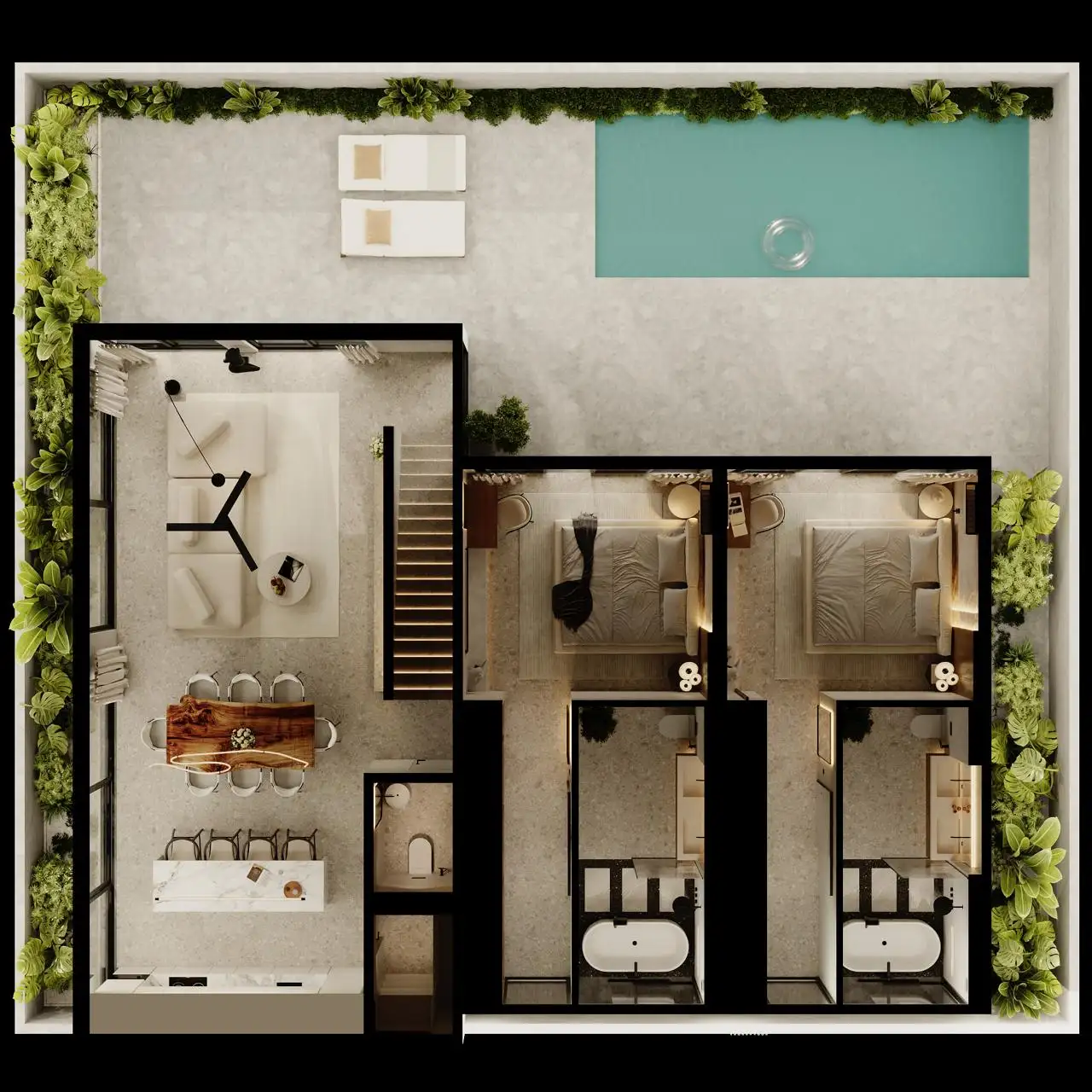 The project presents two thoughtfully designed villa experiences within the same complex. All units share the same architectural language and quality standards, while selected units feature an additional private sauna area that enhances the sense of relaxation and wellness. This provides flexibility for owners and investors—whether prioritizing efficient space and simplicity, or seeking a more wellness-oriented living experience—without compromising on overall quality or design consistency.